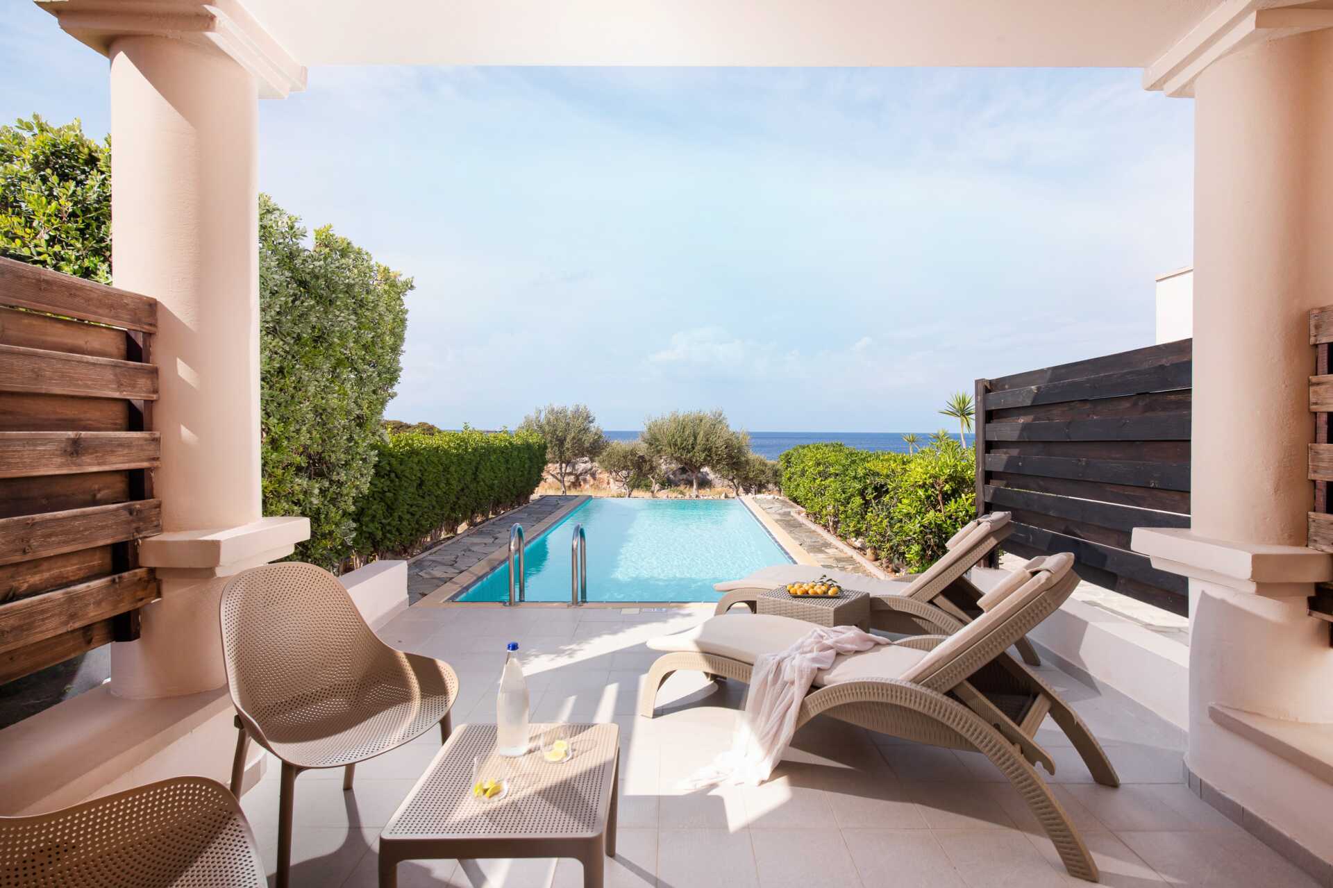 Junior-suite med privat pool og havudsigt fra udepladsen, som også har to solstole og to lænestole. To enkeltsenge. Mulighed for ekstra opredninger i sovesofa. Gratis wifi, aircondition og deponering. Køleskab. El-kedel samt kaffe/te. Nespresso-maskine. Tv med internationale kanaler. Hårtørrer. Badeværelse med jacuzzi, bruser og toilet. Rengøring 7 gange om ugen.
