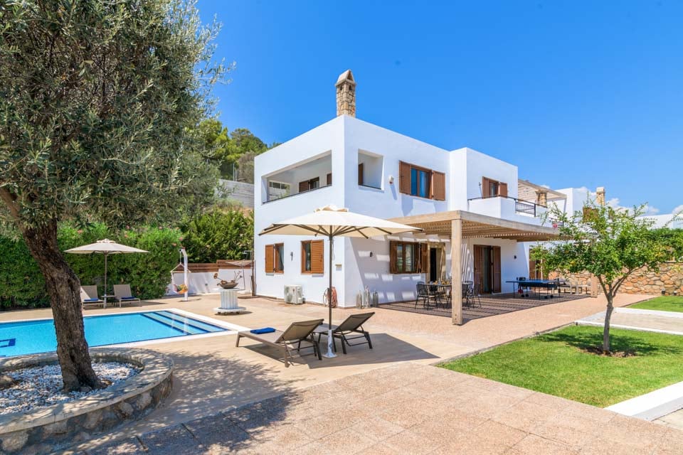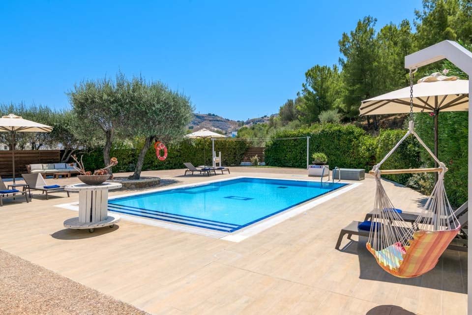 Om natten forvandles villaen, når poolen lyser op i en strålende turkis farve, og villaens uplights reflekteres i de hvidkalkede vægge. Nyd en cocktail under stjernerne, eller hvis du kan lide at udforske, ligger Vlycha-bugten kun fem minutters gang væk med stranden og familiedrevne restauranter, barer og et minimarked. Hvis du vil længere væk, ligger den smukke landsby Lindos i nærheden med et udvalg af strande, vandsportsaktiviteter og livlige barer og caféer.