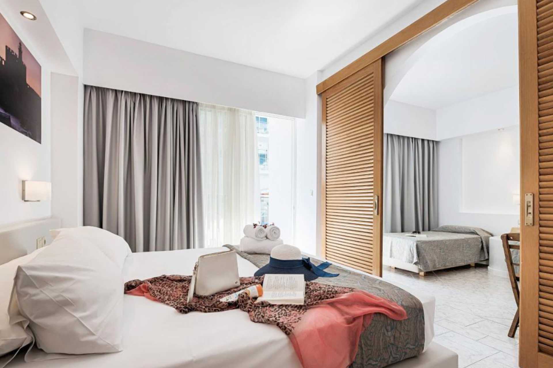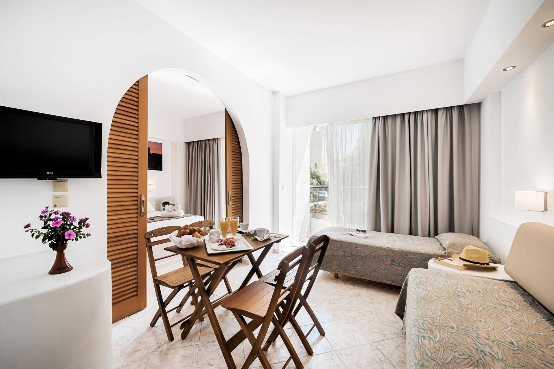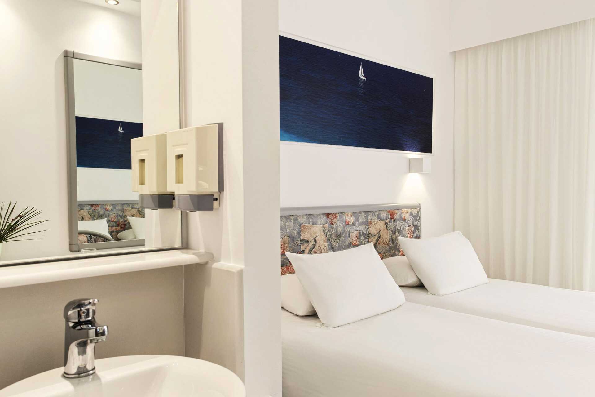 Dobbeltværelse med balkon. To enkeltsenge. Mulighed for ekstra opredning i enkeltseng. Gratis wifi og deponering. Aircondition er inkluderet fra juni til september. Køleskab. Tv med internationale kanaler. Hårtørrer. Badeværelse med bruser og toilet. Rengøring 7 gange om ugen.