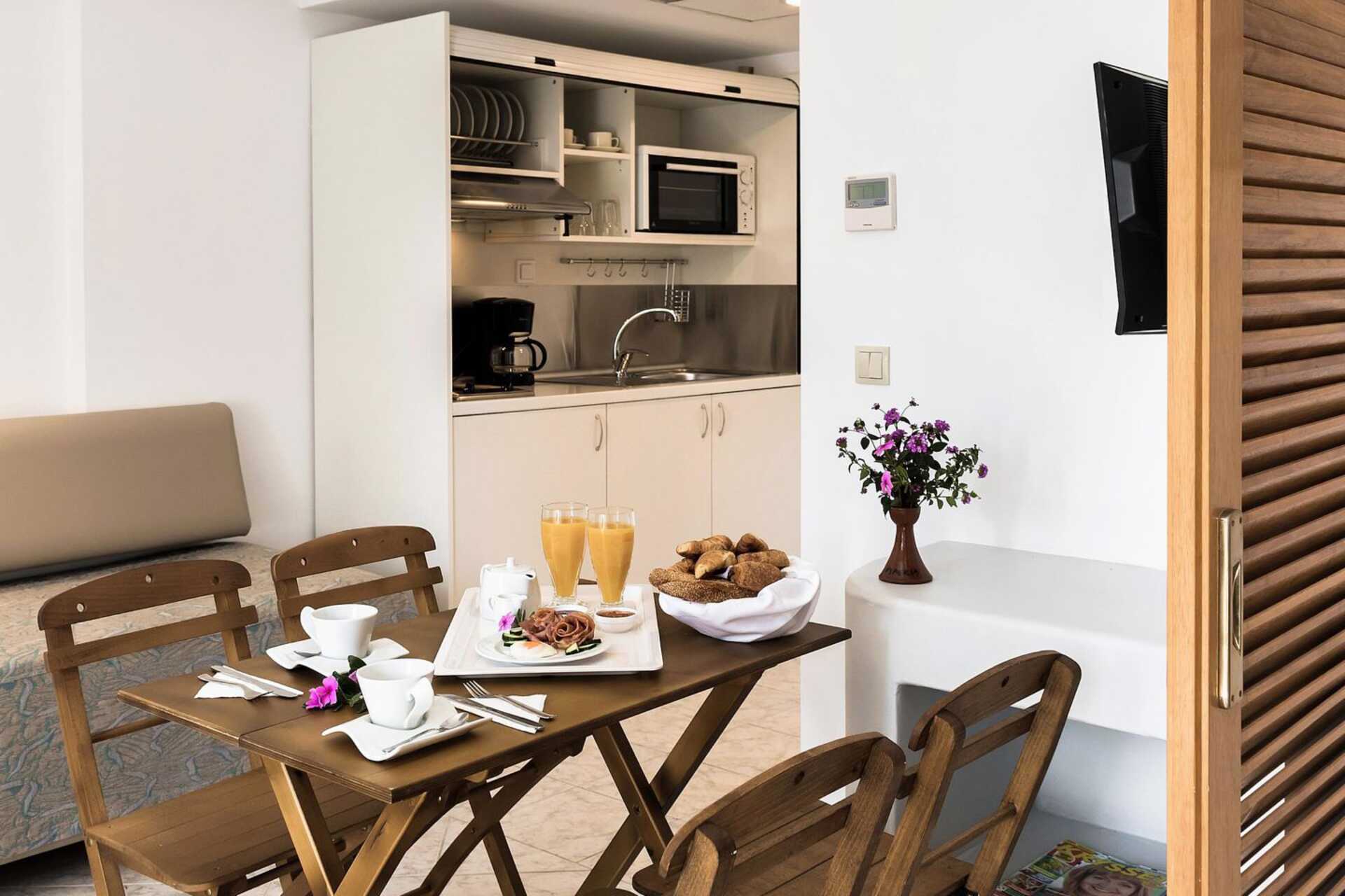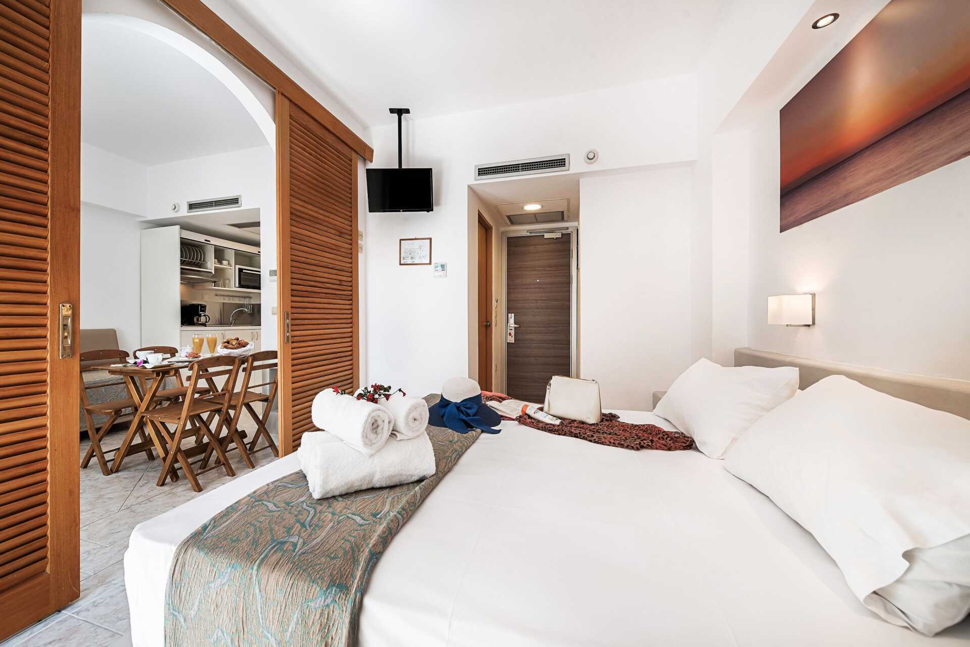 2-værelses lejlighed med balkon. Lejlighederne er indrettet i forskellige stilarter og farver. Soveværelse og kombineret opholdsrum med minikøkken. Værelserne er adskilt af skydedøre med lameller. En dobbeltseng. Mulighed for ekstra opredninger i dobbeltseng. Minikøkken med kogeplader, køleskab og enkelt køkkenudstyr. Gratis wifi og deponering. Aircondition indgår fra juni til september. Tv med internationale kanaler. Hårtørrer. Badeværelse med bruser og toilet. Rengøring 7 gange om ugen.