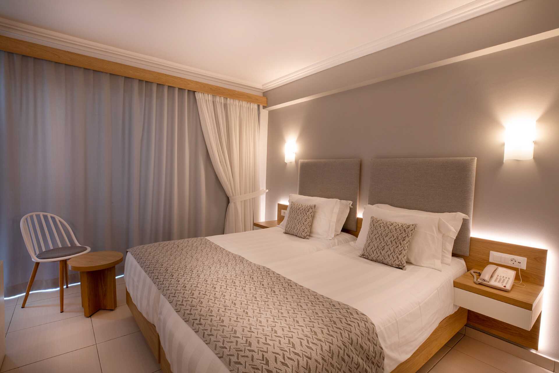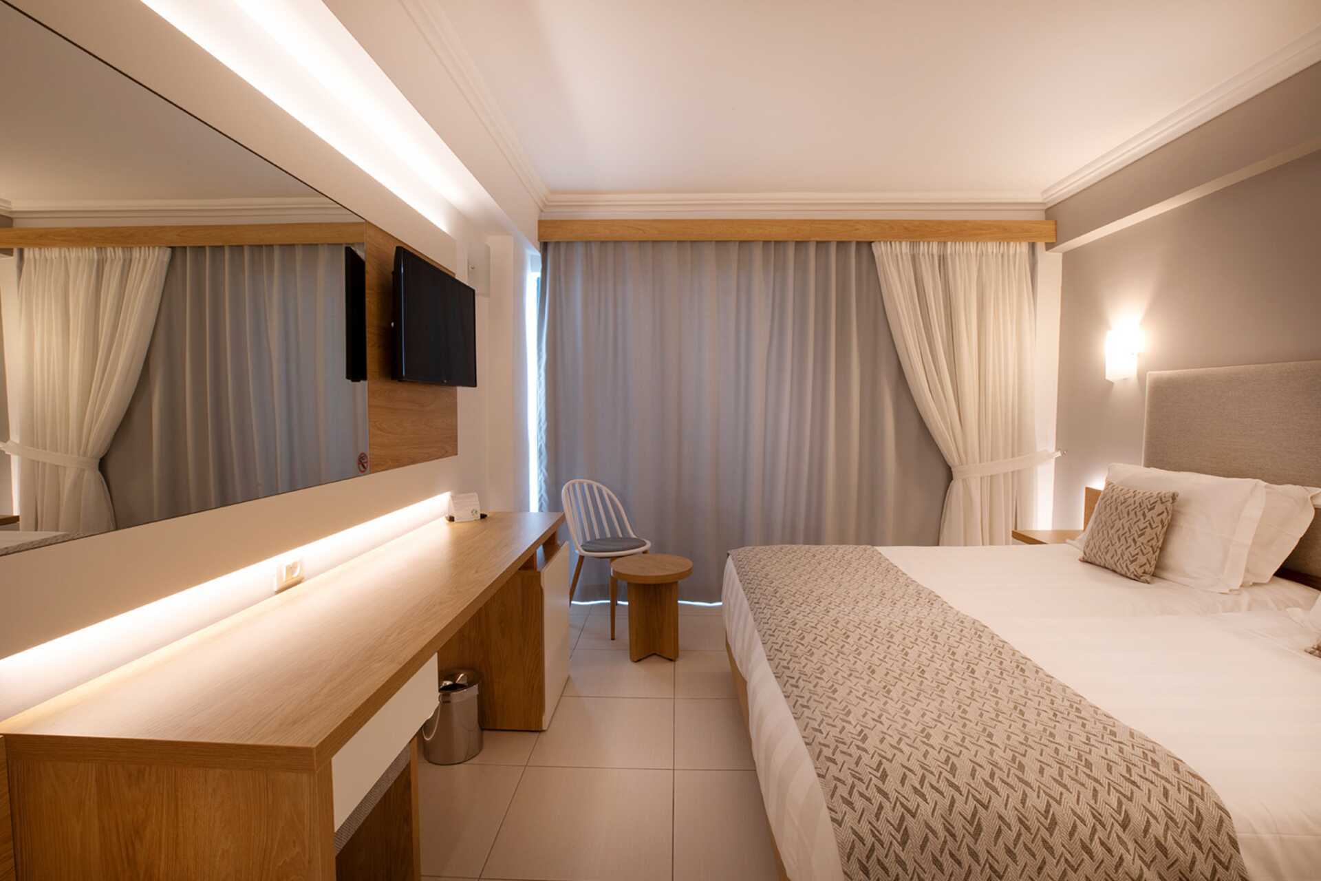 Dobbeltværelser med balkon, nogle med havudsigt eller med delvis havudsigt. En dobbeltseng eller to enkeltsenge. Gratis wifi, aircondition og deponering. Minibaren er fyldt op ved ankomst, men vil ikke blive genopfyldt derefter. Tv med internationale kanaler. Hårtørrer. Badeværelse med bruser og toilet. Rengøring 6 gange om ugen.