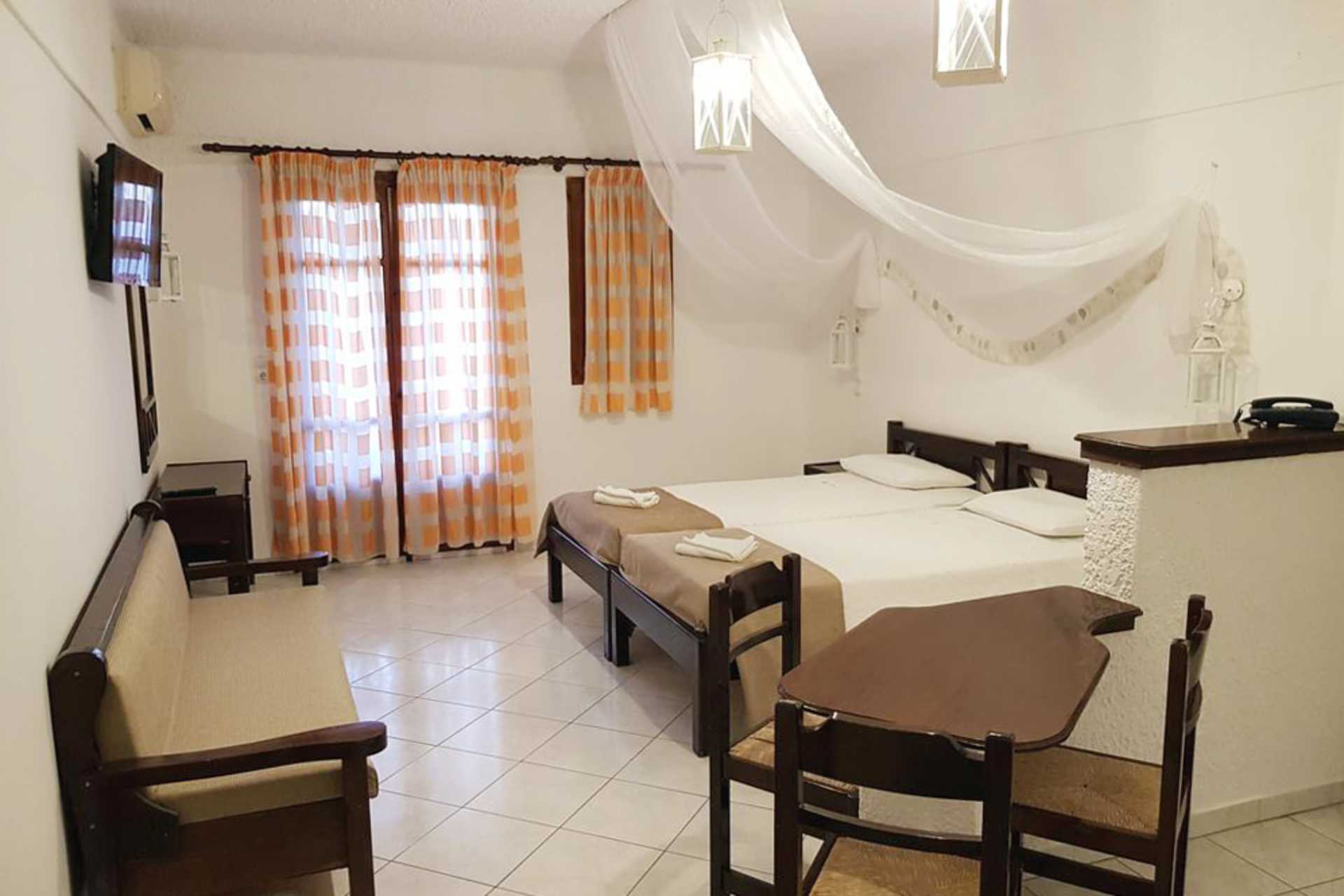 Familie-værelse med balkon eller terrasse. Et soveværelse med dobbeltseng eller to enkeltsenge. Opholdsrum med mulighed for ekstra opredning i sovesofa og enkeltseng. Gratis wifi, aircondition og deponering. Køleskab. Tv med lokale kanaler. Badeværelse med bruser og toilet. Rengøring 6 gange om ugen.