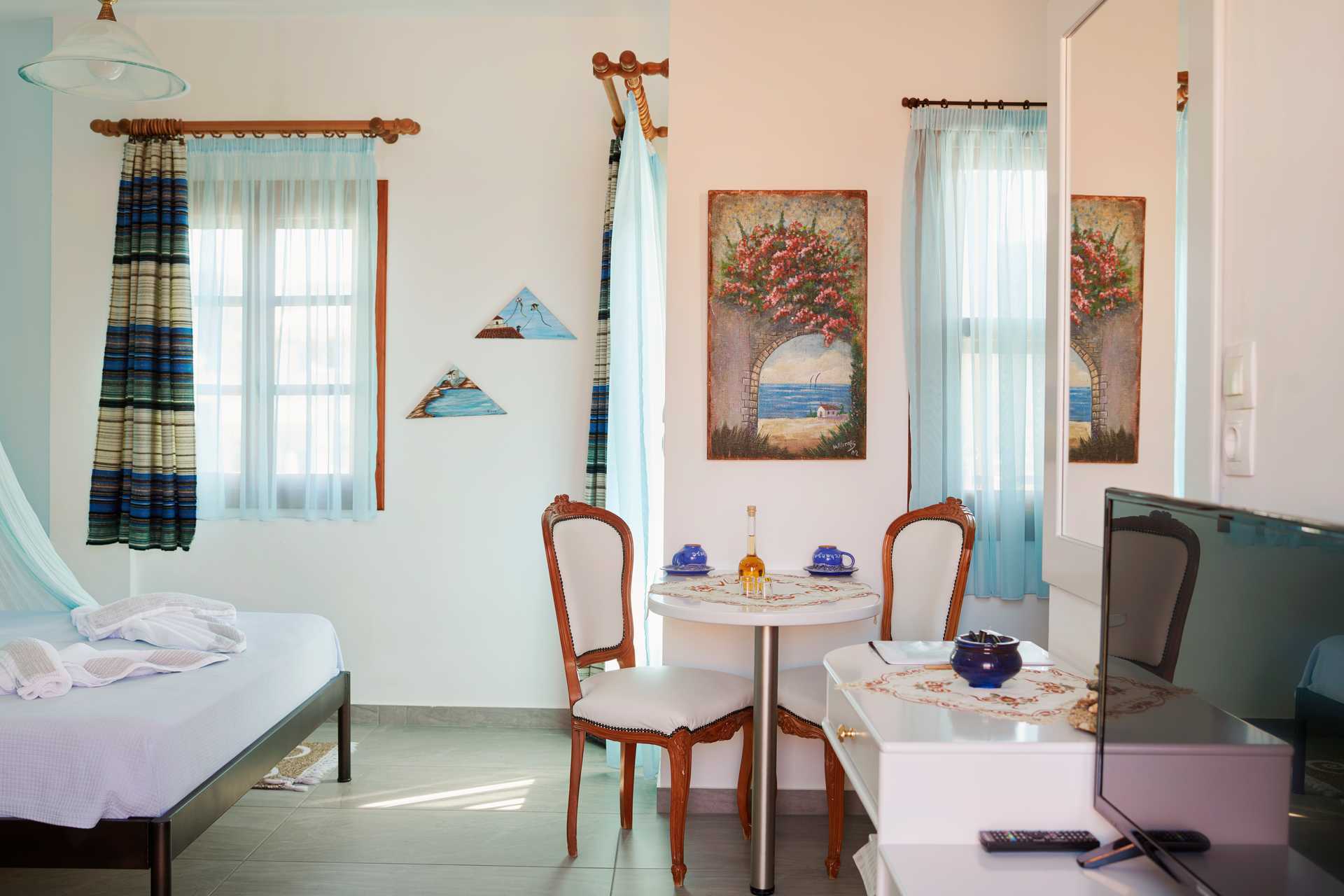 1-værelses lejligheder med balkon eller terrasse. Kombineret soveværelse med minikøkken. En dobbeltseng eller to enkeltsenge. Minikøkken med kogeplader, køleskab, el-kedel, juicepresser og enkelt køkkenudstyr. Tv med internationale kanaler. Gratis wifi, aircondition og deponering. Hårtørrer. Badeværelse med badekar eller bruser og toilet. Rengøring 6 gange om ugen.