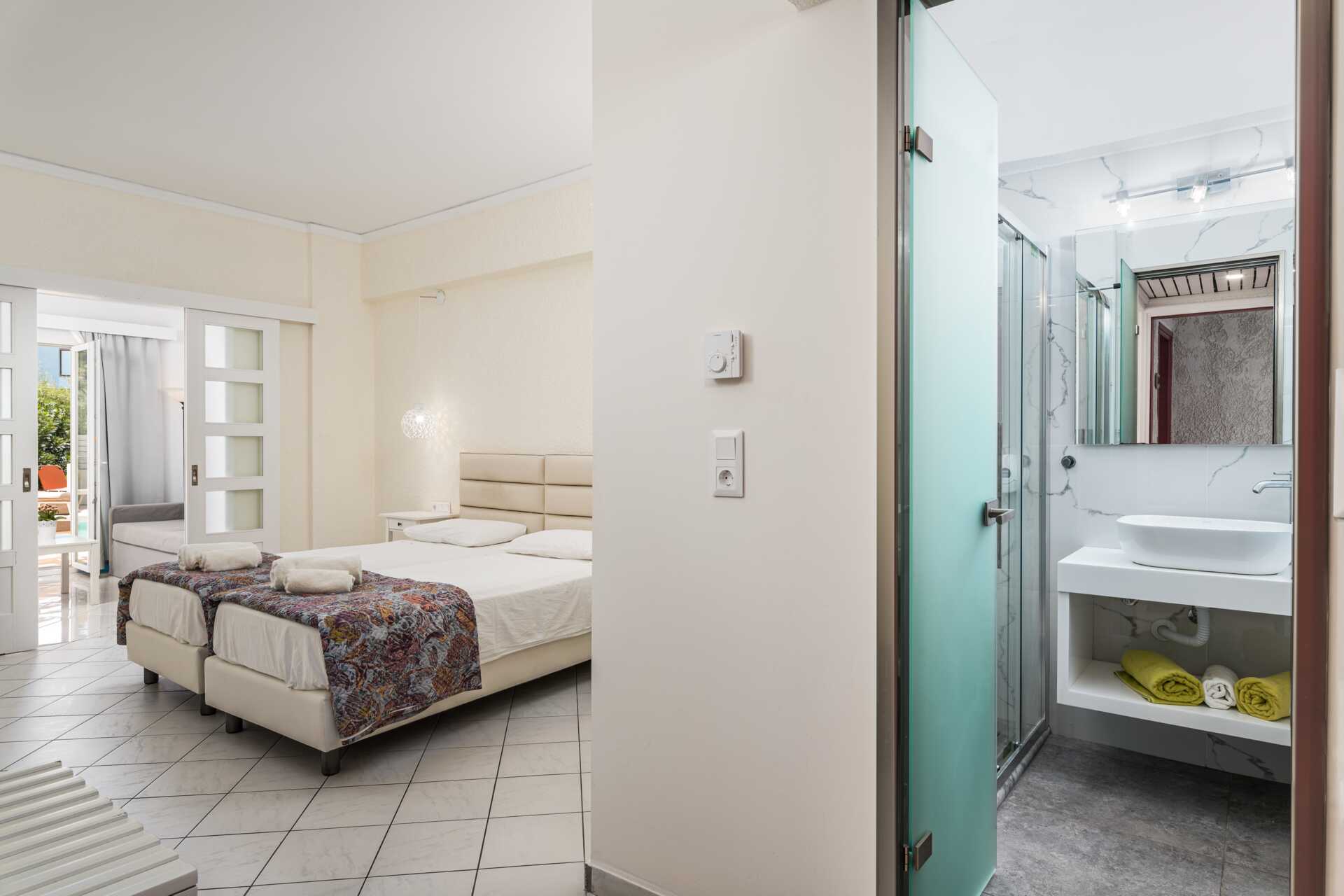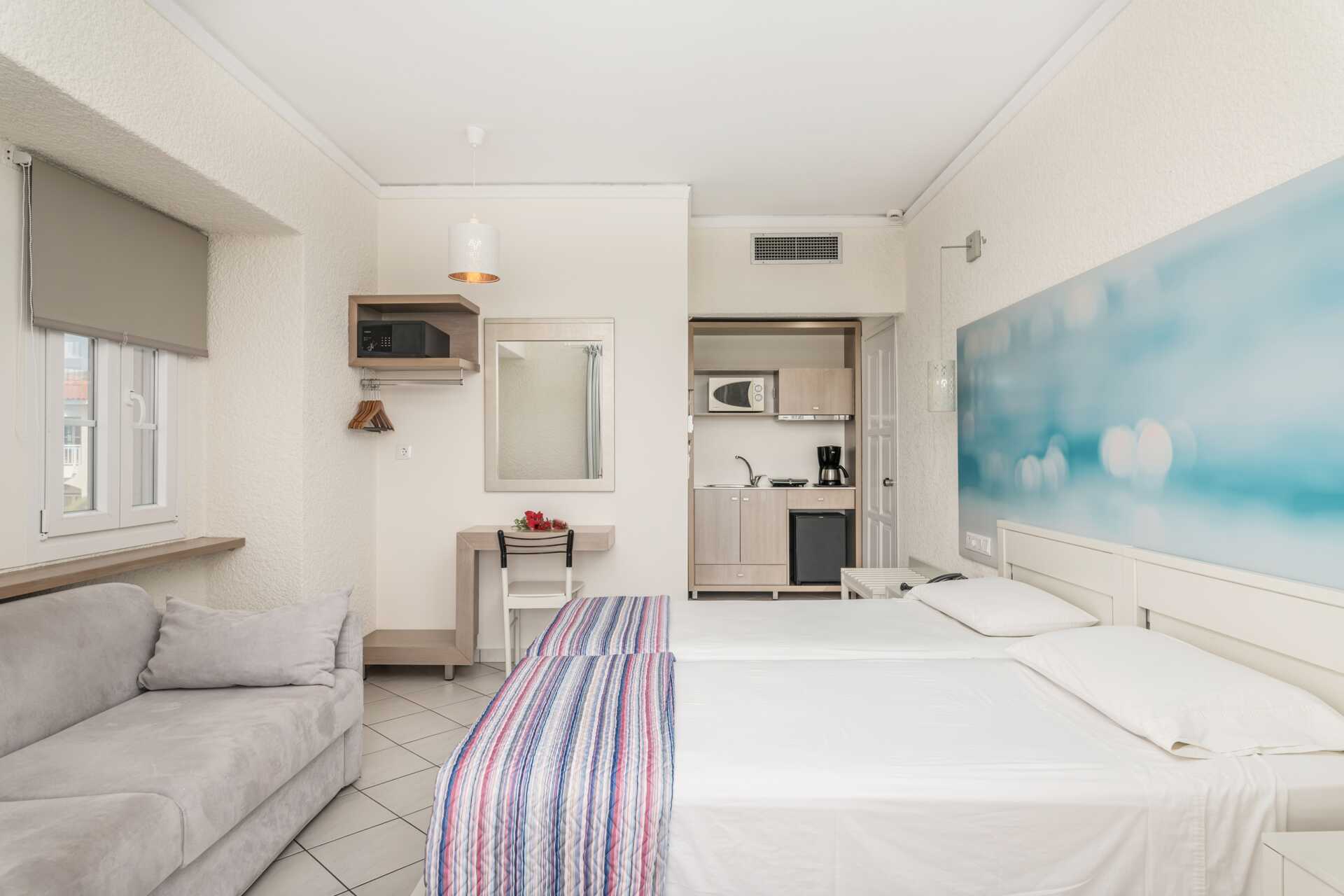2-værelses lejlighed med pooladgang fra terrassen. Denne værelsestype har en aldersgrænse på 16 år. På udepladsen er der en komfortabel lounge sofa/seng samt et bord og stole. Trappe ned i den delte pool. Kombineret soveværelse og minikøkken samt opholdsrum. Skydedøre mellem rum. To enkeltsenge. Mulighed for ekstra opredning i sovesofa. Minikøkken med kogeplader, køleskab, mikroovn, brødrister og enkelt køkkenudstyr. Gratis wifi, aircondition og deponering. Tv med internationale kanaler. Hårtørrer. Badeværelse med bruser og toilet. Rengøring 7 gange om ugen.