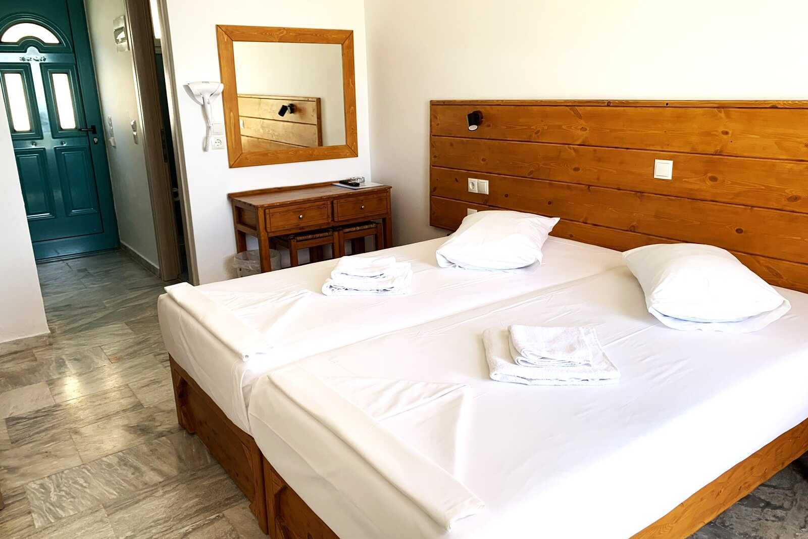 Renoverede dobbeltværelser med terrasse og delvis havudsigt. Værelserne er blevet frisket op til sommeren 2025, blandt andet med nye senge. To enkeltsenge. I nogle værelser er der mulighed for en ekstra seng. Gratis wifi og aircondition. Deponering mod betaling. Køleskab. Tv med lokale kanaler. Badeværelse med bruser og toilet. Rengøring 6 gange om ugen. Børn under to år tæller med i det maksimale antal personer på værelset.