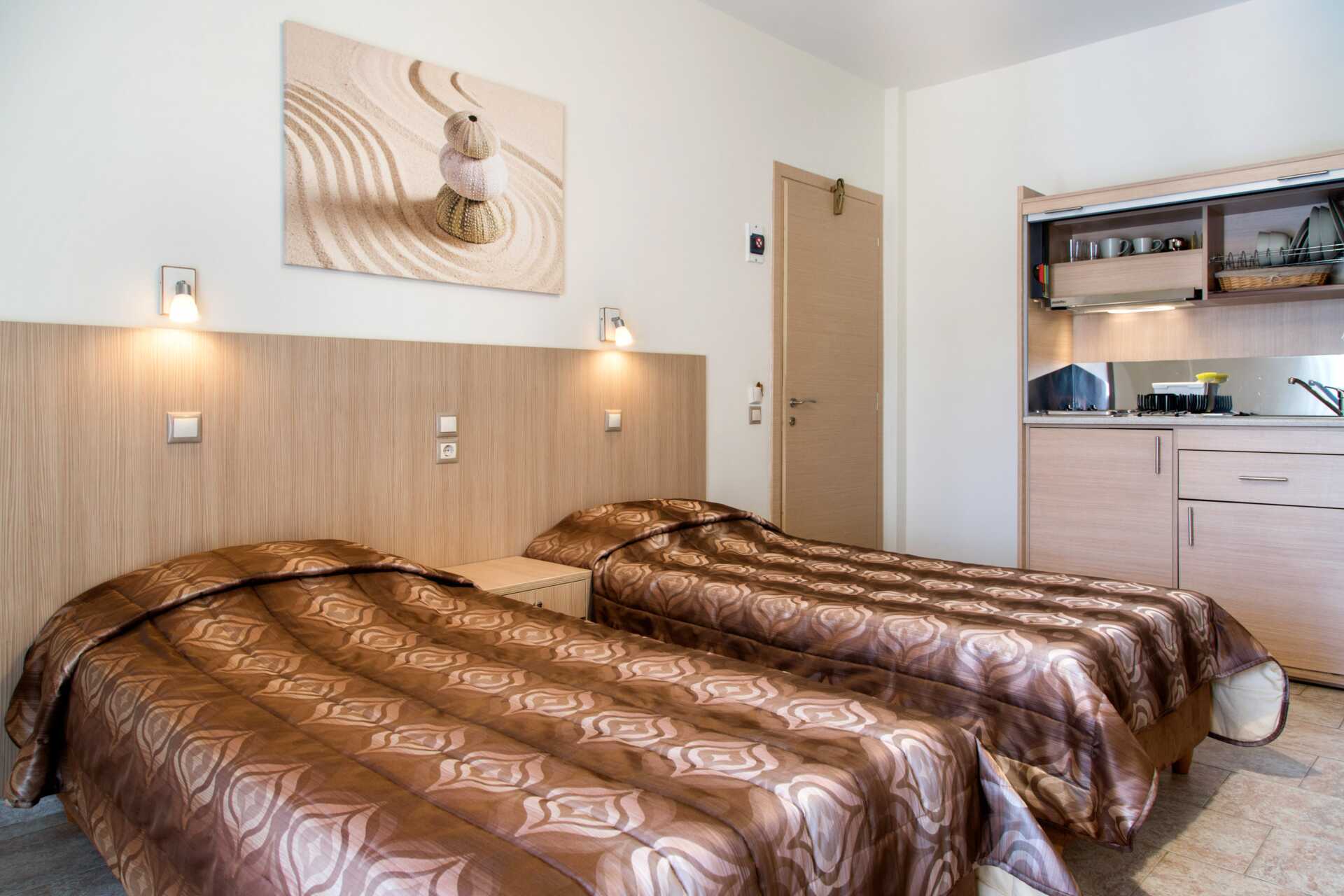1-værelses lejligheder med balkon eller terrasse. Kombineret soveværelse med minikøkken. En dobbeltseng eller to enkeltsenge. Minikøkken med kogeplader, køleskab med fryser, el-kedel og kaffe/te samt enkelt køkkenudstyr. Gratis wifi, aircondition og deponering. Hårtørrer. Badeværelse med bruser og toilet. Rengøring 6 gange om ugen.