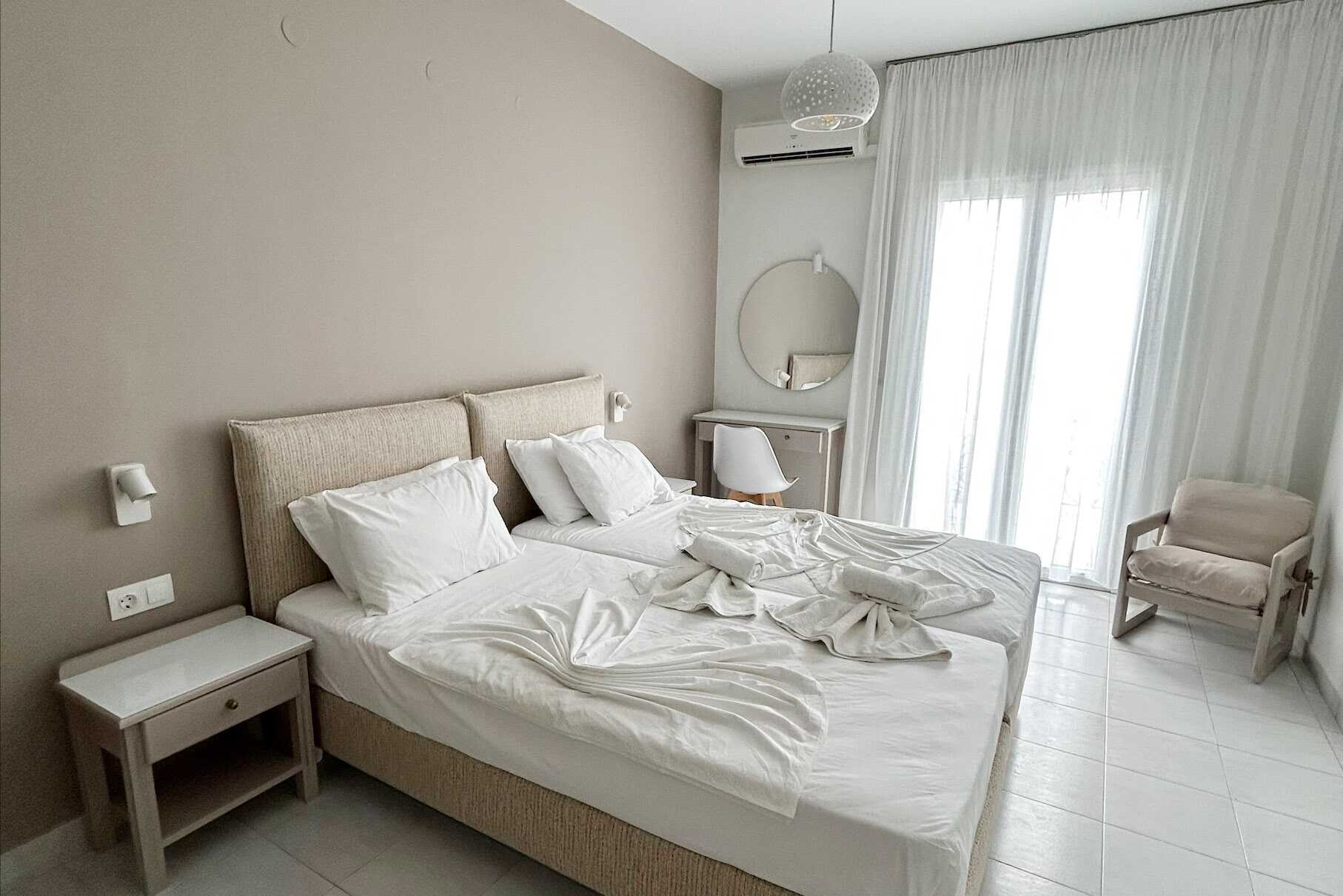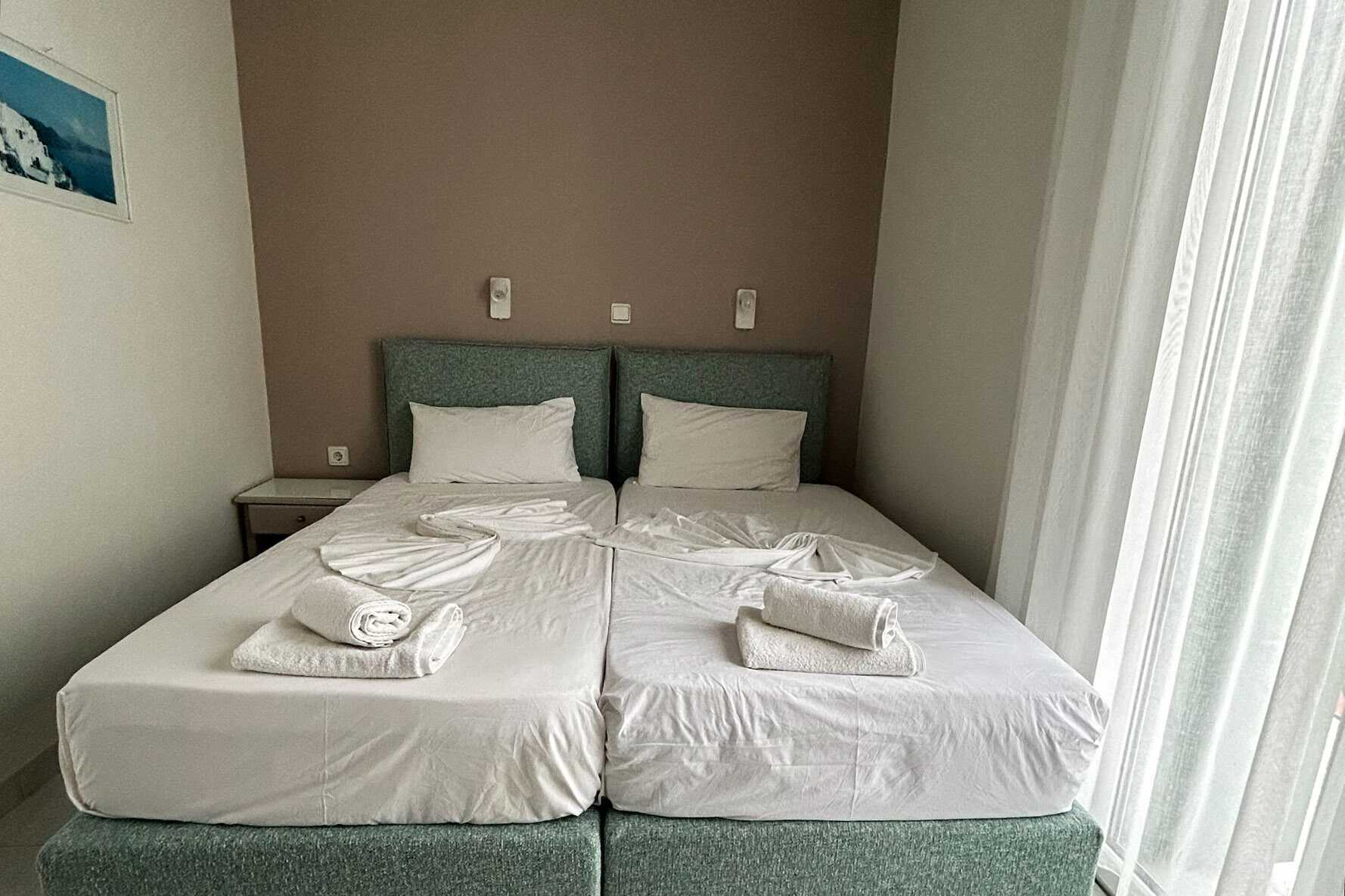 1-værelses lejligheder med balkon for 2 personer eller delt udeplads. Alle lejligheder har en flot udsigt over havet og havnen i Pythagorion. Soveværelse kombineret med minikøkken. To enkeltsenge. I nogle lejligheder er der mulighed for ekstra opredning til en tredje person. Minikøkken med kogeplader, køleskab, brødrister og enkelt køkkenudstyr. Gratis wifi og deponering. Aircondition mod betaling. Hårtørrer. Badeværelse med bruser og toilet. Rengøring 6 gange om ugen. Børn under to år tæller med i det maksimale antal personer på værelset.