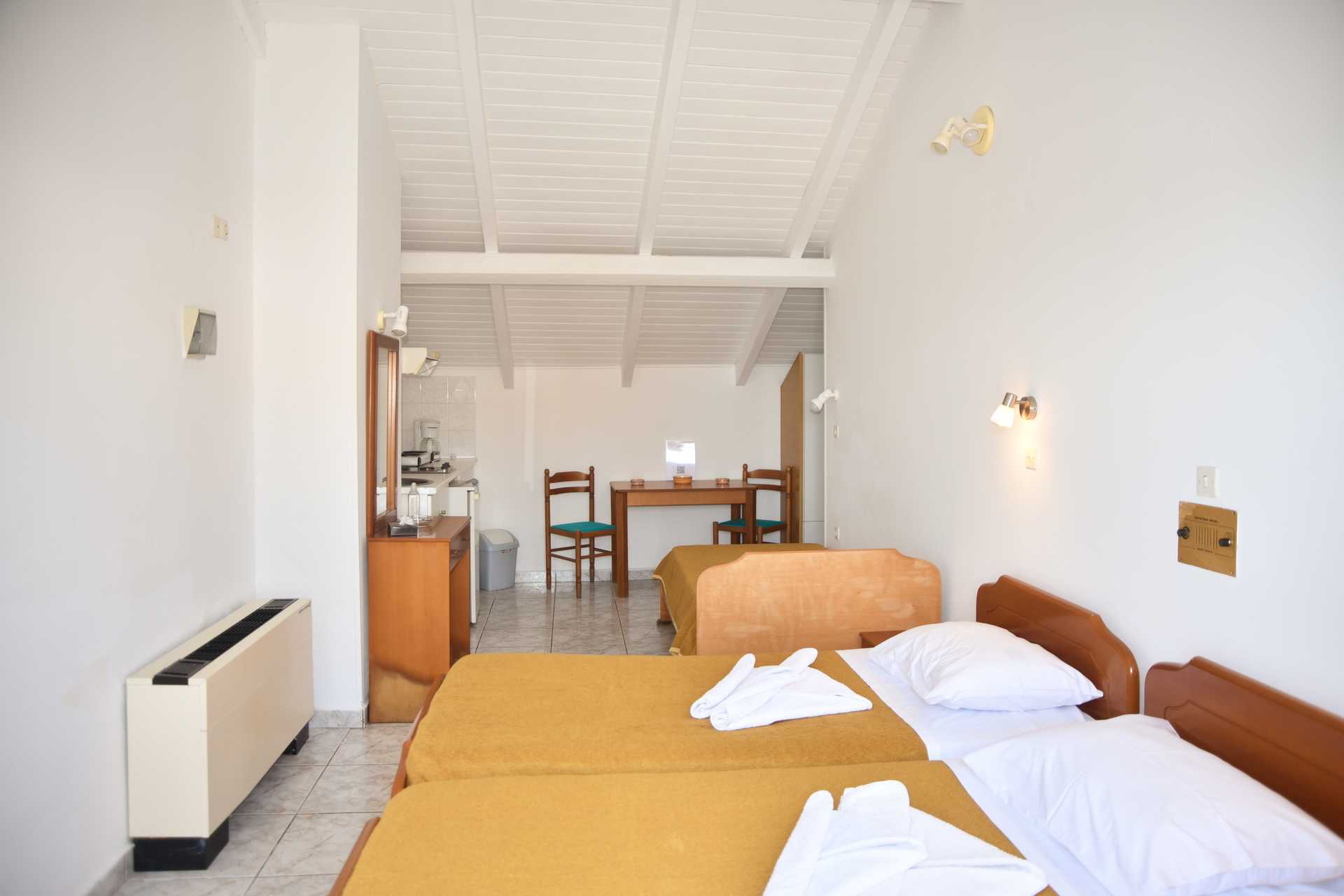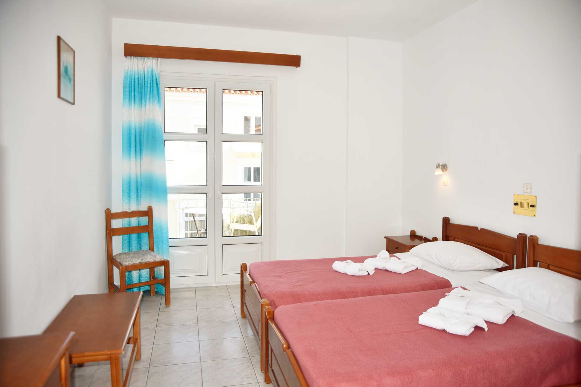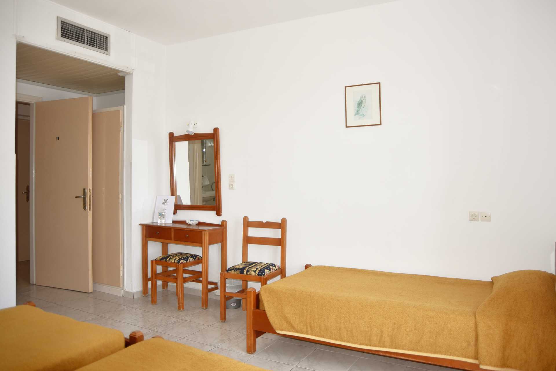 1-værelses lejligheder med balkon eller terrasse. Soveværelse kombineret med minikøkken. To enkeltsenge. Mulighed for ekstra opredning i enkeltseng. Minikøkken med køleskab, kogeplader, brødrister, kaffemaskine og enkelt køkkenudstyr. Gratis wifi og aircondition mellem kl. 21.00 og 07.00, som er centralt styret og deponering . Tv med lokale kanaler. Badeværelse med bruser og toilet. Rengøring 6 gange om ugen. En af lejlighederne tilgås via en smal vindeltrappe.