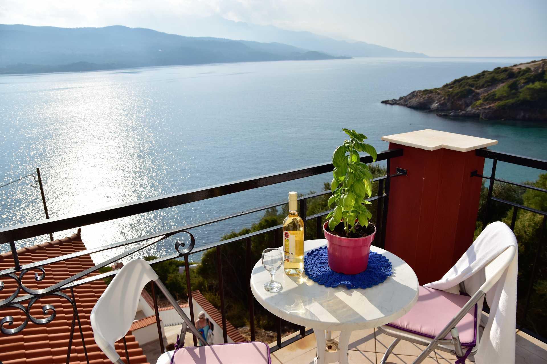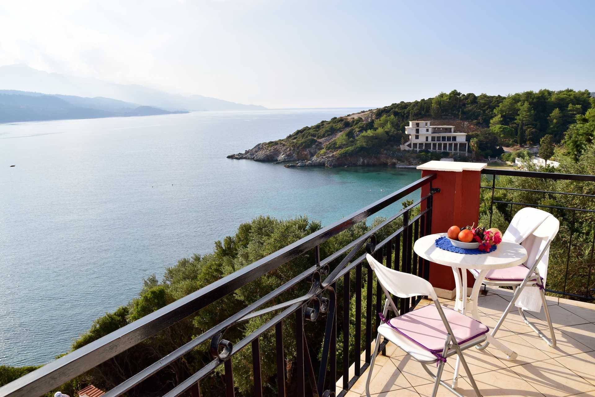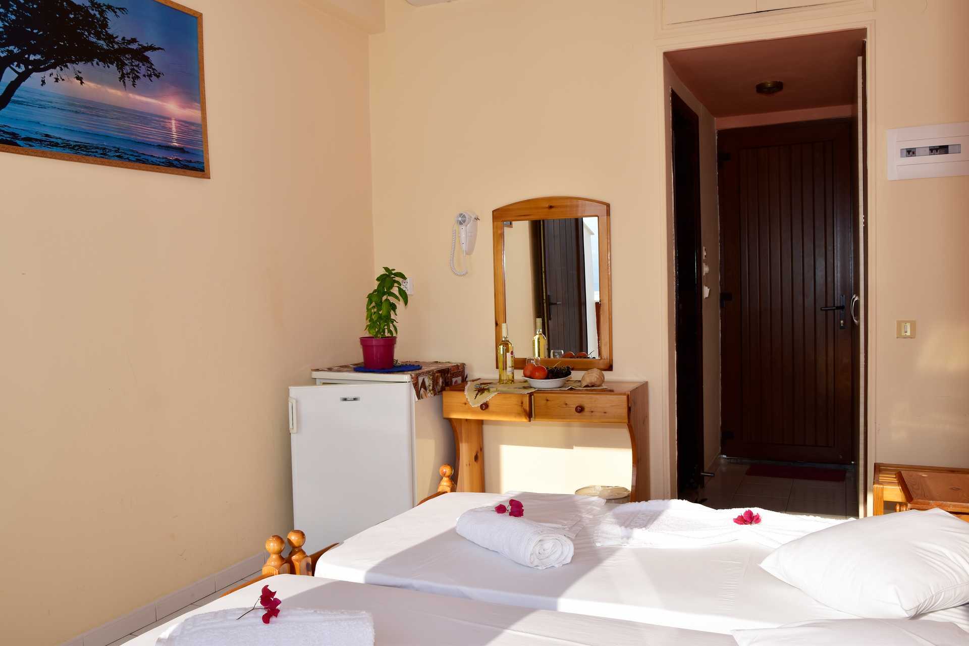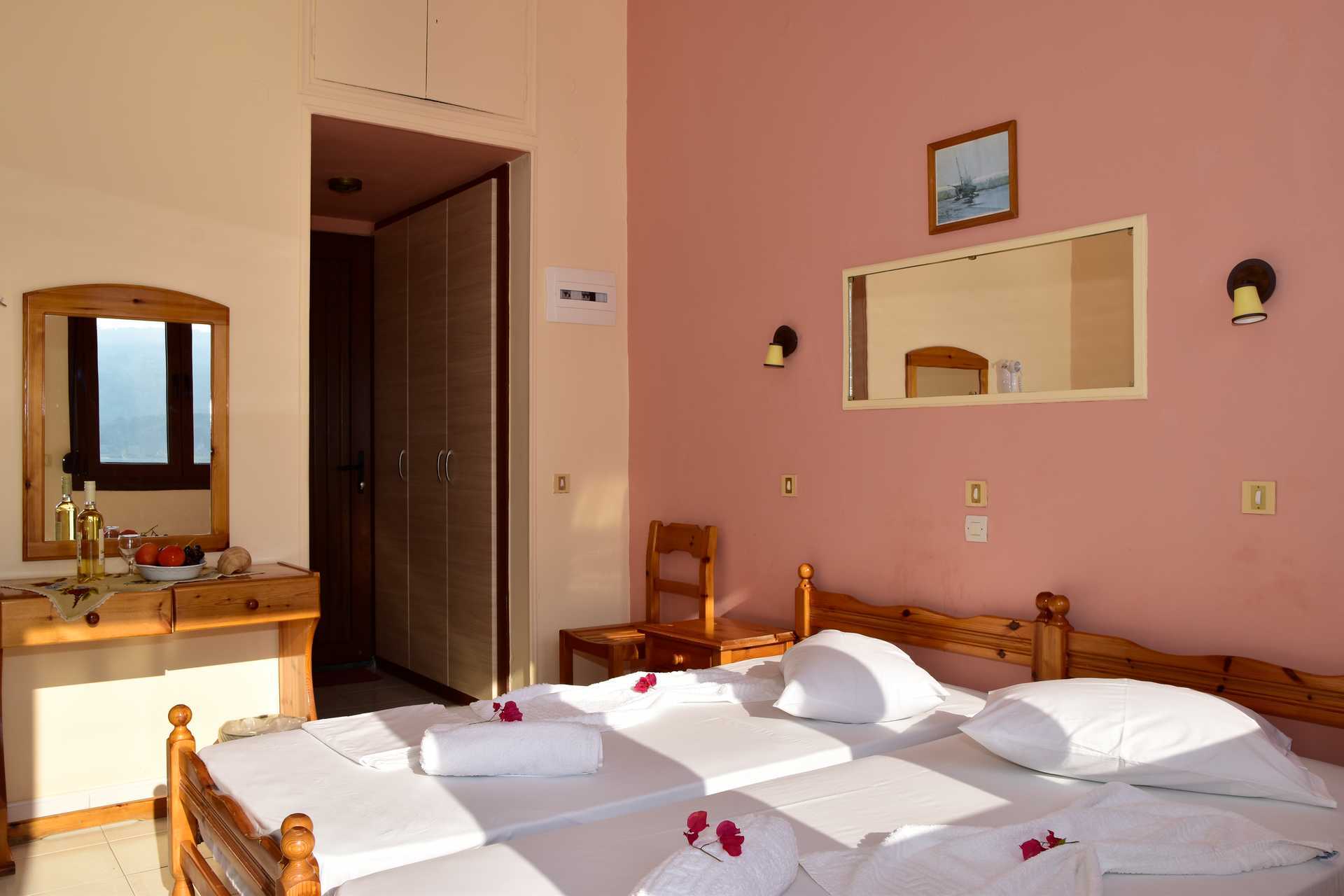 Dobbeltværelse med balkon med havudsigt eller med delt udeplads med delvis havudsigt. To enkeltsenge. Loftsvifte. Køleskabe kan lejes. Gratis wifi. Aircondition mod betaling. Hårtørrer. Badeværelse med bruser og toilet. Rengøring 6 gange om ugen.