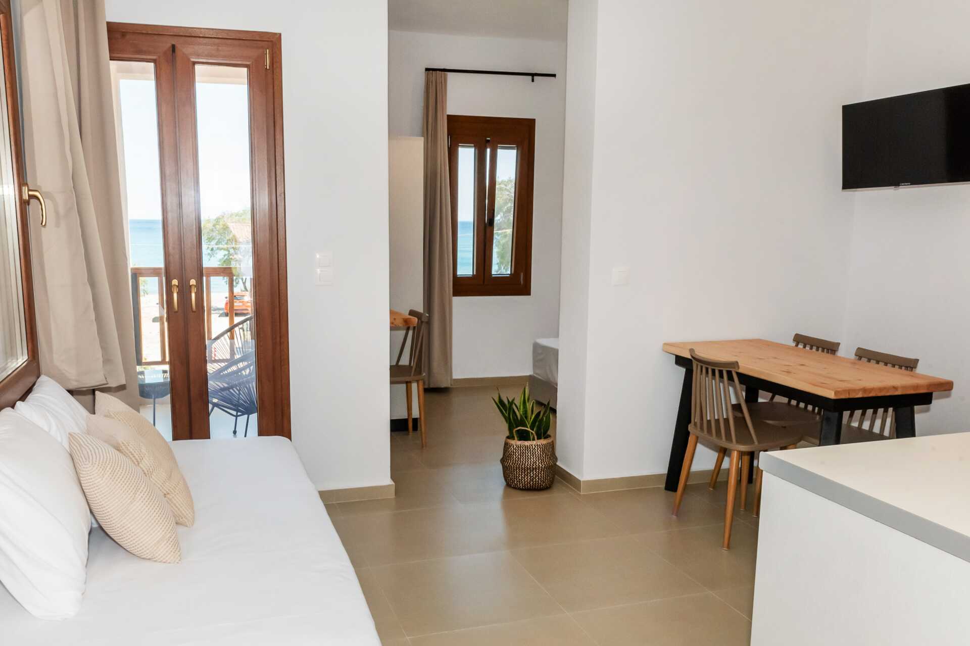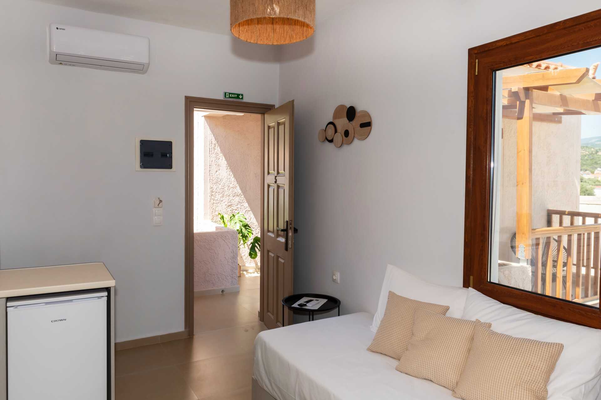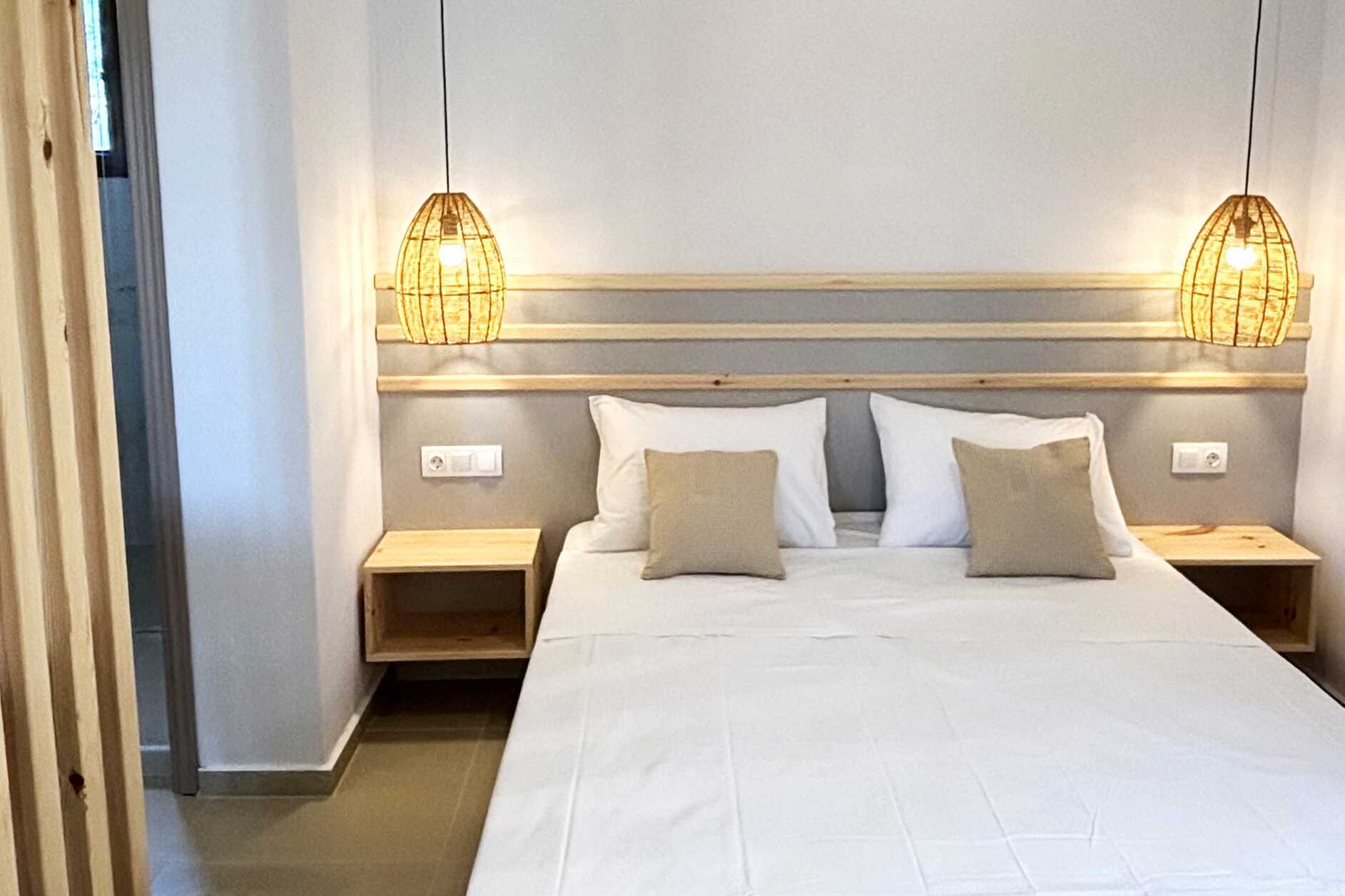 1-værelses lejlighed med balkon eller terrasse i stueplan med delvis udsigt, se tekst, eller med udsigt mod bjergene. Kombineret soveværelse og minikøkken. En dobbeltseng. Mulighed for ekstra opredning i sovesofa. Minikøkken med kogeplader, køleskab, el-kedel, sandwichgrill og enkelt køkkenudstyr. Gratis wifi, aircondition og deponering. Tv med internationale kanaler. Badeværelse med bruser og toilet. Rengøring 6 gange om ugen.