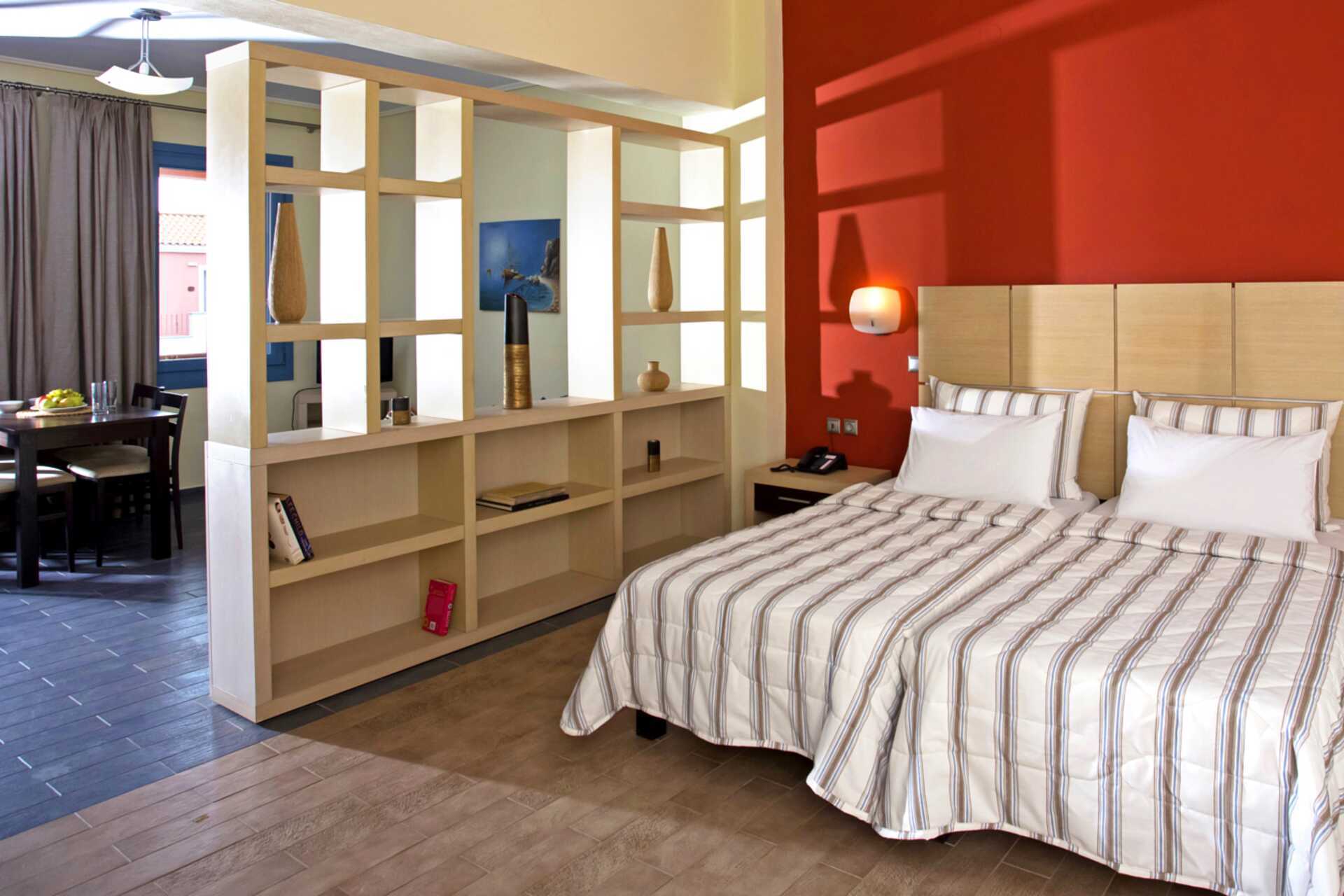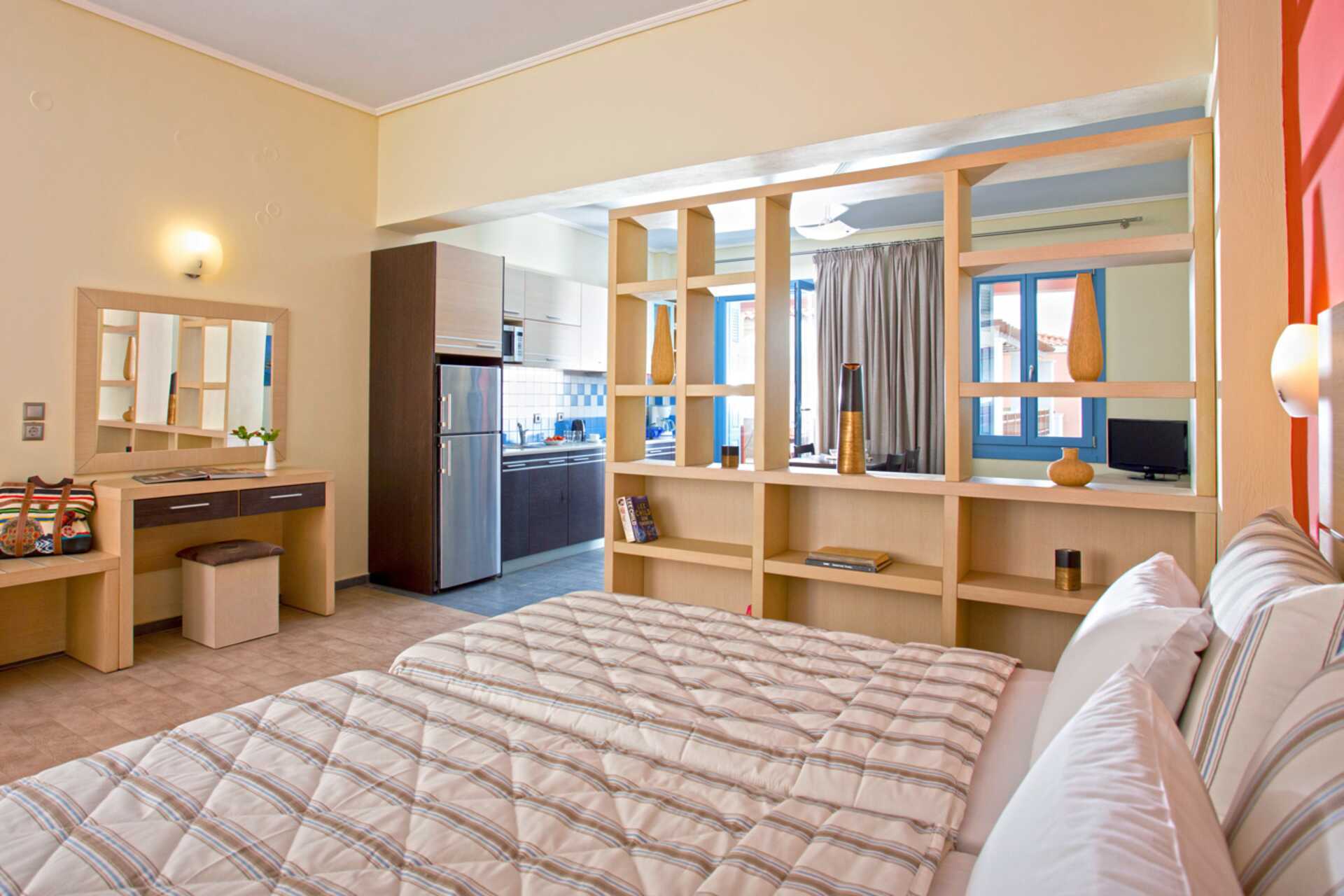 1-værelses lejligheder med balkon eller terrasse. Soveværelse kombineret med minikøkken. En dobbeltseng eller to enkeltsenge. Mulighed for ekstra opredninger i sovesofa. Minikøkken med kogeplader, mikrobølgeovn, køleskab, el-kedel, kaffemaskine og enkelt køkkenudstyr. Gratis wifi, aircondition og deponering. Tv med internationale kanaler. Hårtørrer. Badeværelse med bruser og toilet. Rengøring 7 gange om ugen. Børn under to år tæller med i det maksimale antal personer på værelset.