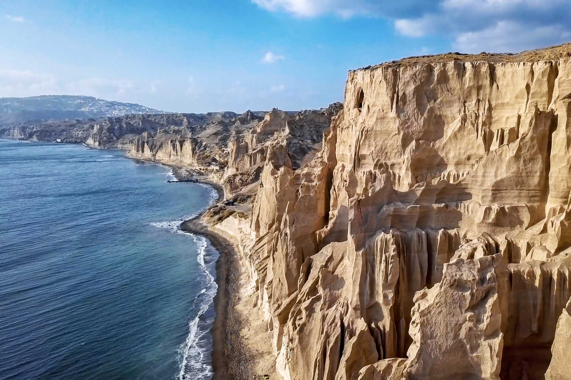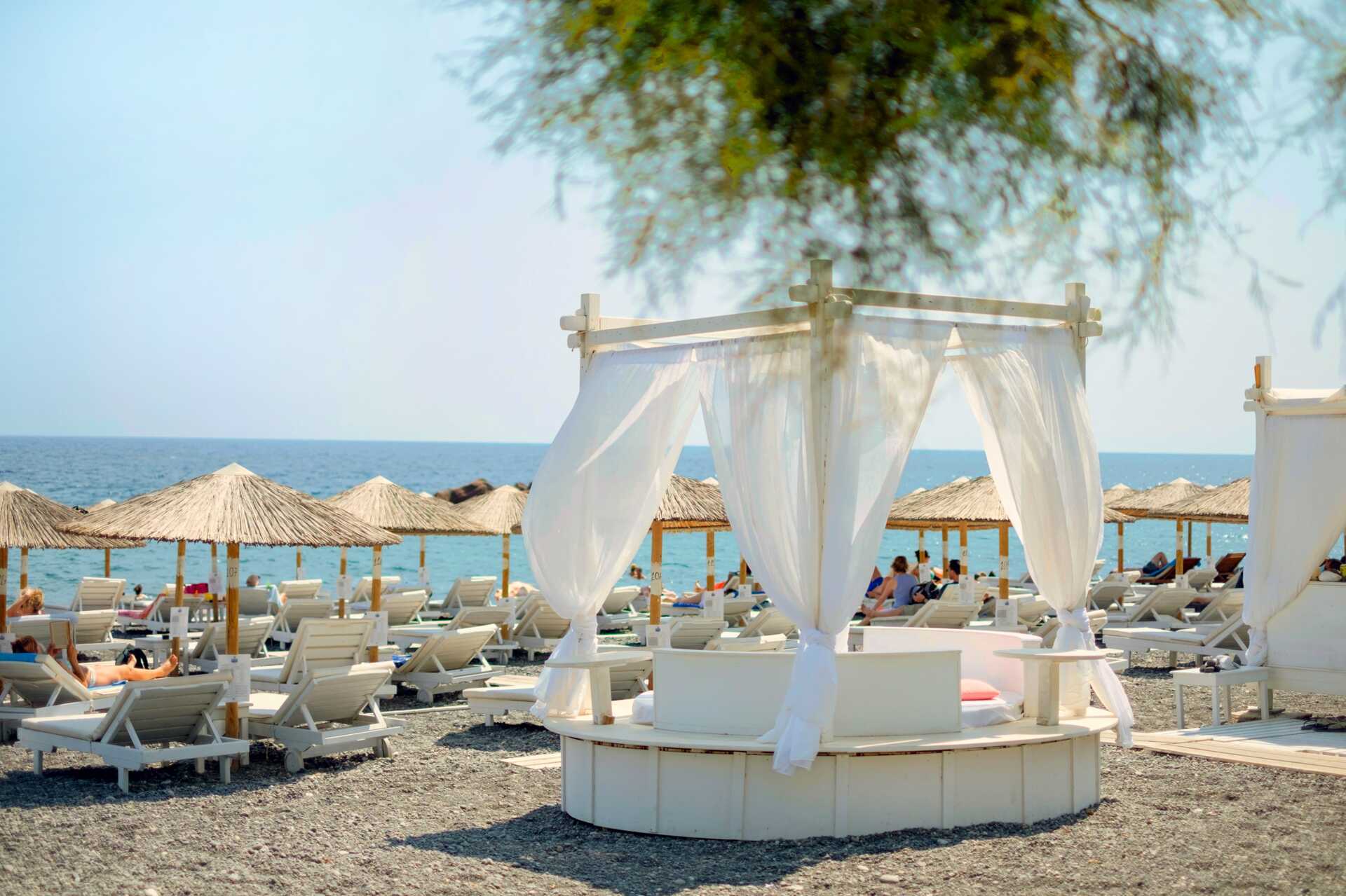Santorinis strandeAlle strande på Santorini ligger på østkysten og er lavastrande. Den røde lavastrand Red Beach ligger i byen Akrotiri på Santorini. Her stiger røde klipper op fra havet, med det røde sand nedenunder. Red Beach er ind imellem lukket på grund af risikoen for jordskred, spørg i receptionen på dit hotel, inden du tager afsted.