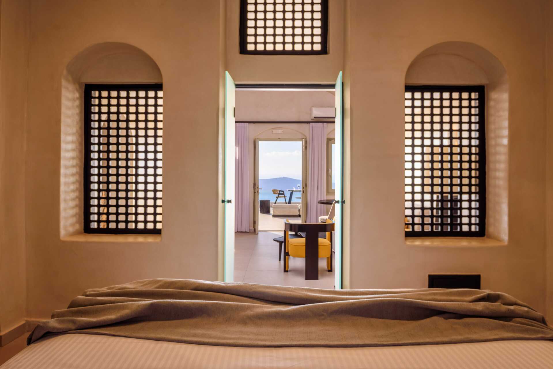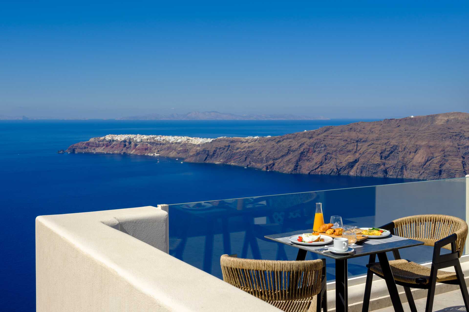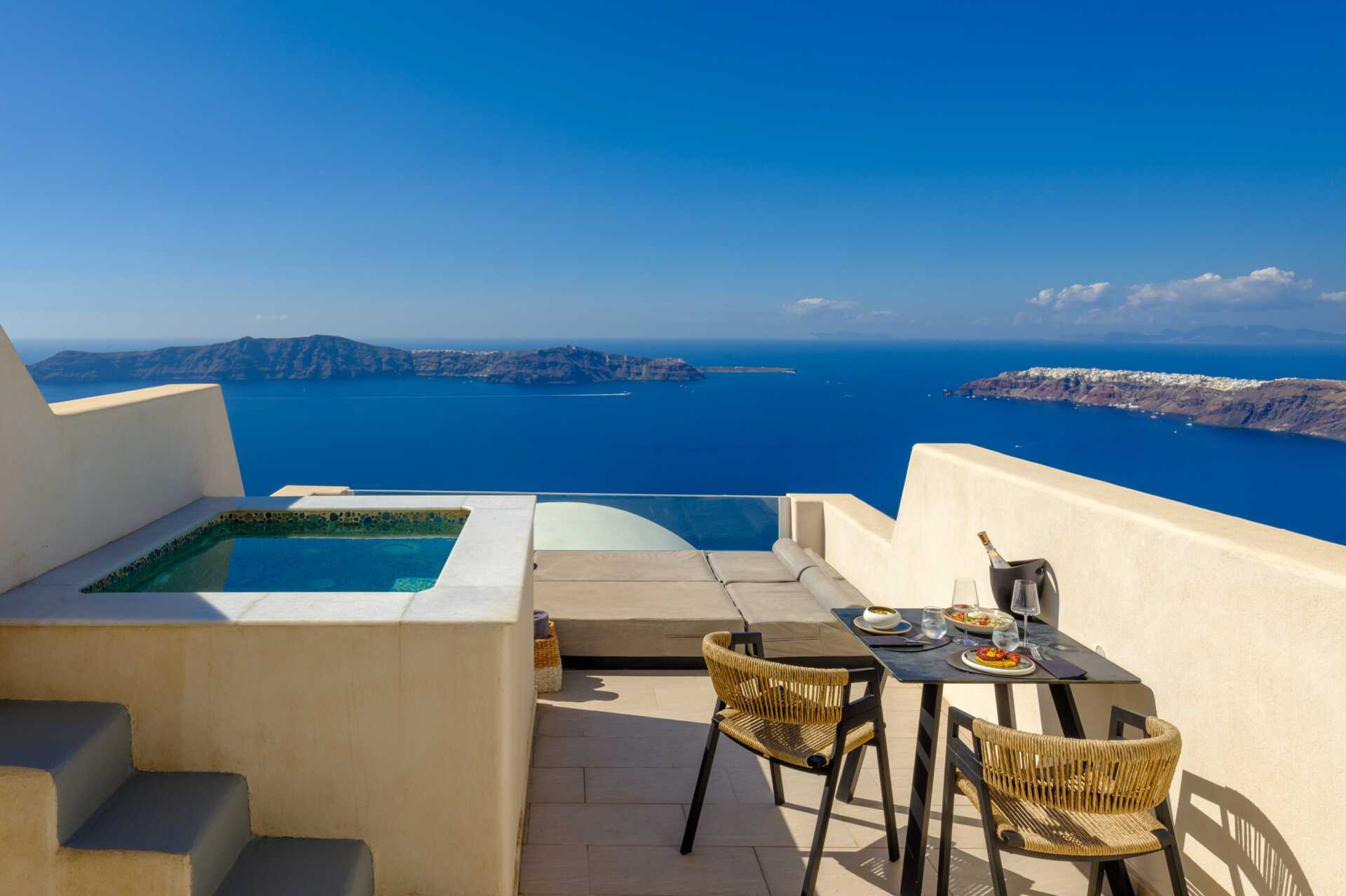 Deluxe-suiter med balkon eller terrasse og havudsigt. På udepladsen er der en opvarmet privat pool, solstole og spiseplads. Deluxe-suiterne har en dobbeltseng og et opholdsområde med mulighed for ekstra opredning på en sovesofa. Gratis wifi, aircondition og deponering. Køleskab. El-kedel og kaffe/te. Tv med internationale kanaler. Hårtørrer. Badeværelse med bruser og toilet. Rengøring 7 gange om ugen. Børn under to år tæller med i det maksimale antal personer på værelset.