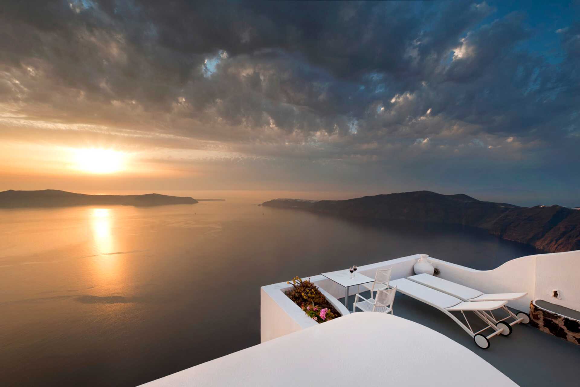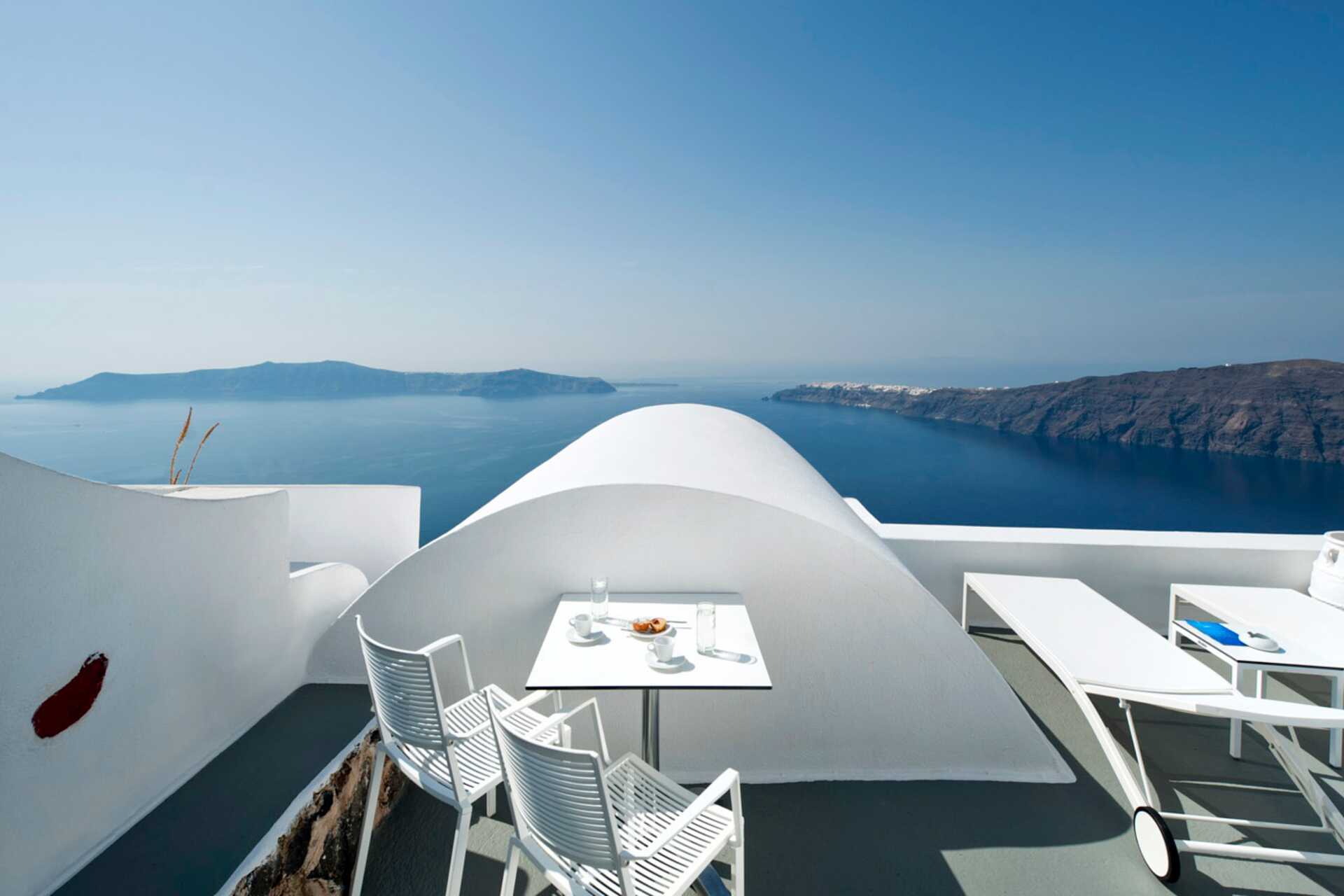 Deluxe-værelser med balkon eller terrasse med havudsigt. På terrassen er der stole og bord samt to solstole. På værelset er der en opvarmet pool. Trappetrin til poolen. En dobbeltseng. Gratis wifi, aircondition og deponering. Køleskab. El-kedel samt kaffe/te. Ved ankomst er der vin, frugt og slik på værelset. Tv med internationale kanaler. Badekåber og tøfler. Hårtørrer. Badeværelse med bruser og toilet. Rengøring 7 gange om ugen.