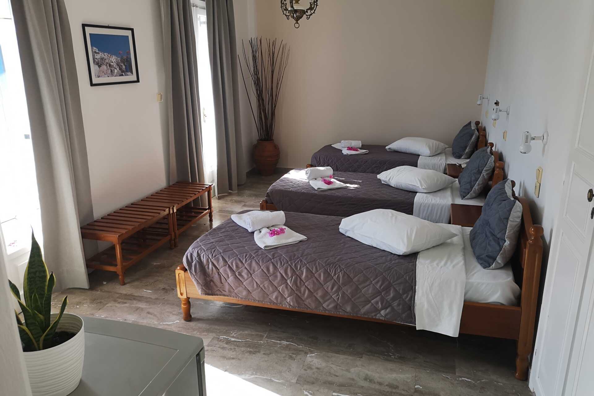 Trippel-værelse med balkon. Tre enkeltsenge. Gratis wifi, aircondition og deponering. Køleskab. Tv med internationale kanaler. Hårtørrer. Badeværelse med bruser og toilet. Rengøring 6 gange om ugen.