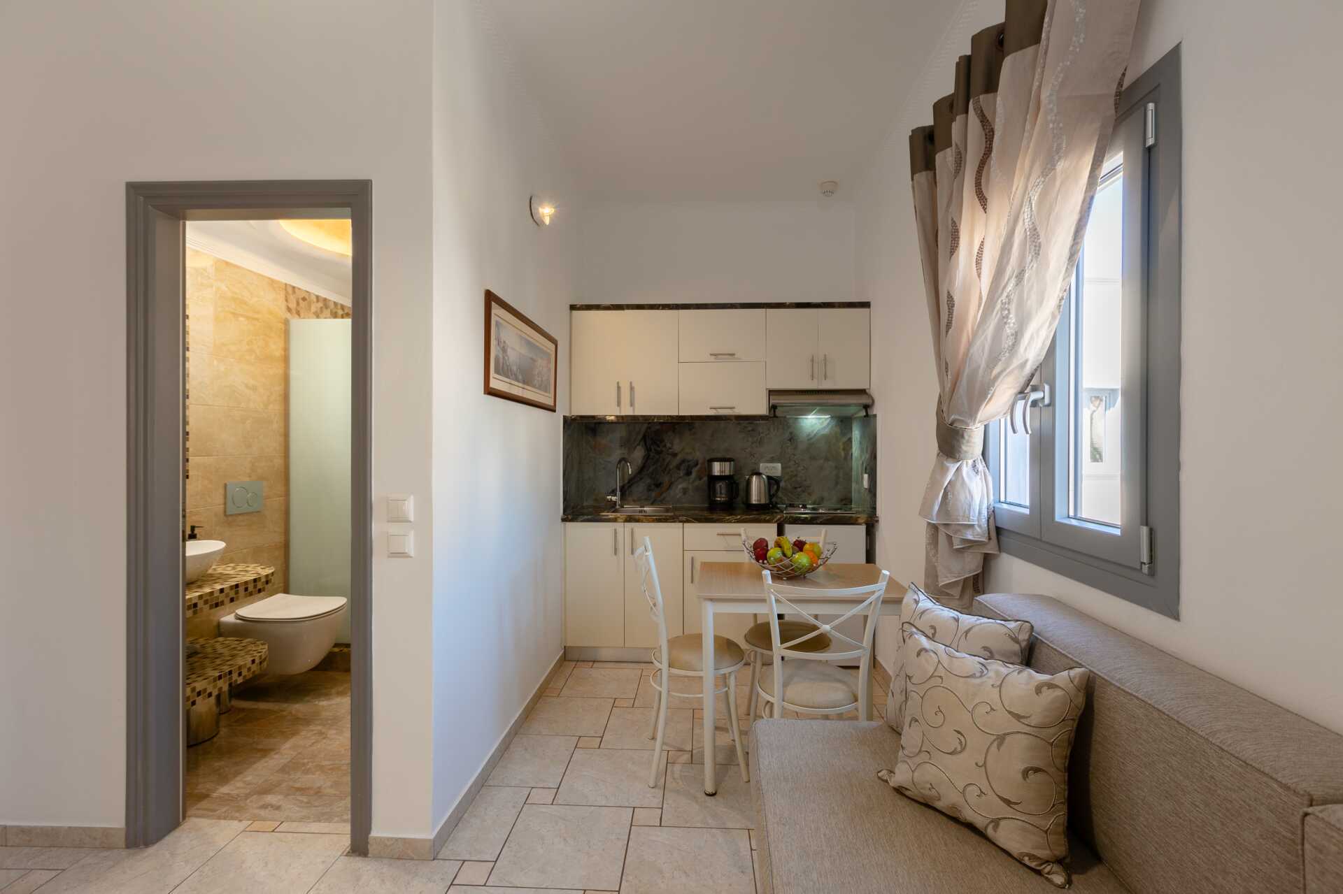 Renoveret 1-værelses lejligheder med balkon eller terrasse. Soveværelse kombineret med minikøkken. En dobbeltseng. Mulighed for ekstra opredning. Minikøkken med kogeplader, køleskab, kaffemaskine, el-kedel og enkelt køkkenudstyr. Gratis wifi og aircondition. Deponering mod betaling. Tv med internationale kanaler. Hårtørrer. Badeværelse med bruser og toilet. Rengøring 7 gange om ugen. Børn under to år er inkluderet i det maksimale antal personer i lejligheden.