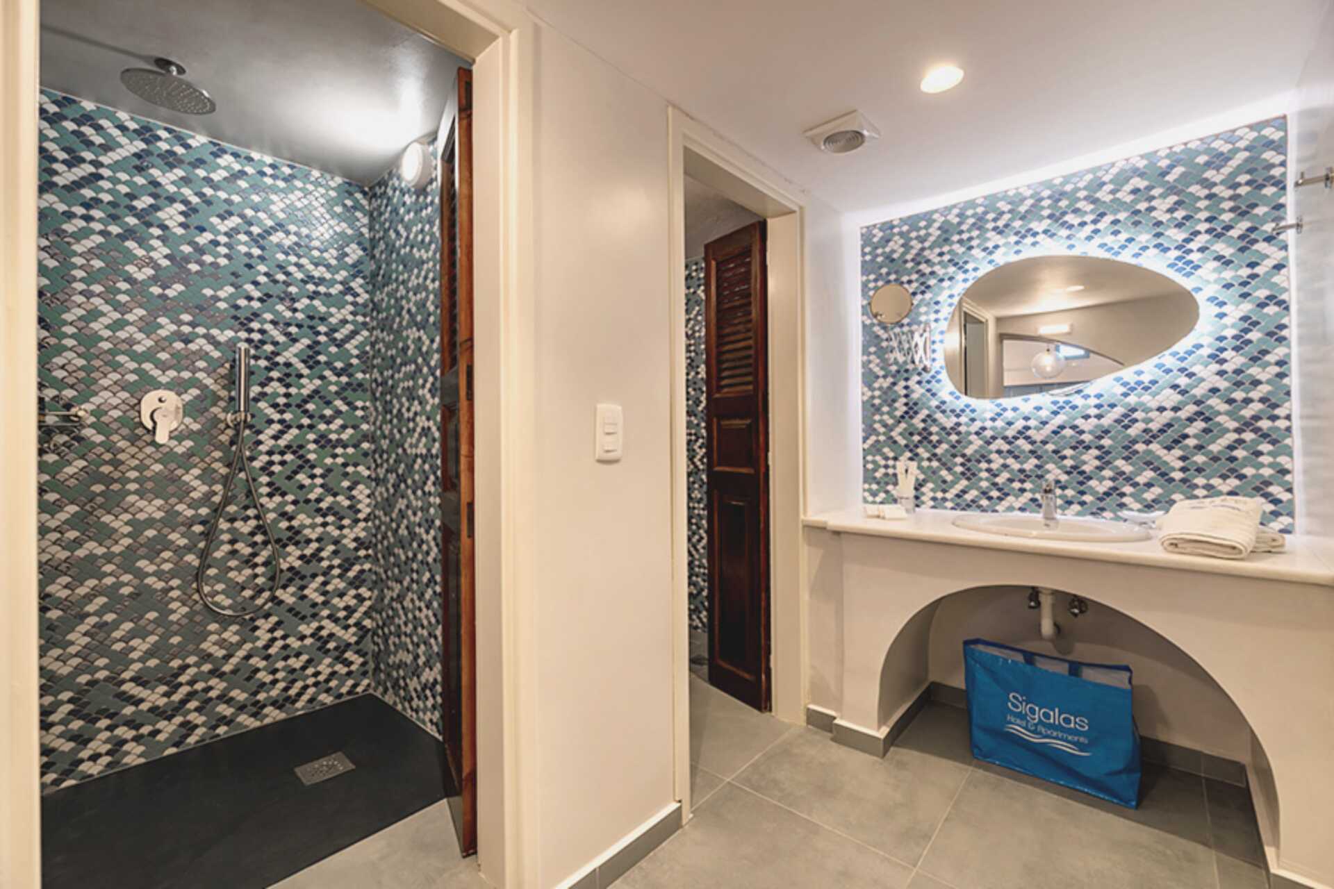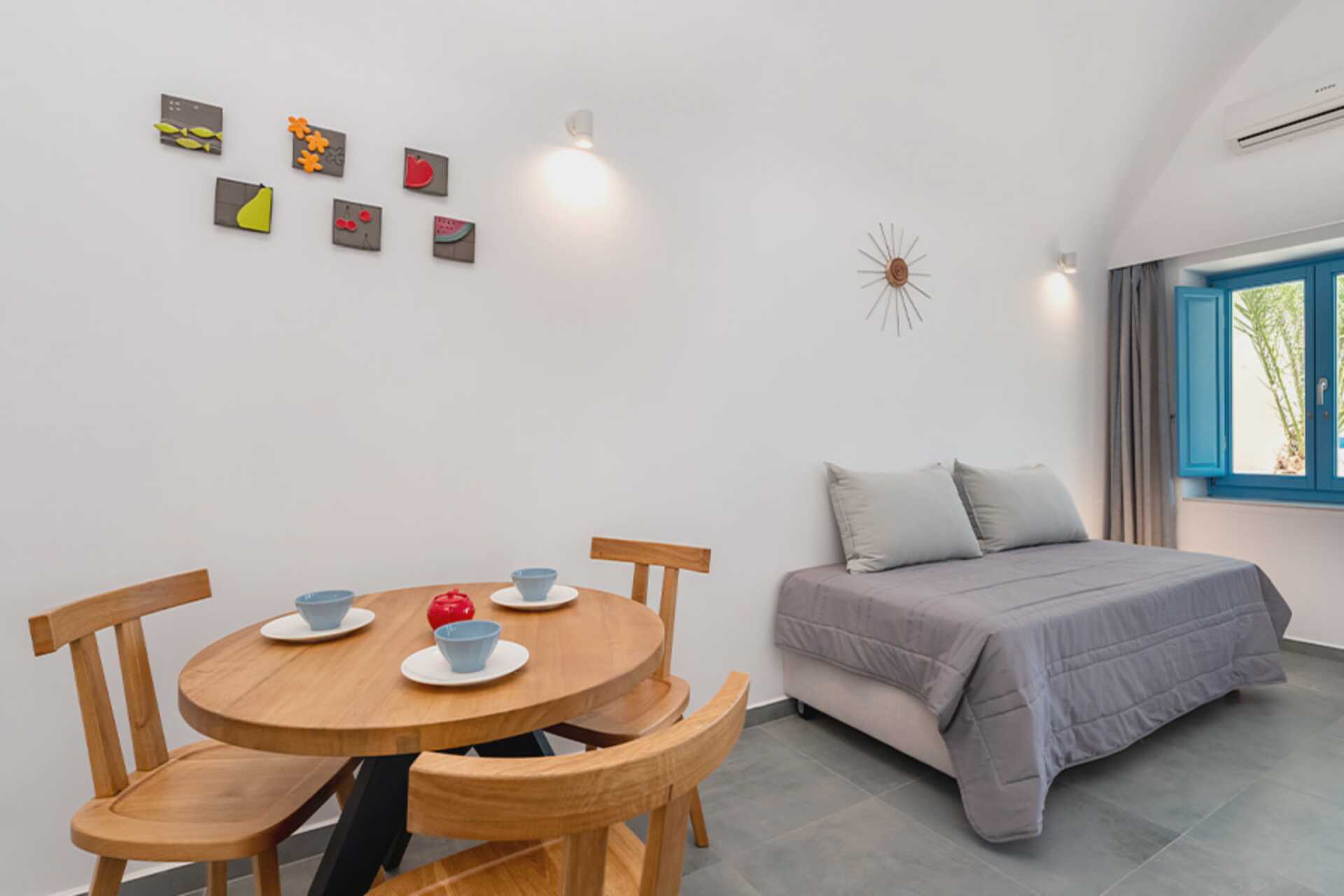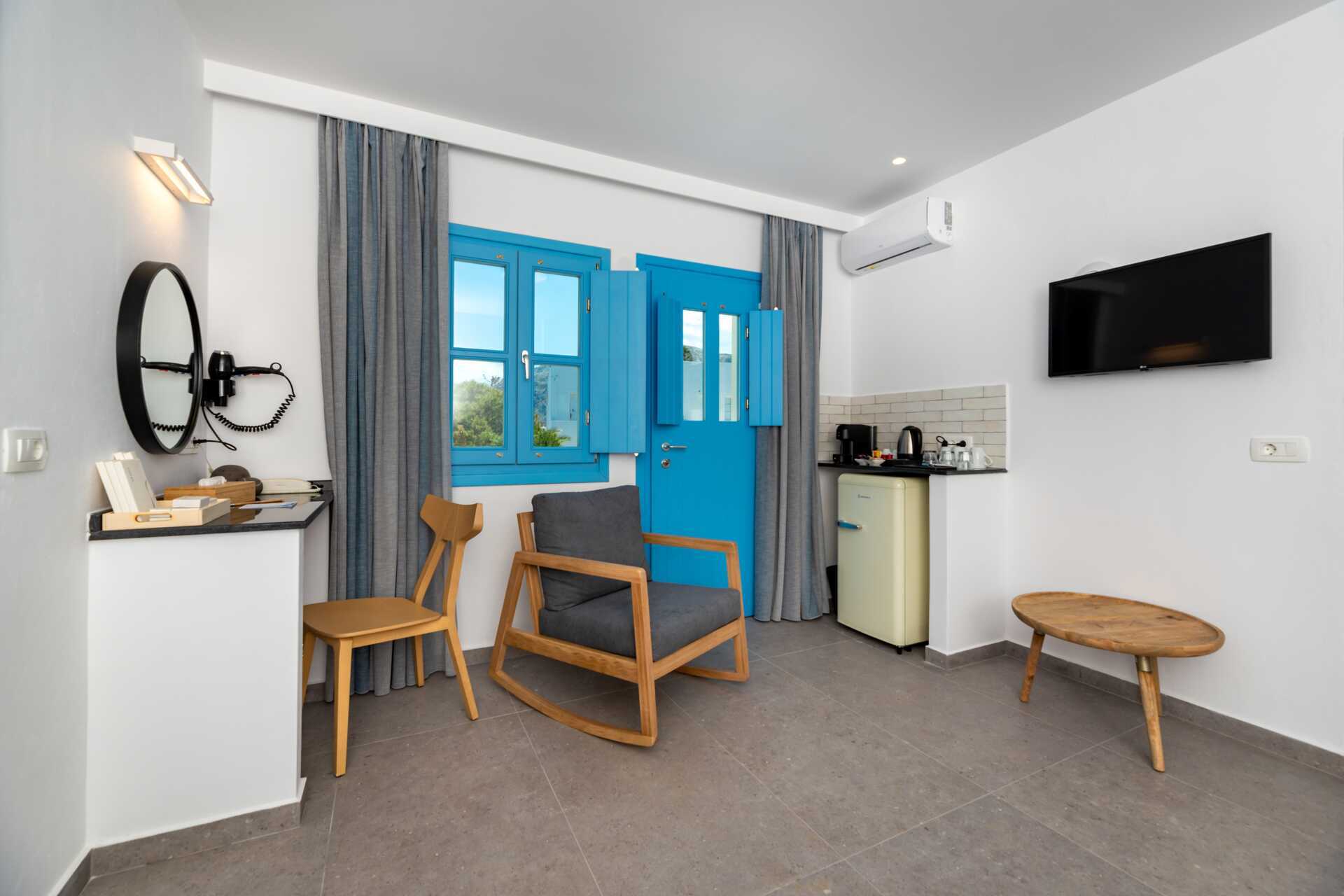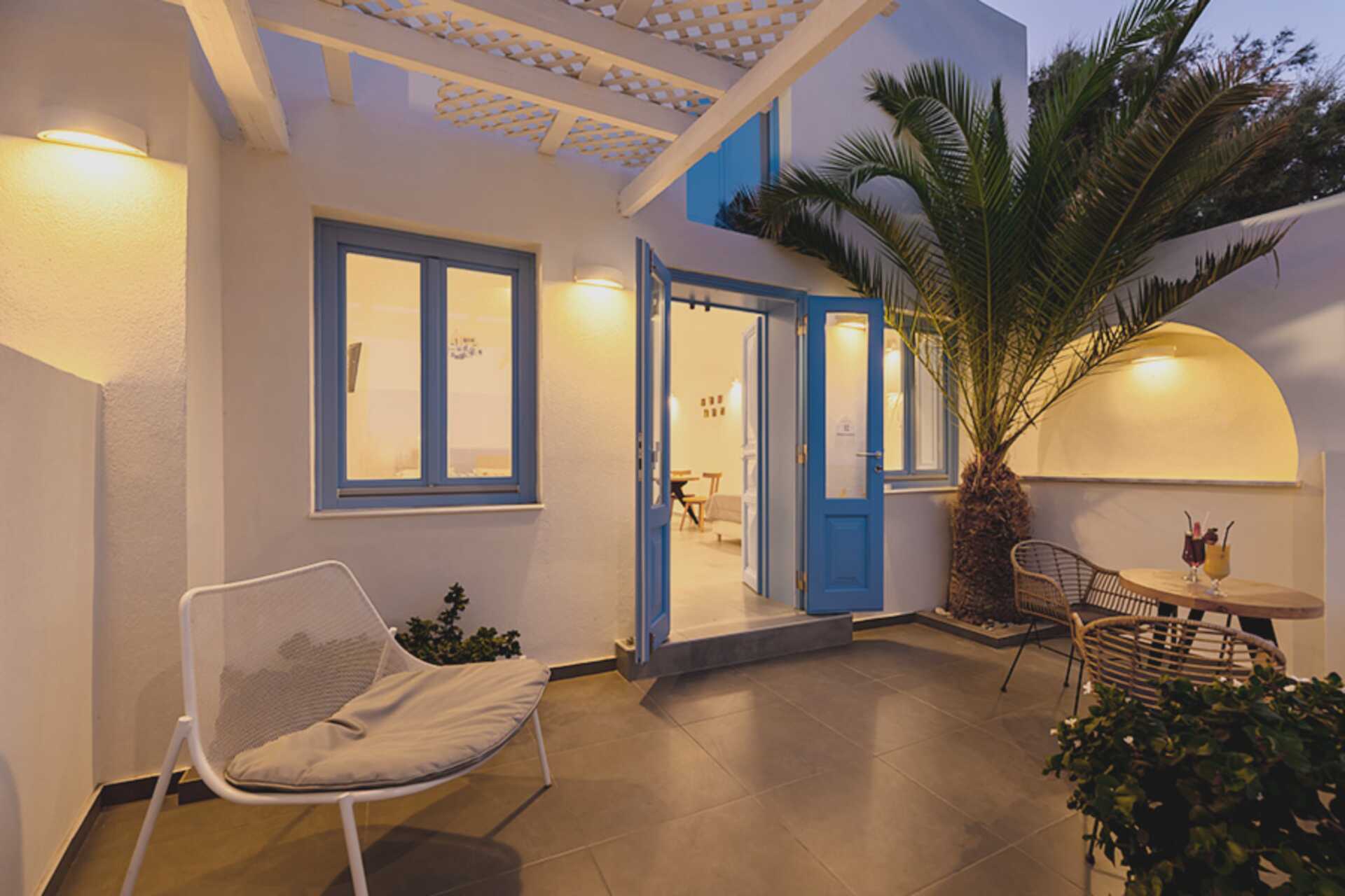 Suite med terrasse i stueplan. Der er en låge på terrassen. Soveværelse og et opholdsrum. En dobbeltseng. Mulighed for ekstra opredning i sovesofa. Pudemenu. Gratis wifi, aircondition og deponering. Køleskab. Kaffemaskine. Espresso Illy kaffemaskine. El-kedel og kaffe/te. Tv med internationale kanaler. Strandtaske med pool- og strandhåndklæder. Badekåber og tøfler. Hårtørrer. Badeværelse med bruser og toilet. Rengøring 7 gange om ugen. Børn under to år tæller med i det maksimale antal personer på værelset.