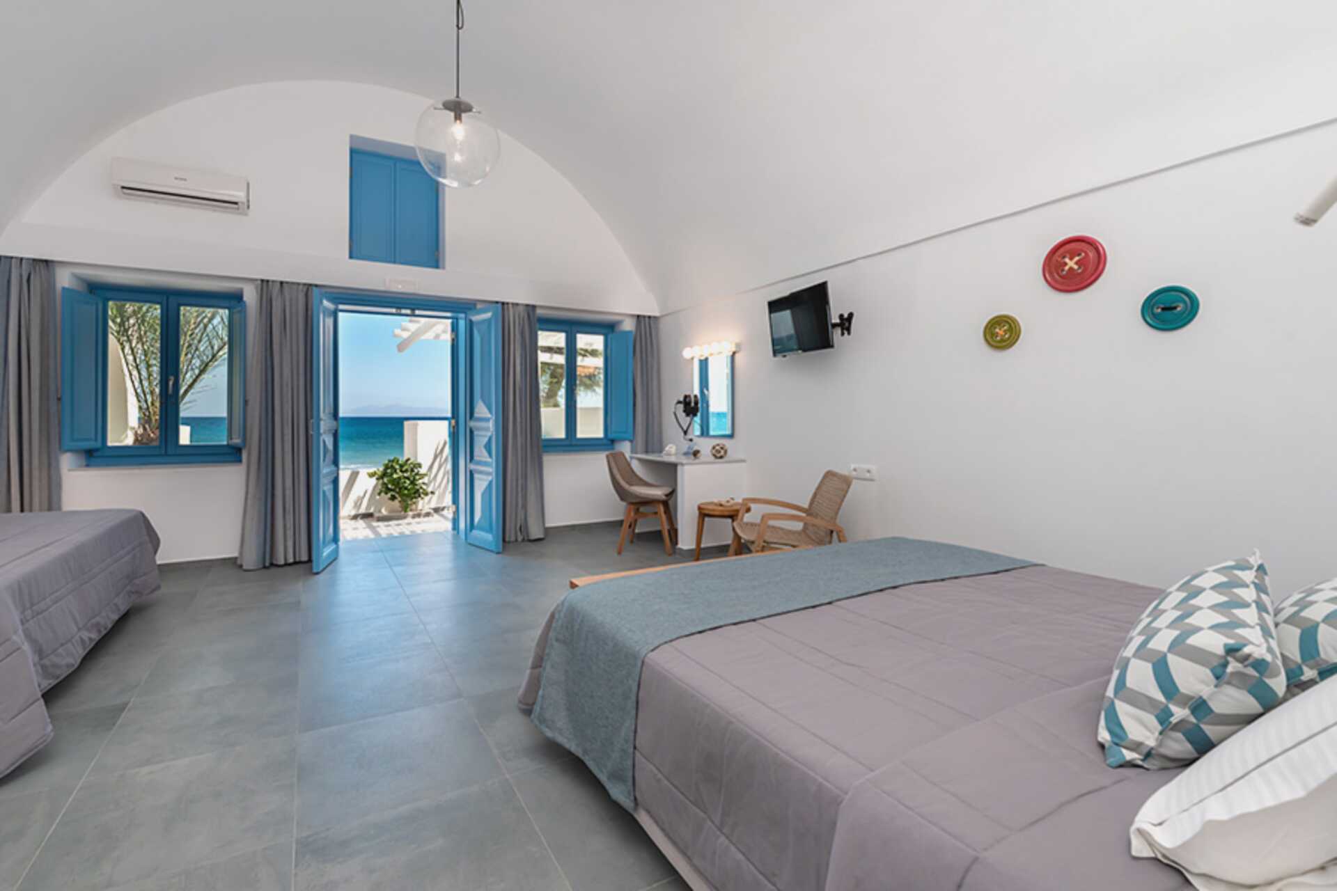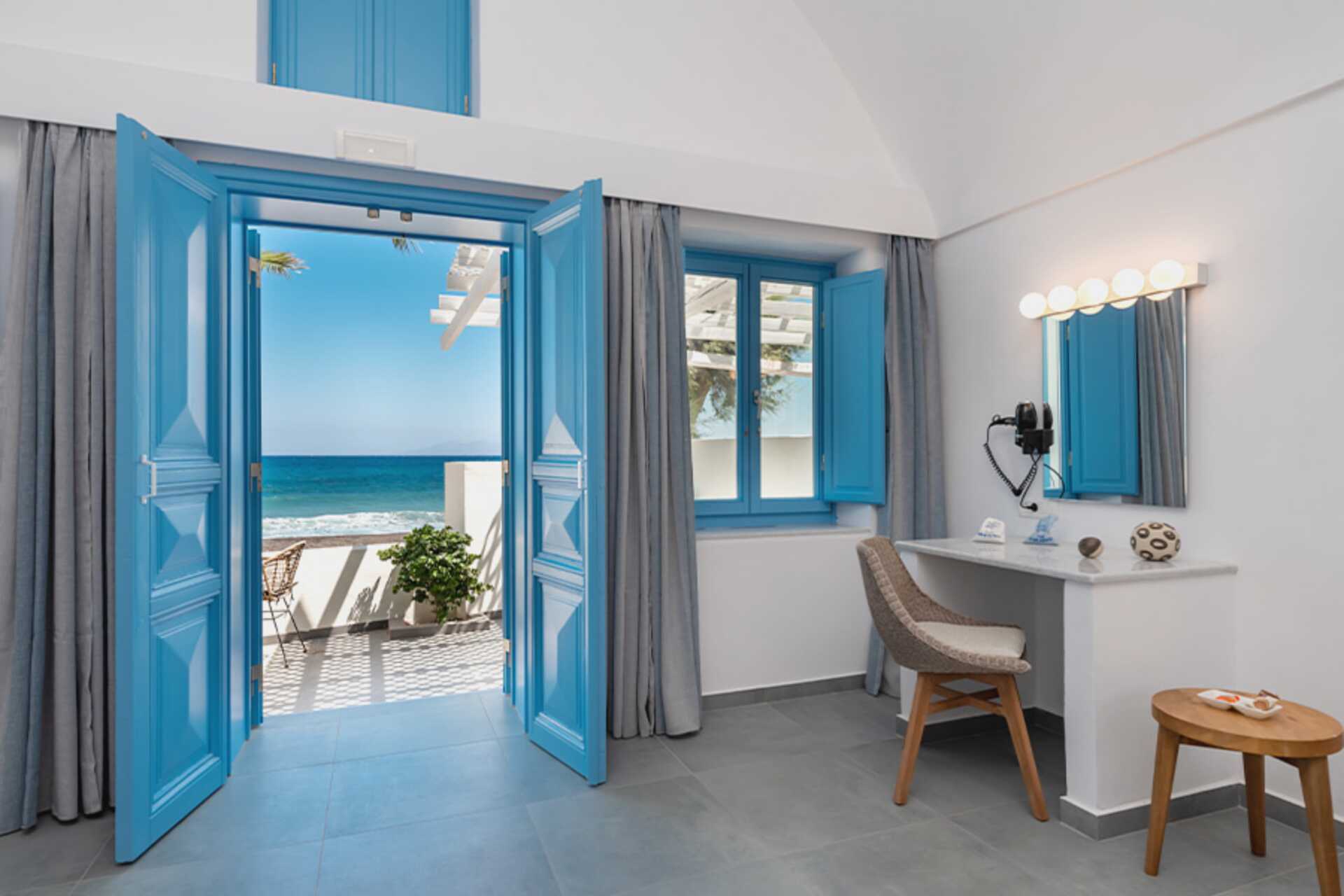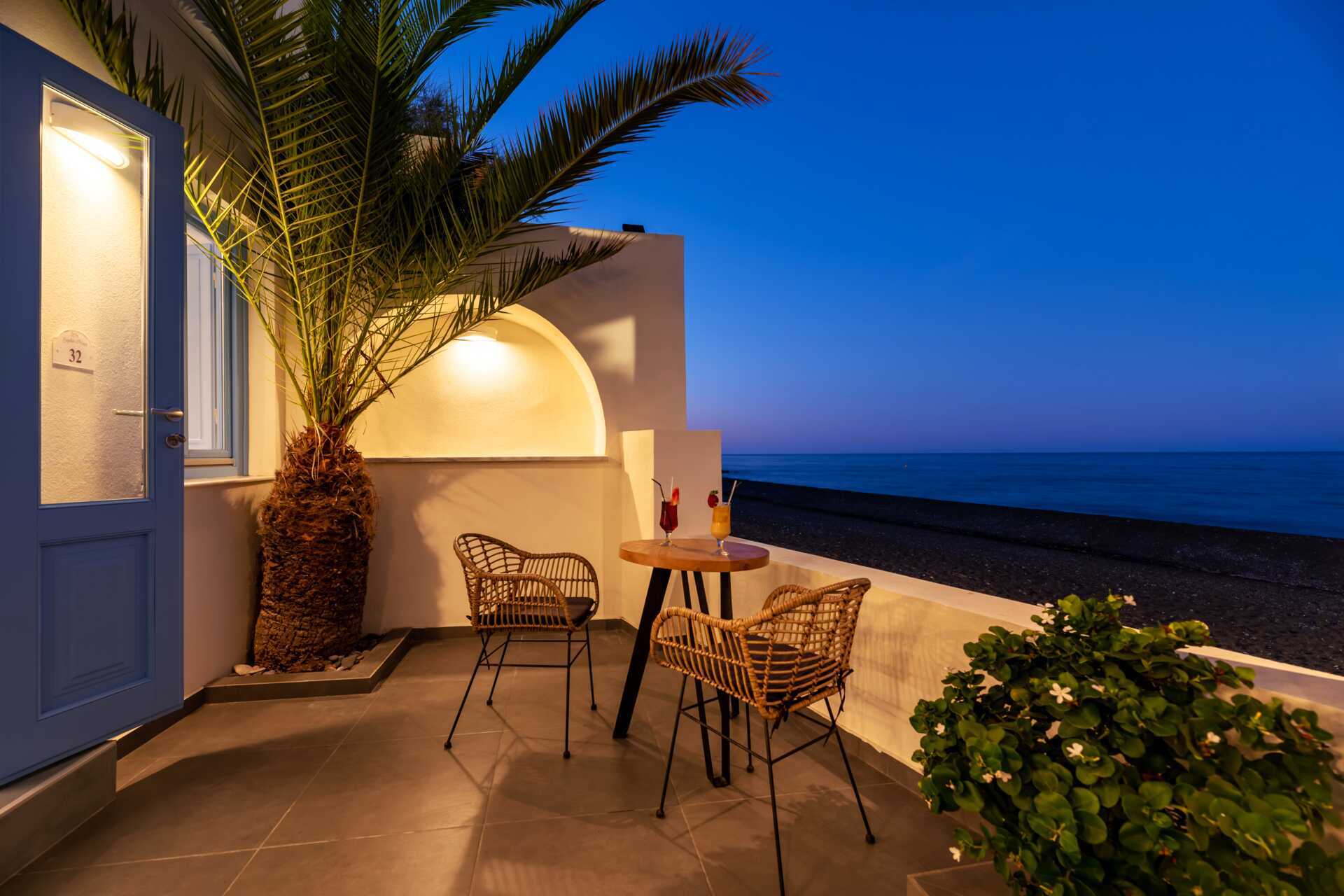 Deluxe-suite med terrasse i stueplan og havudsigt. Suiten ligger tættest på stranden og består af et soveværelse og et opholdsrum. En dobbeltseng. Mulighed for ekstra opredning i sovesofa. Gratis wifi, aircondition og deponering. Køleskab. Espresso Illy kaffemaskine. El-kedel. Tv med internationale kanaler. Strandtaske med pool- og strandhåndklæder. Badekåber og tøfler. Hårtørrer. Badeværelse med bruser og toilet. Rengøring 7 gange om ugen. Børn under to år tæller med i det maksimale antal personer på værelset.