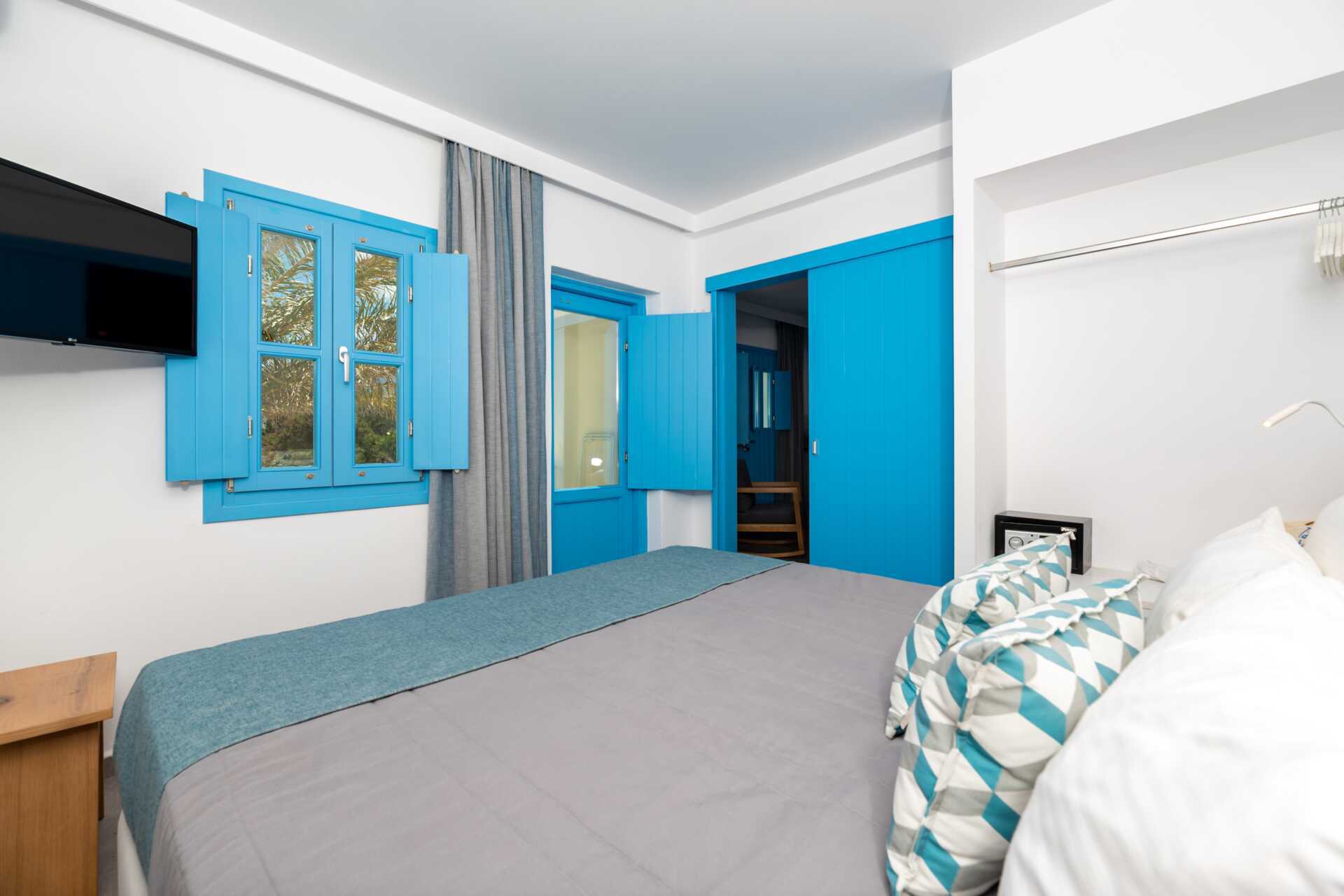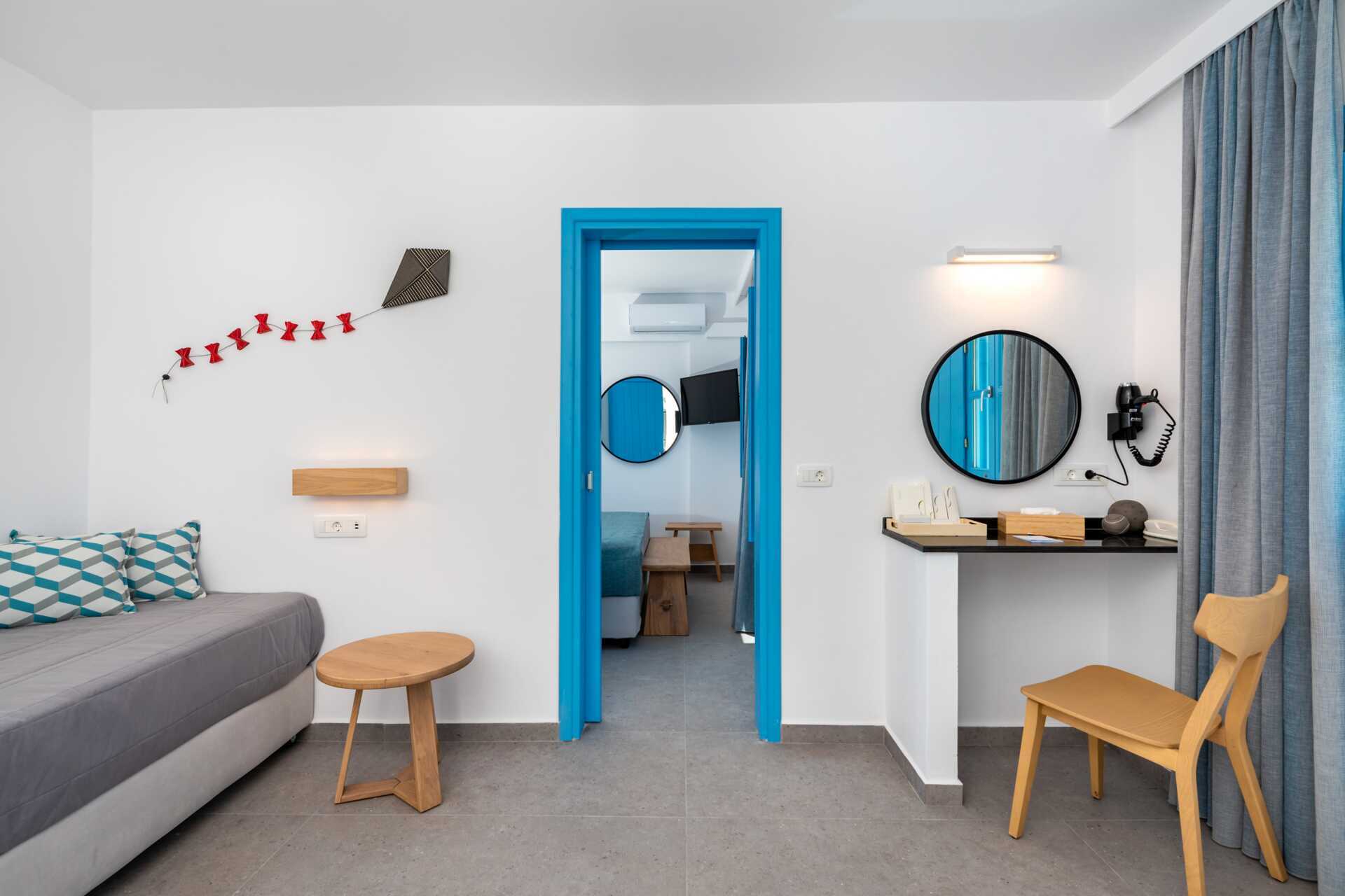 Superior-suite med balkon i stueplan og delvis havudsigt. Suiterne består af et soveværelse og et opholdsrum. En dobbeltseng. Mulighed for ekstra opredning i sovesofa. Gratis wifi, aircondition og deponering. Køleskab. Espresso Illy kaffemaskine. El-kedel. Tv med internationale kanaler. Strandtaske med pool- og strandhåndklæder. Badekåber og tøfler. Hårtørrer. Badeværelse med bruser og toilet. Rengøring 7 gange om ugen. Børn under to år tæller med i det maksimale antal personer på værelset.