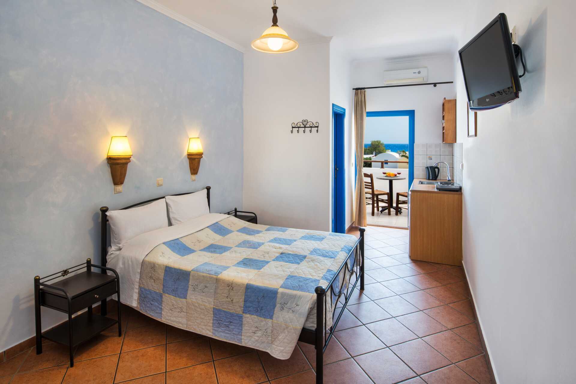 1-værelses lejligheder med balkon eller terrasse. Kombineret soveværelse med minikøkken. To enkeltsenge eller en dobbeltseng eller alternativt en dobbeltseng og en enkeltseng. Minikøkken med kogeplader, køleskab, el-kedel og enkelt køkkenudstyr. Gratis wifi, aircondition og deponering. Tv med satellitkanaler. Hårtørrer. Badeværelse med bruser og toilet.