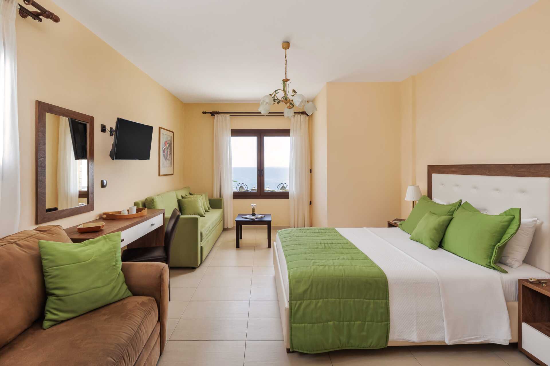 Familie-værelse med terrasse og havudsigt. Familie-værelserne består af et soveværelse og et opholdsrum. En dobbeltseng. Mulighed for ekstra opredninger i sovesofa. Gratis wifi, aircondition og deponering. Køleskab. El-kedel. Tv med lokale kanaler. Hårtørrer. Badeværelse med badekar eller bruser samt toilet. Rengøring 7 gange om ugen.