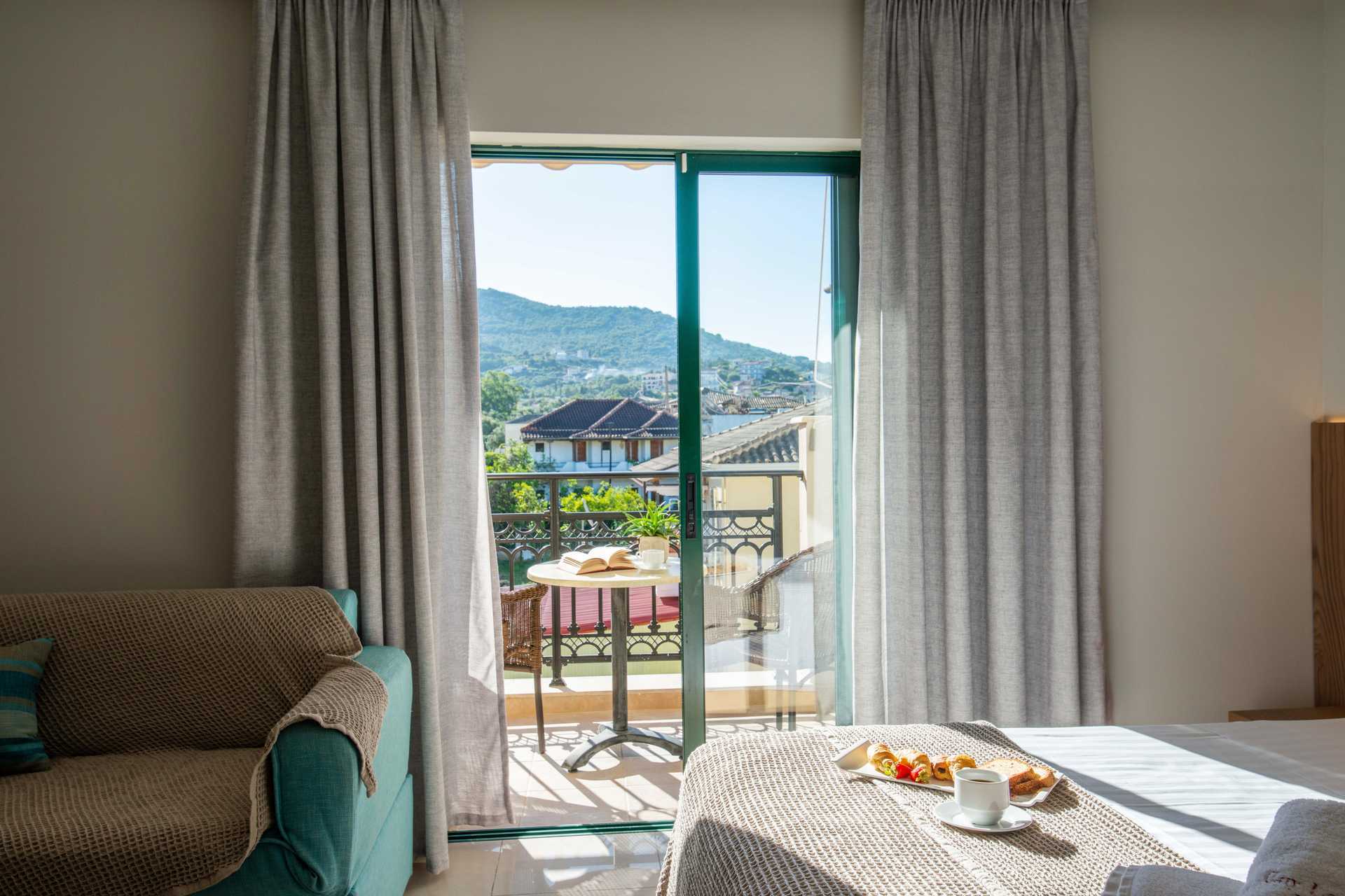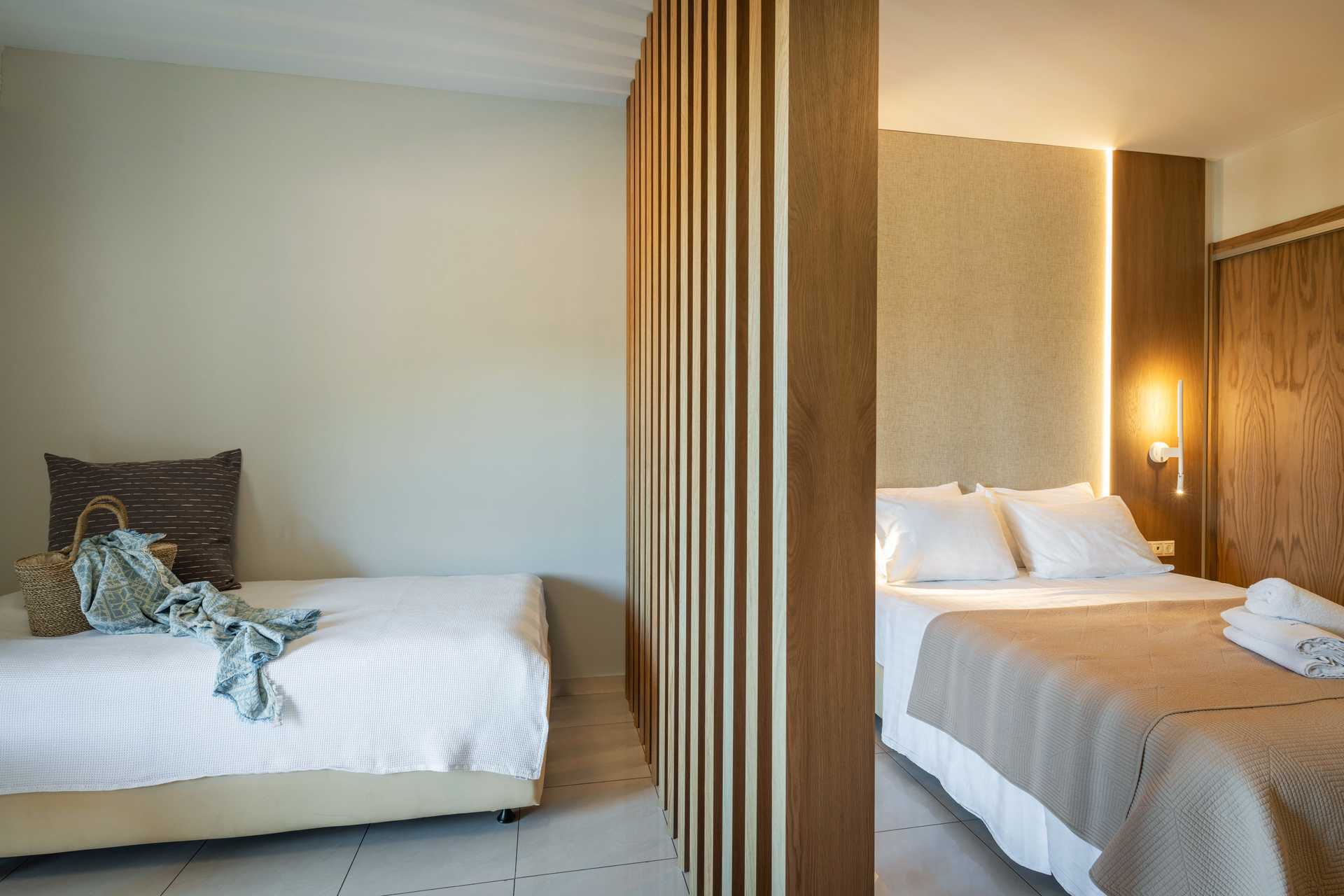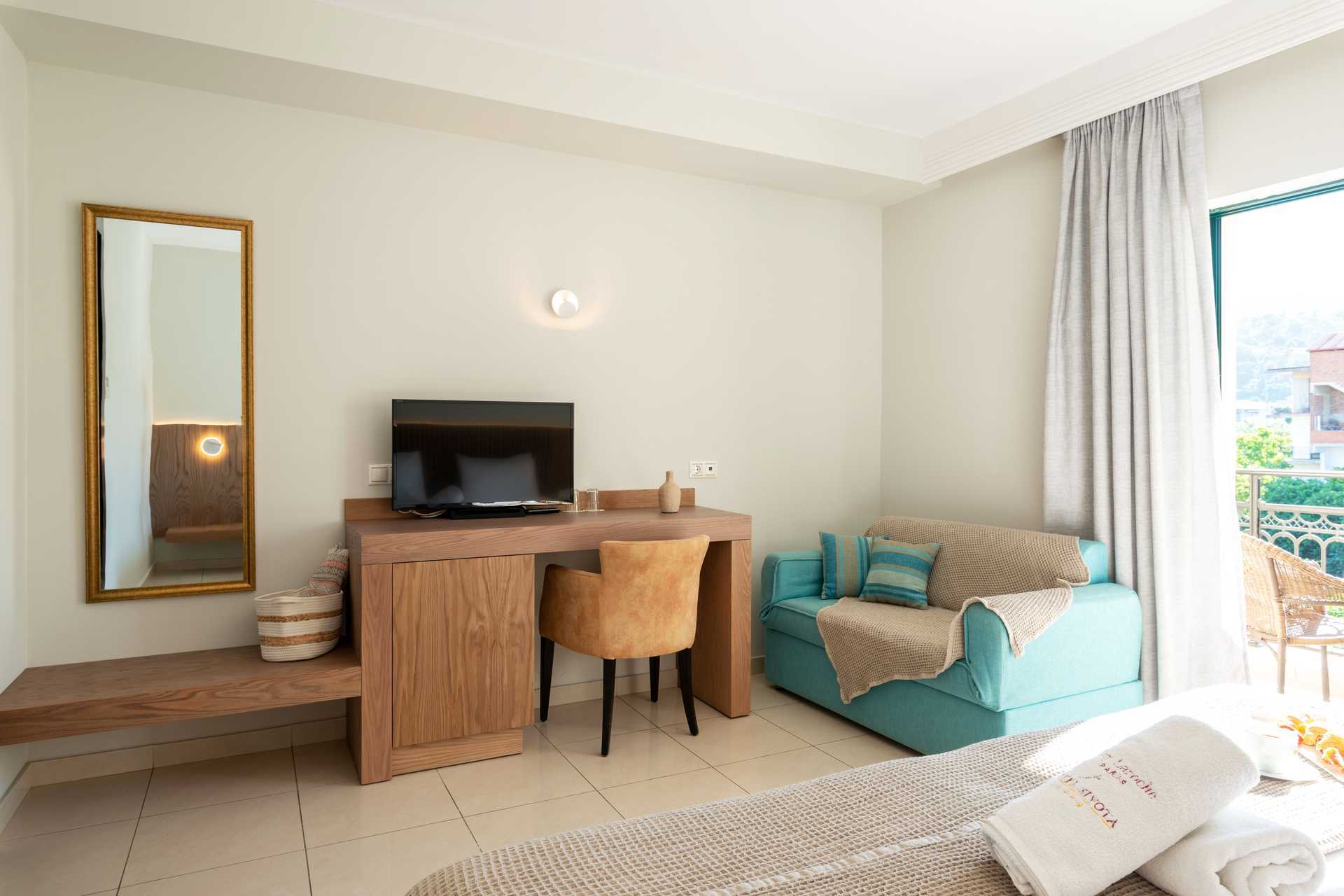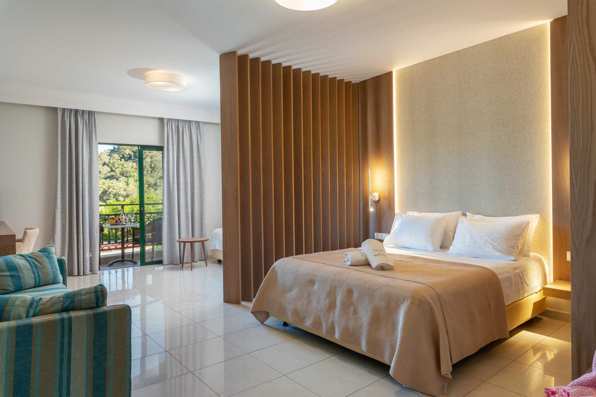 Familie-værelse deluxe med balkon. Familie-værelset består af et soveværelse og et opholdsområde. En dobbeltseng. Mulighed for ekstra opredning i sovesofa. Gratis wifi, aircondition og deponering. Køleskab. Tv med internationale kanaler. Hårtørrer. Badeværelse med bruser og toilet. Rengøring 7 gange om ugen.