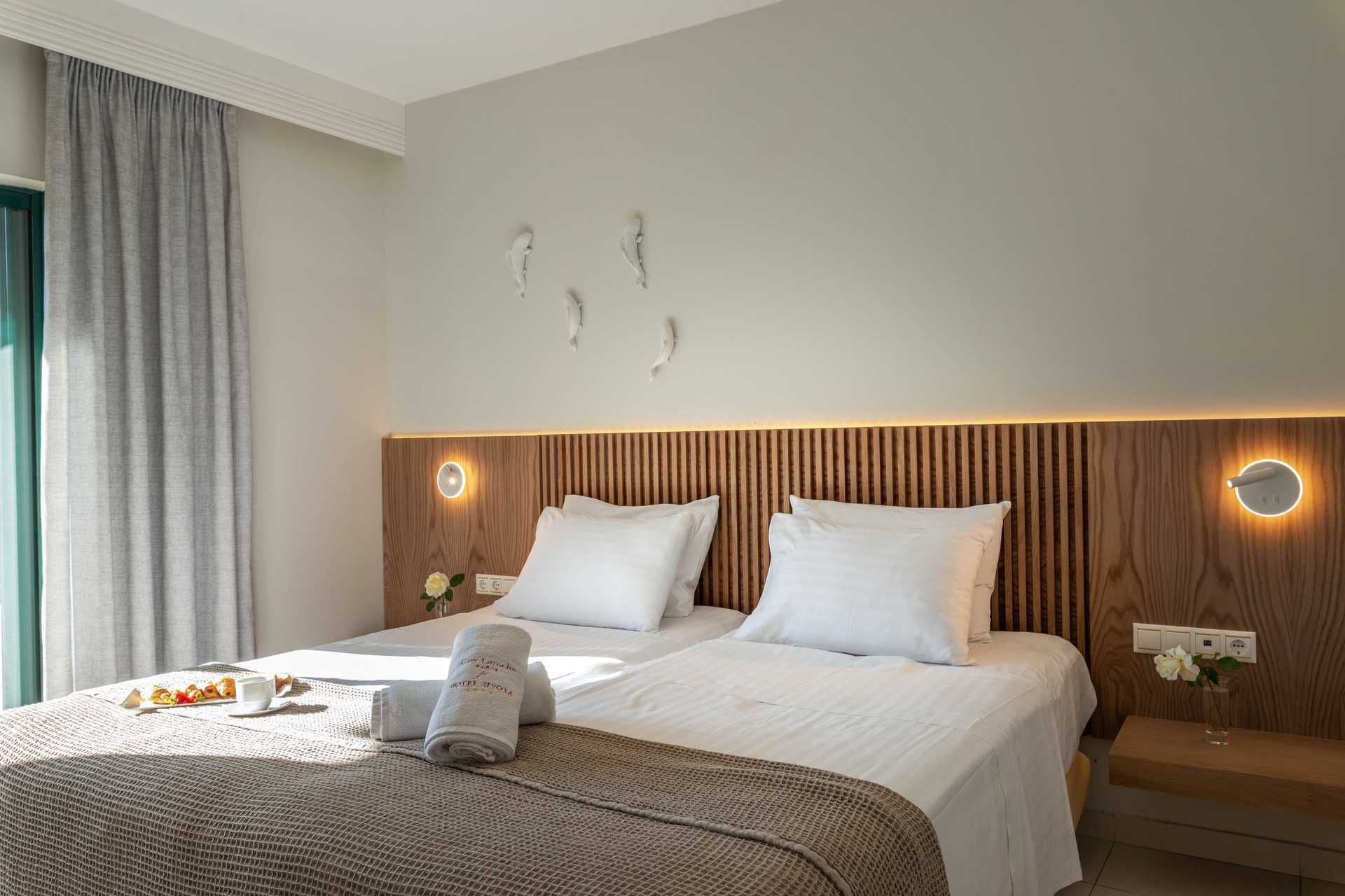 Deluxe-værelse med balkon. To enkeltsenge. Mulighed for ekstra opredning i sovesofa. Gratis wifi, aircondition og deponering. Køleskab. Tv med internationale kanaler. Hårtørrer. Badeværelse med bruser og toilet. Rengøring 7 gange om ugen.