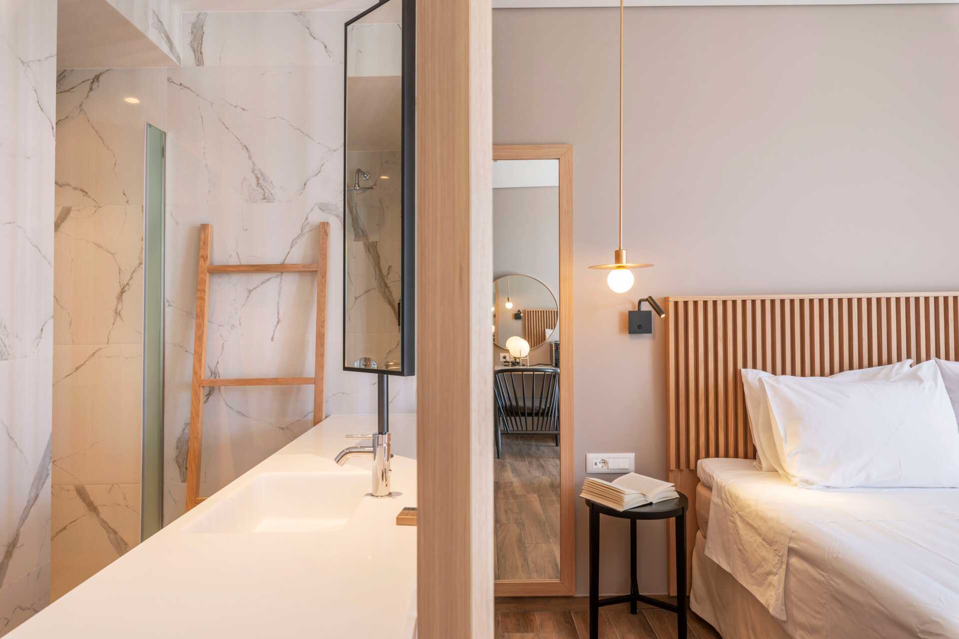 Handicapvenlige dobbeltværelser med udeplads med privat pool. Sovekomforten er høj med komfortabel dobbeltseng og sengetøj fra CocoMat. Gratis wifi, deponering og aircondition. Kaffemaskine, kapsler ved ankomst og derefter mod betaling. Køleskab. Tv med internationale kanaler. Bluetooth højtalere kan lånes i receptionen mod depositum. Hårtørrer. Badeværelse med bruser og toilet. Rengøring 7 gange om ugen.