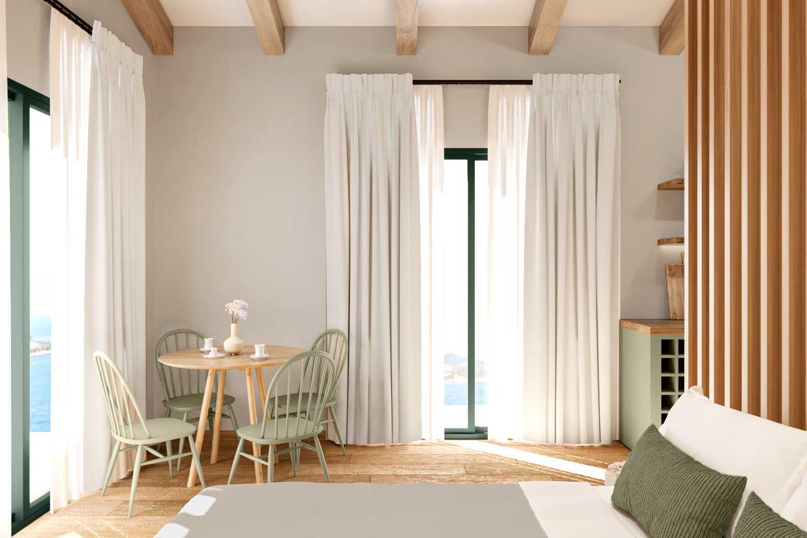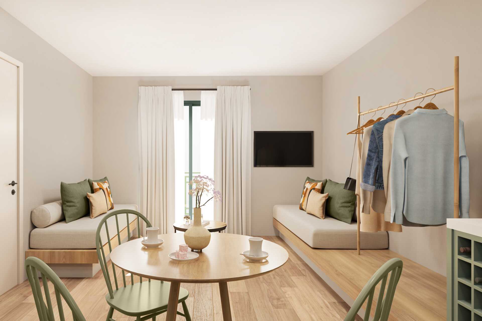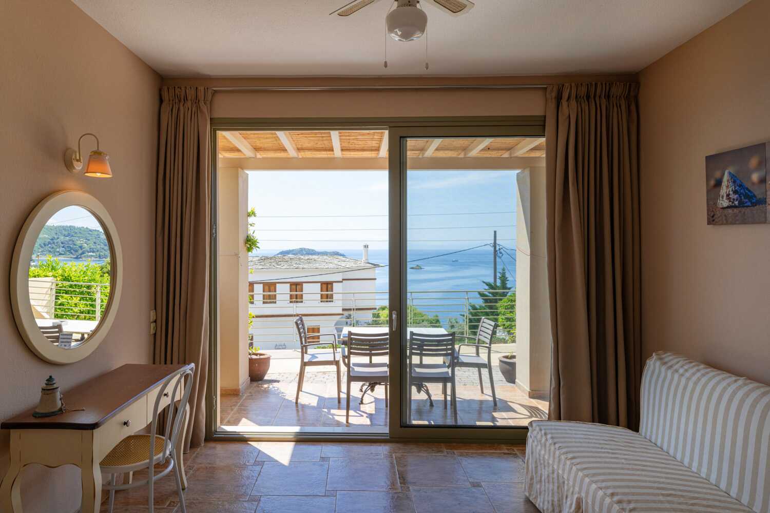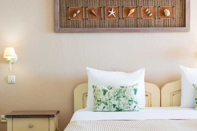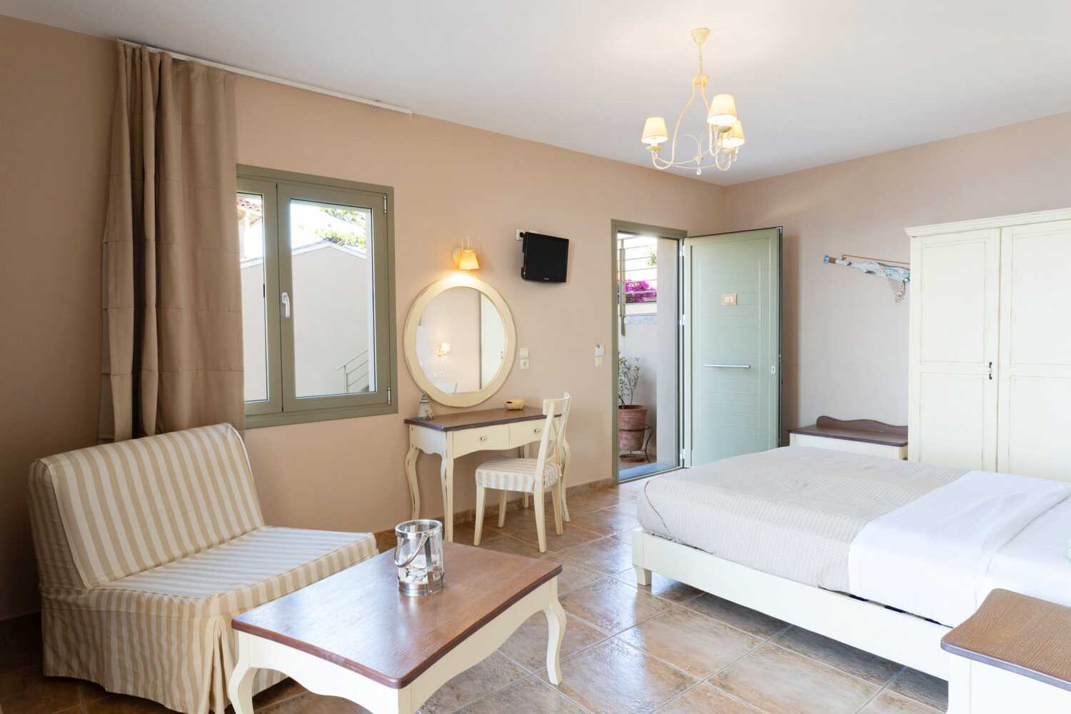 1-værelses lejlighed med balkon og havudsigt eller med balkon i stueplan og delvis havudsigt. Kombineret soveværelse med minikøkken. En dobbeltseng. Mulighed for en ekstra opredning i sovesofaen. Minikøkken med kogeplader, køleskab, el-kedel, kaffemaskine, brødrister og enkelt køkkenudstyr. Gratis wifi, aircondition og deponering. Tv med lokale kanaler. Hårtørrer. Badeværelse med bruser og toilet. Rengøring 6 gange om ugen.