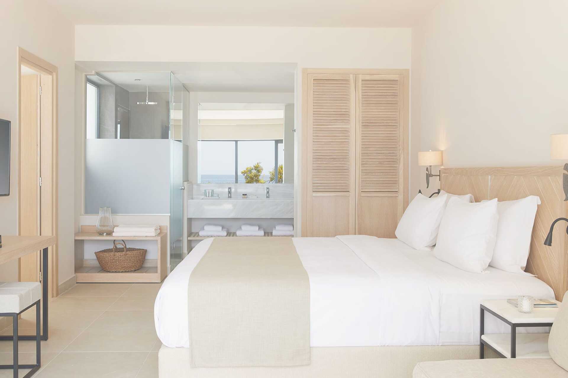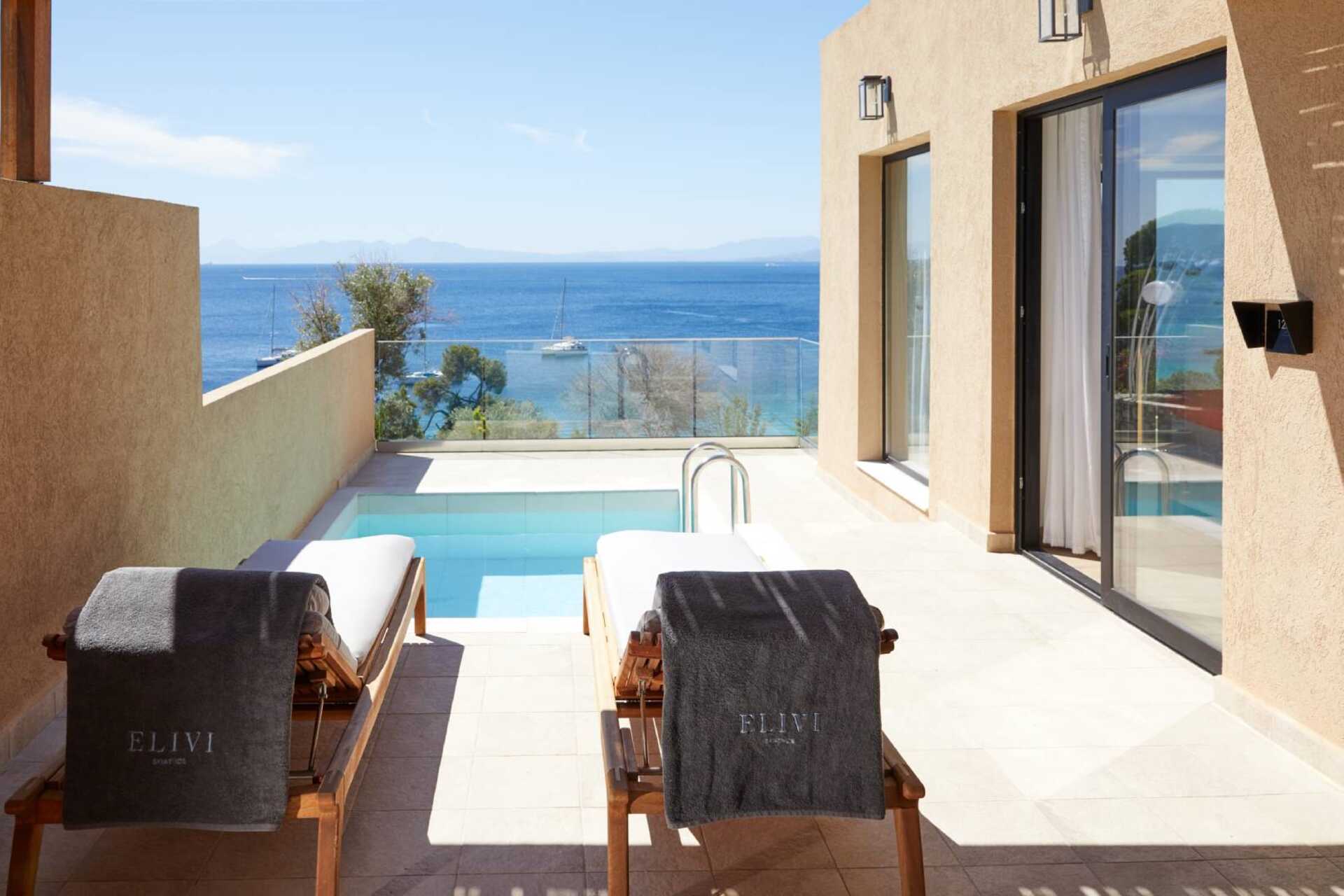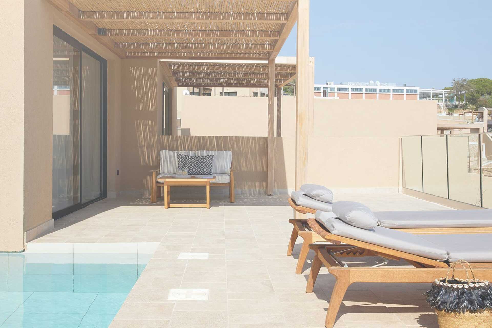 Junior-suiter med privat pool. På terrassen i stueplan er der en sofa og et bord, solstole og en stige ned til poolen. Suiten ligger i Grace-området. En dobbeltseng. Mulighed for ekstra opredning i sovesofa. Pudemenu. Gratis wifi, aircondition og deponering. Køleskab. Nespresso-maskine og el-kedel. Tv med internationale kanaler. Hårtørrer. Badeværelse med bruser og toilet. Rengøring 7 gange om ugen.