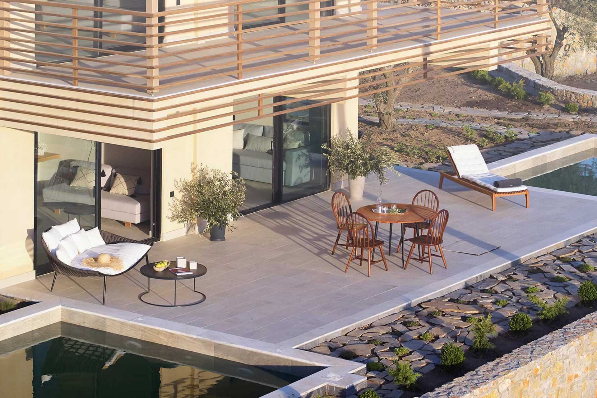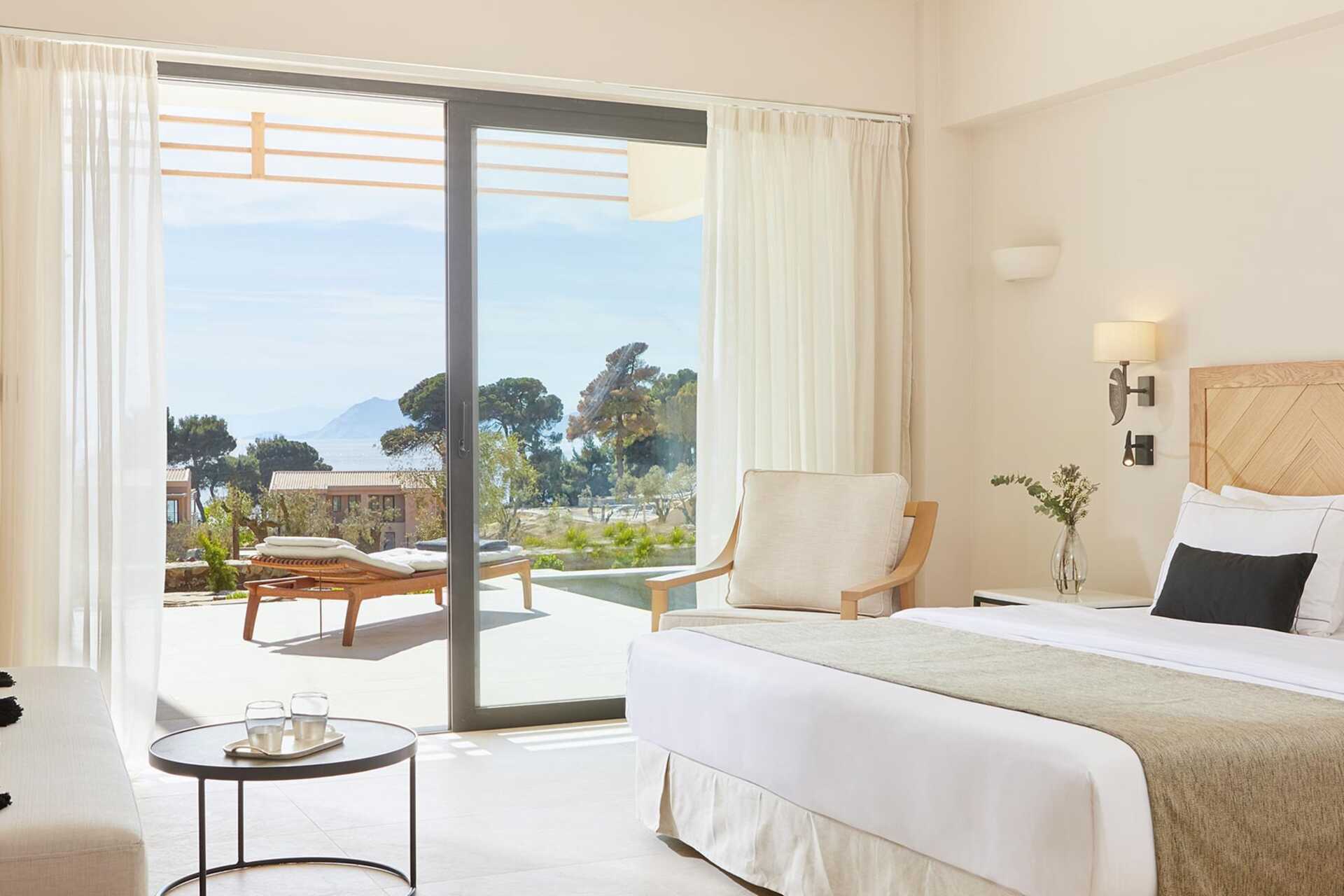 Dobbeltværelse med terrasse og adgang til delt pool. På terrassen i stueetagen er der borde og stole, solstole og en stige ned til poolen. Værelserne ligger i Xenia, som er hotellets hovedbygning. En dobbeltseng. Pudemenu. Gratis wifi, aircondition og deponering. Køleskab. Nespresso-maskine og el-kedel. Tv med internationale kanaler. Hårtørrer. Badeværelse med bruser og toilet. Rengøring 7 gange om ugen.