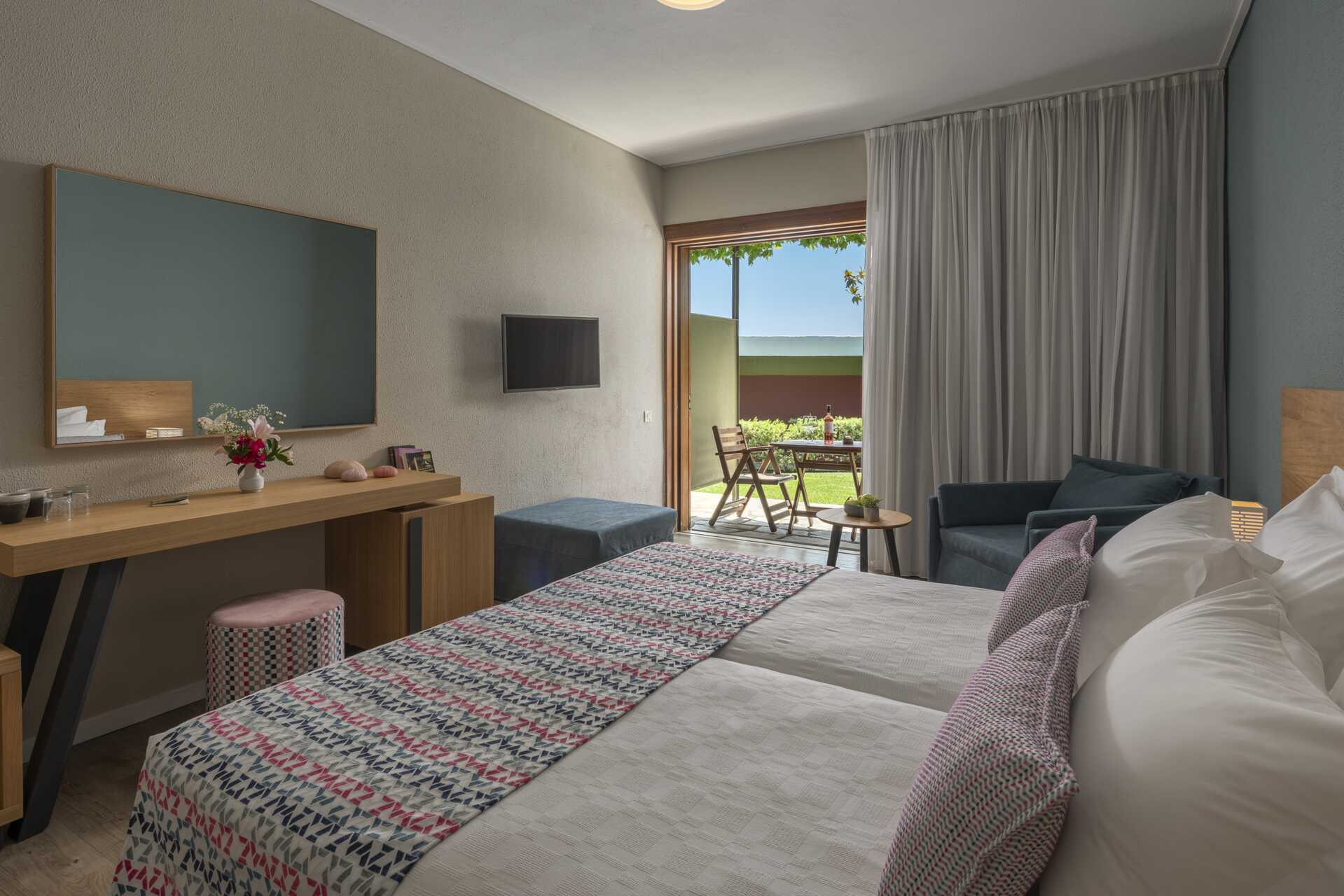 Dobbeltværelse med balkon eller terrasse. En dobbeltseng eller to enkeltsenge. Mulighed for ekstra opredning i lænestol. Gratis wifi, aircondition og deponering. Køleskab. El-kedel. Tv med internationale kanaler. Hårtørrer. Badeværelse med badekar og toilet. Rengøring 7 gange om ugen.