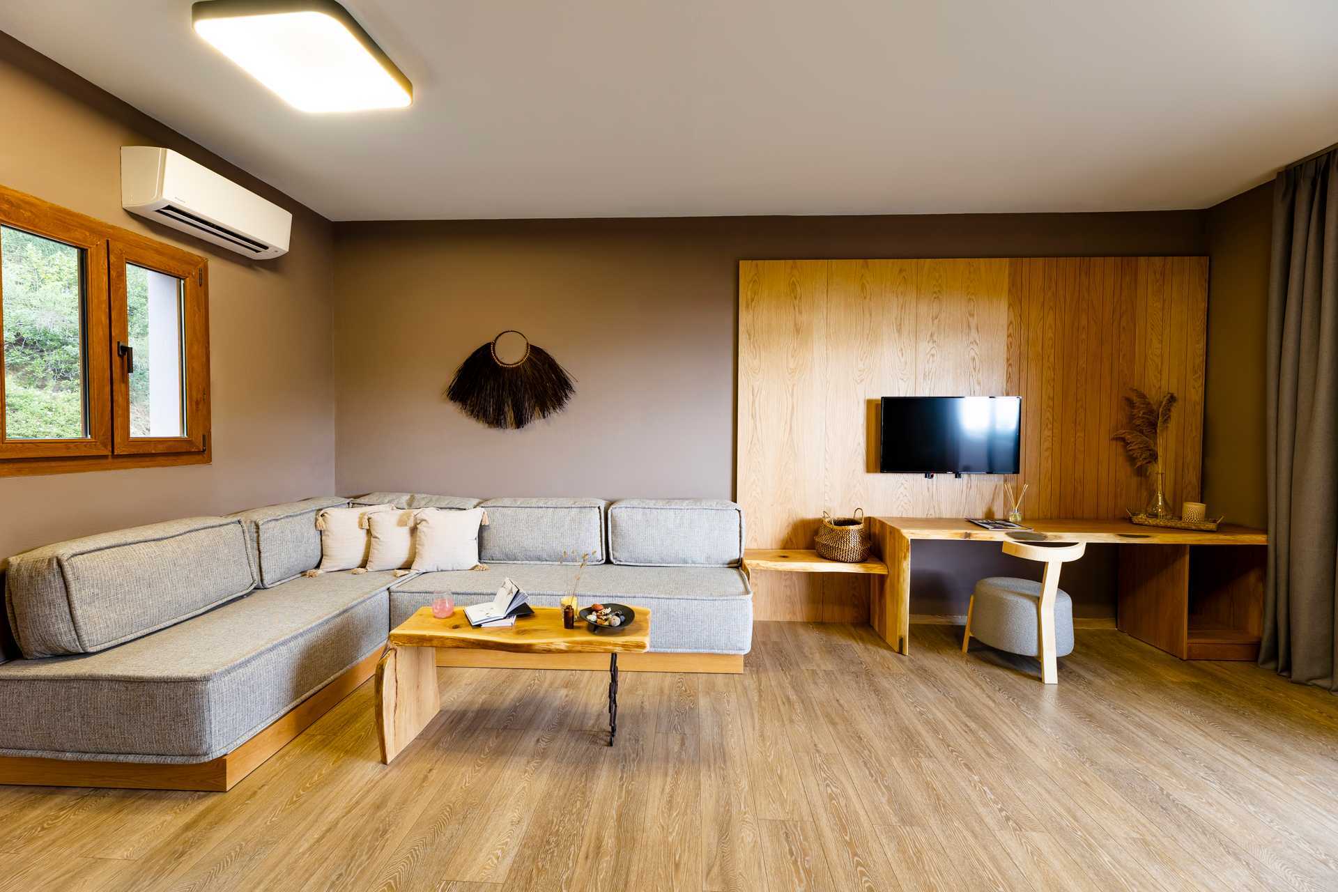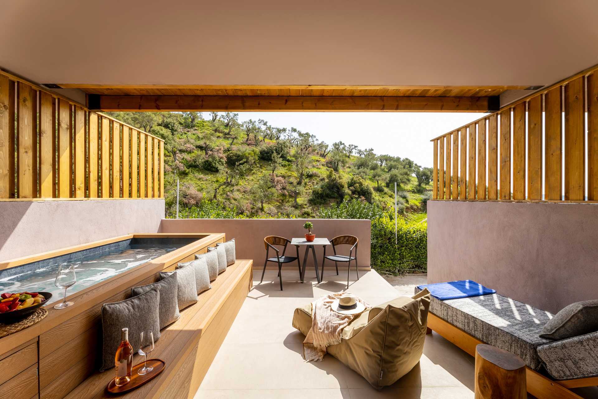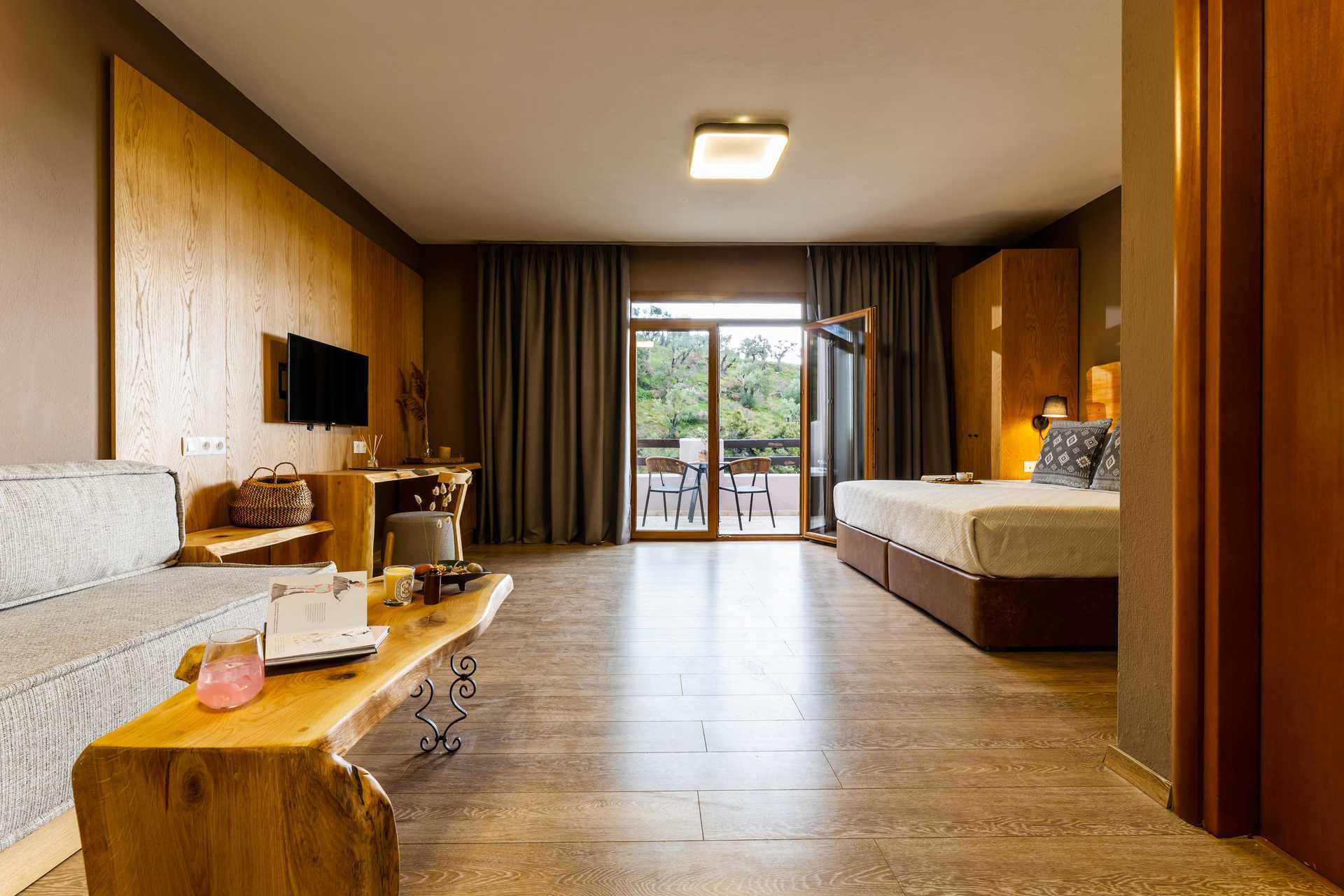 Suite med balkon i stueplan. Der er en privat jacuzzi på balkonen i stueetagen. En dobbeltseng eller to enkeltsenge. Opholdsrum med mulighed for ekstra opredning i sovesofa. Gratis wifi, aircondition og deponering. Minibar. El-kedel og kaffe/te. Espressomaskine. Tv med internationale kanaler. Tøfler. Hårtørrer. Badeværelse med bruser og toilet. Rengøring 7 gange om ugen.