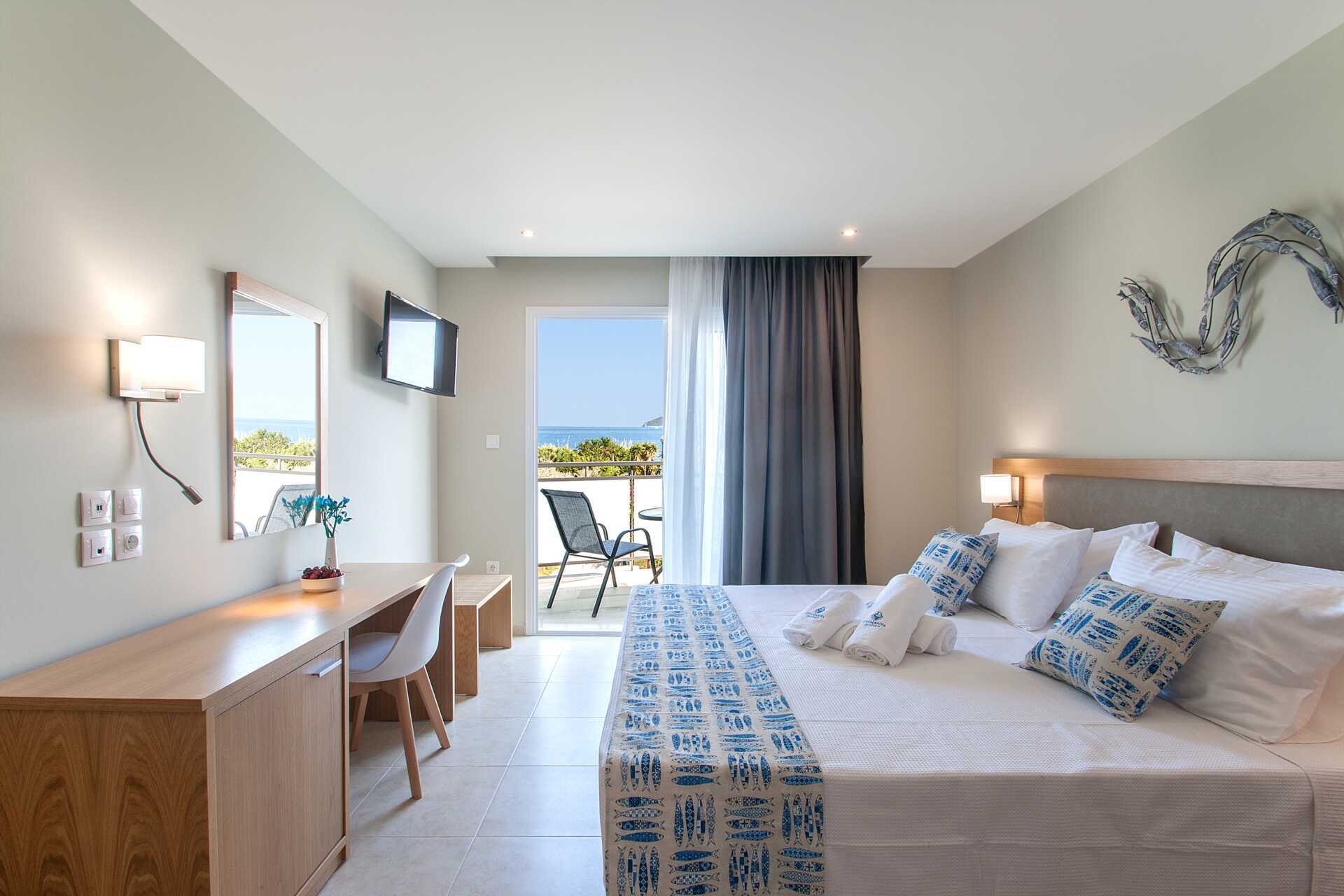 Deluxe-værelse med balkon eller balkon i stueplan med udsigt mod poolen. En dobbeltseng eller to enkeltsenge. Gratis wifi, aircondition og deponering. Køleskab. Tv med internationale kanaler. Hårtørrer. Badeværelse med bruser og toilet. Rengøring 6 gange om ugen.