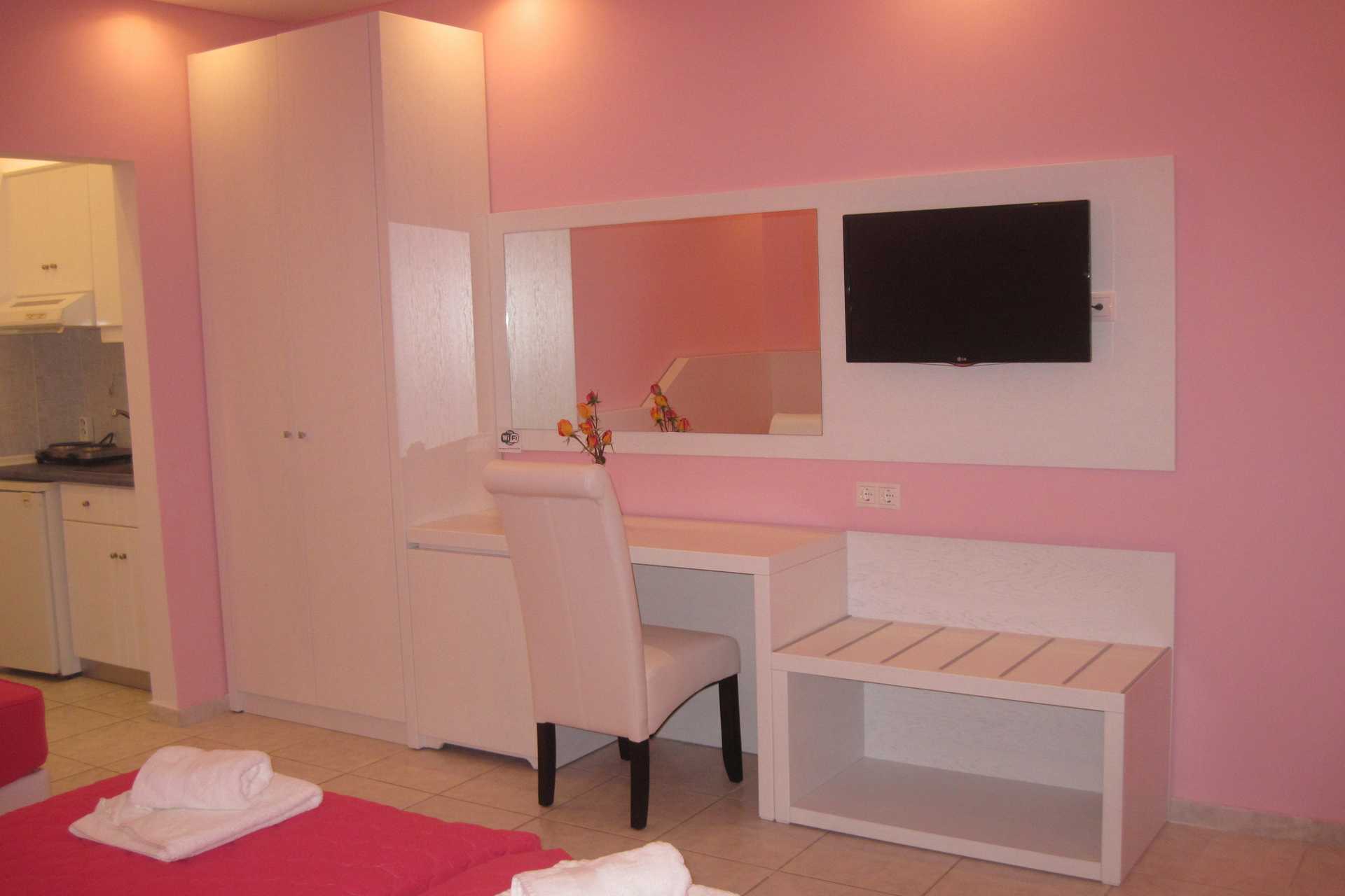 1-værelses lejlighed med balkon eller terrasse i stueplan med havudsigt. Kombineret soveværelse og minikøkken. To enkeltsenge. Mulighed for ekstra opredning i sovesofa. Kogeplader, køleskab, el-kedel og enkelt køkkenudstyr. Spiseområdet er udendørs. Gratis wifi og aircondition. Deponering mod betaling. Tv med lokale kanaler. Hårtørrer. Badeværelse med bruser og toilet. Rengøring 6 gange om ugen.
