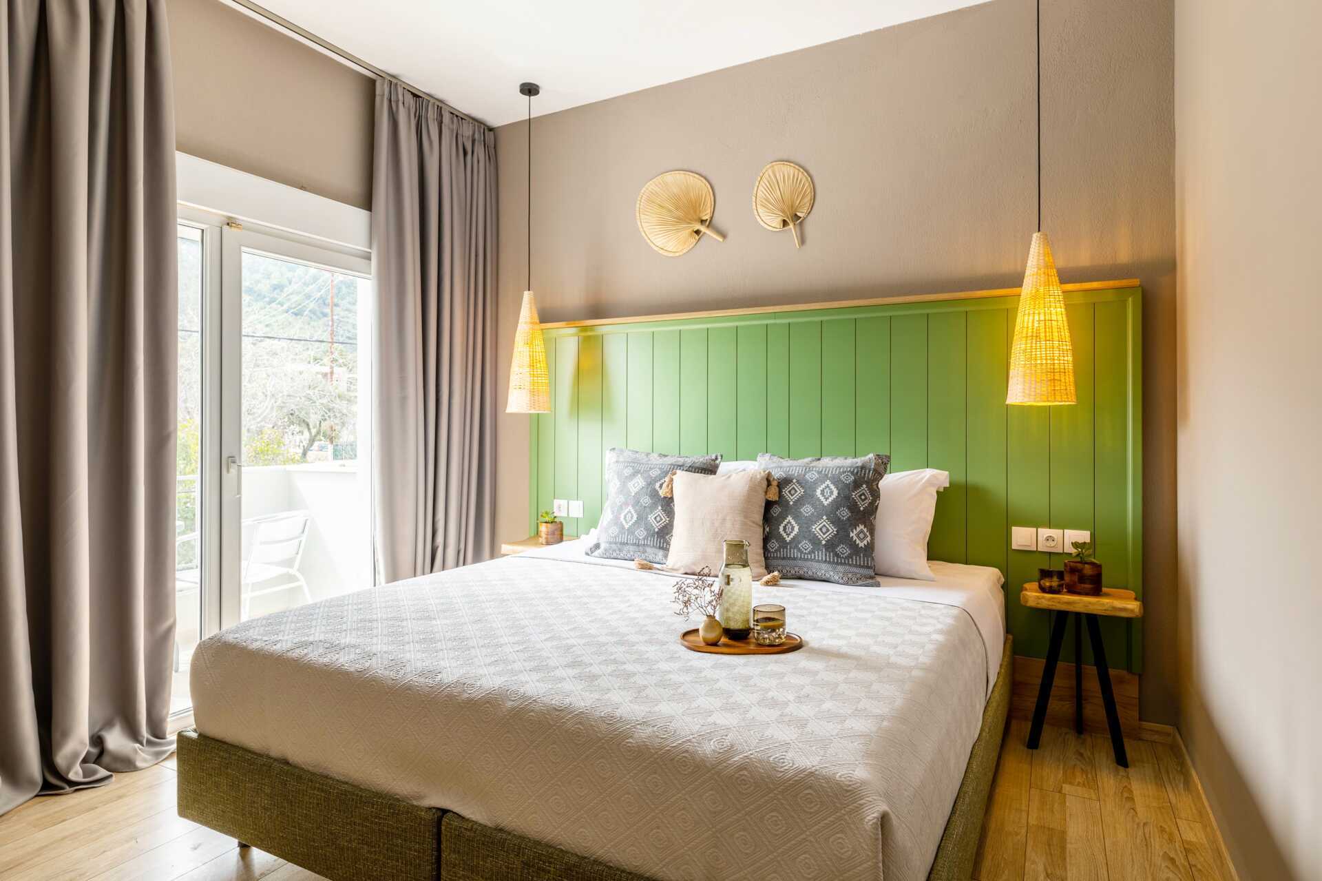 Dobbeltværelser med balkon eller terrasse. Værelserne er placeret i Theros-bygningen. En dobbeltseng eller to enkeltsenge. Gratis wifi, aircondition og deponering. Køleskab. El-kedel. Tv med internationale kanaler. Hårtørrer. Tøfler. Badeværelse med bruser og toilet. Rengøring 7 gange om ugen.