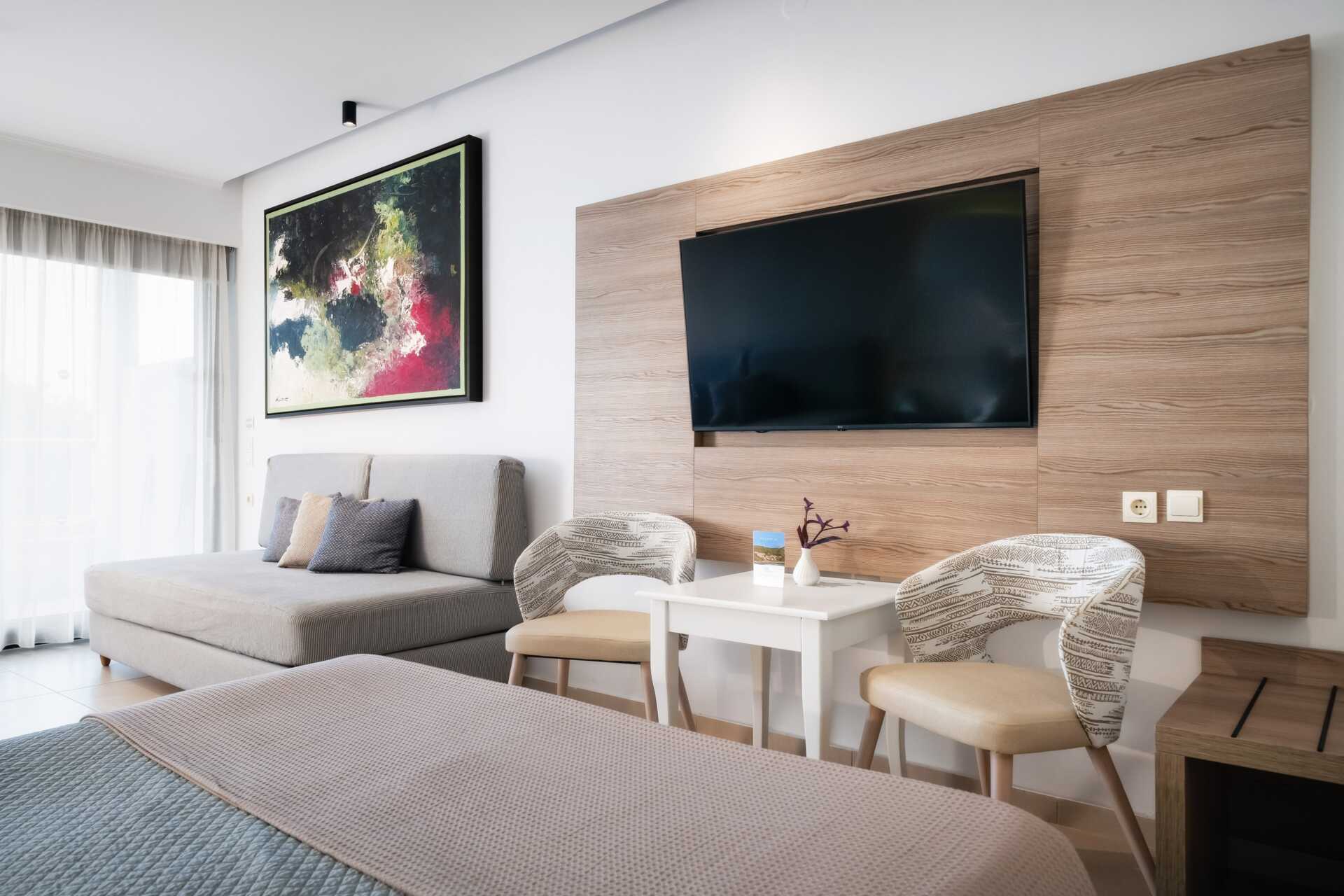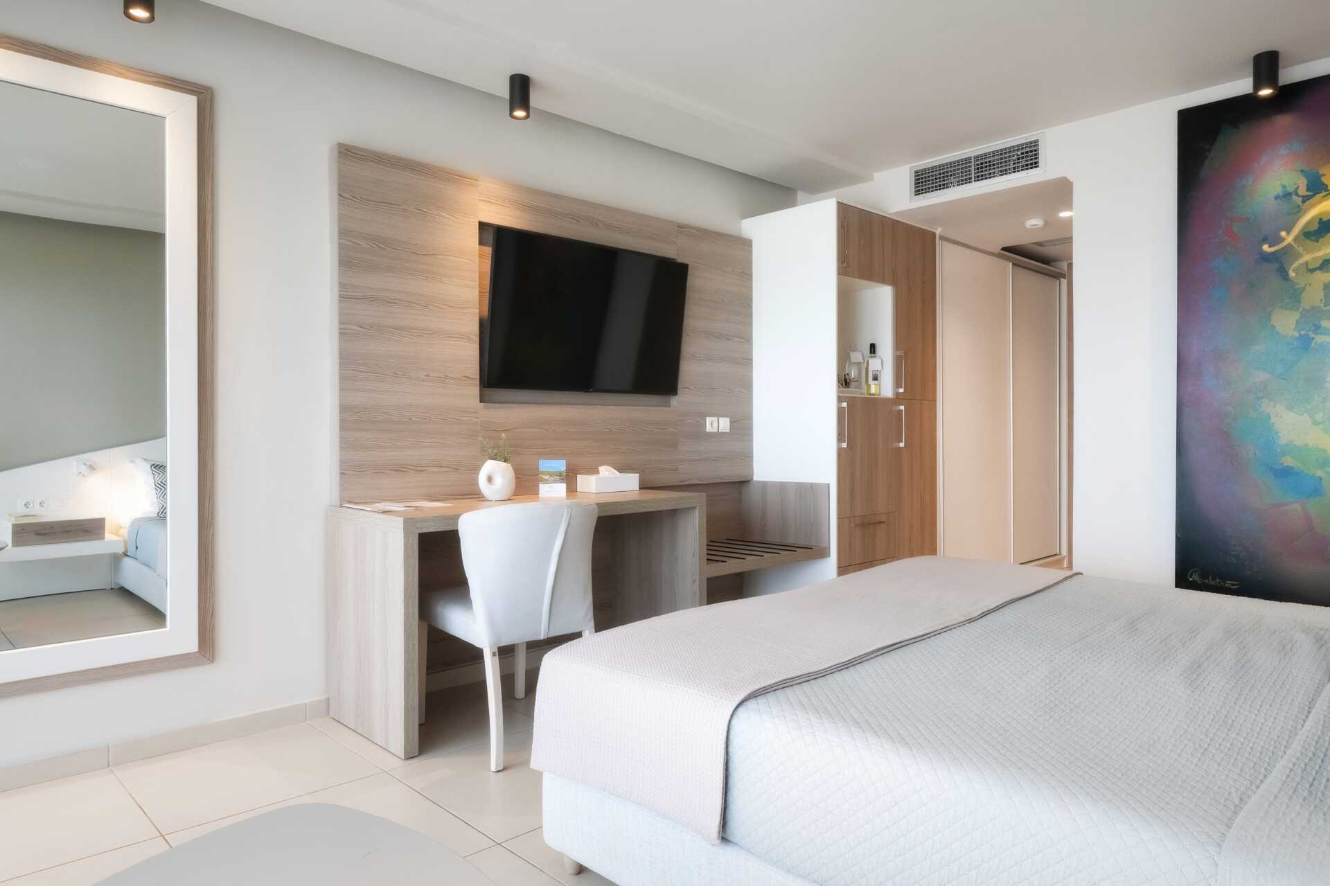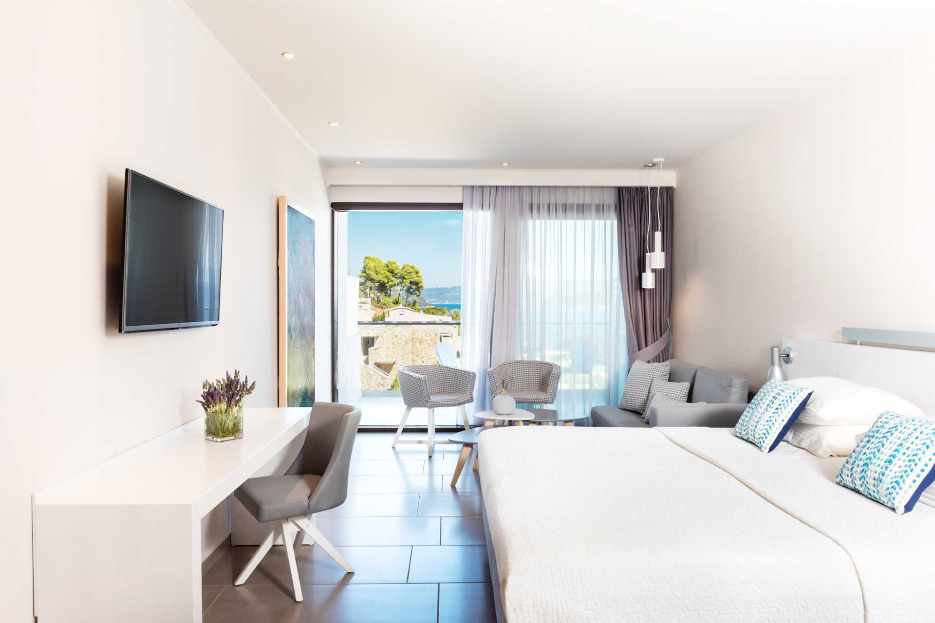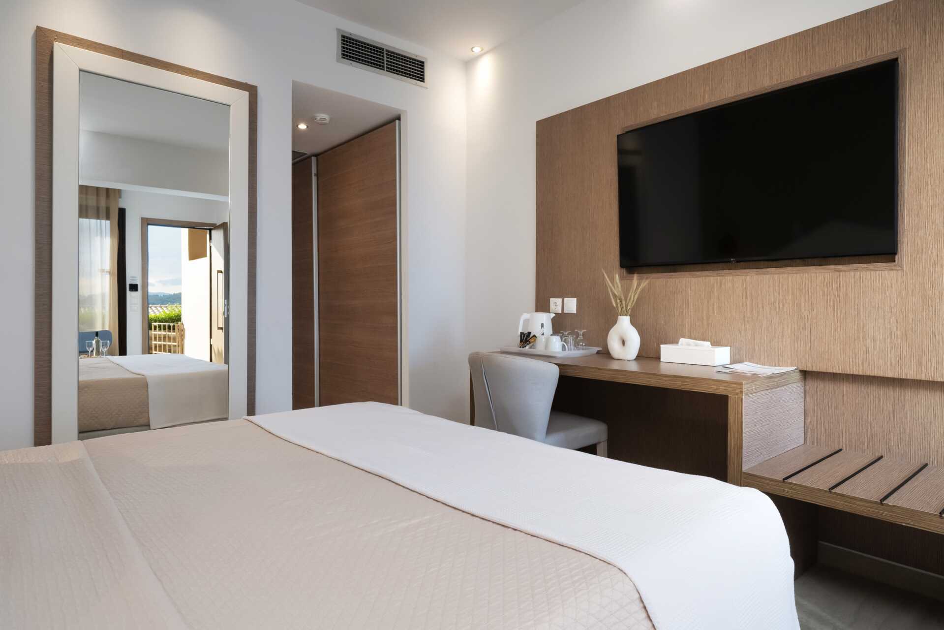 Større og renoverede dobbeltværelser med balkon eller terrasse, nogle med havudsigt eller udsigt til haven. En dobbeltseng. Gratis wifi, aircondition og deponering. Køleskab og el-kedel. Tv med internationale kanaler. Hårtørrer. Tøfler. Badeværelse med badekar eller bruser samt toilet. Rengøring 7 gange om ugen. Børn under to år tæller med i det maksimale antal personer på værelset. Billederne er skitser og vil blive opdateret, så snart Apollo modtager rigtige billeder fra hotellet. Skitserne kan afvige fra virkeligheden.