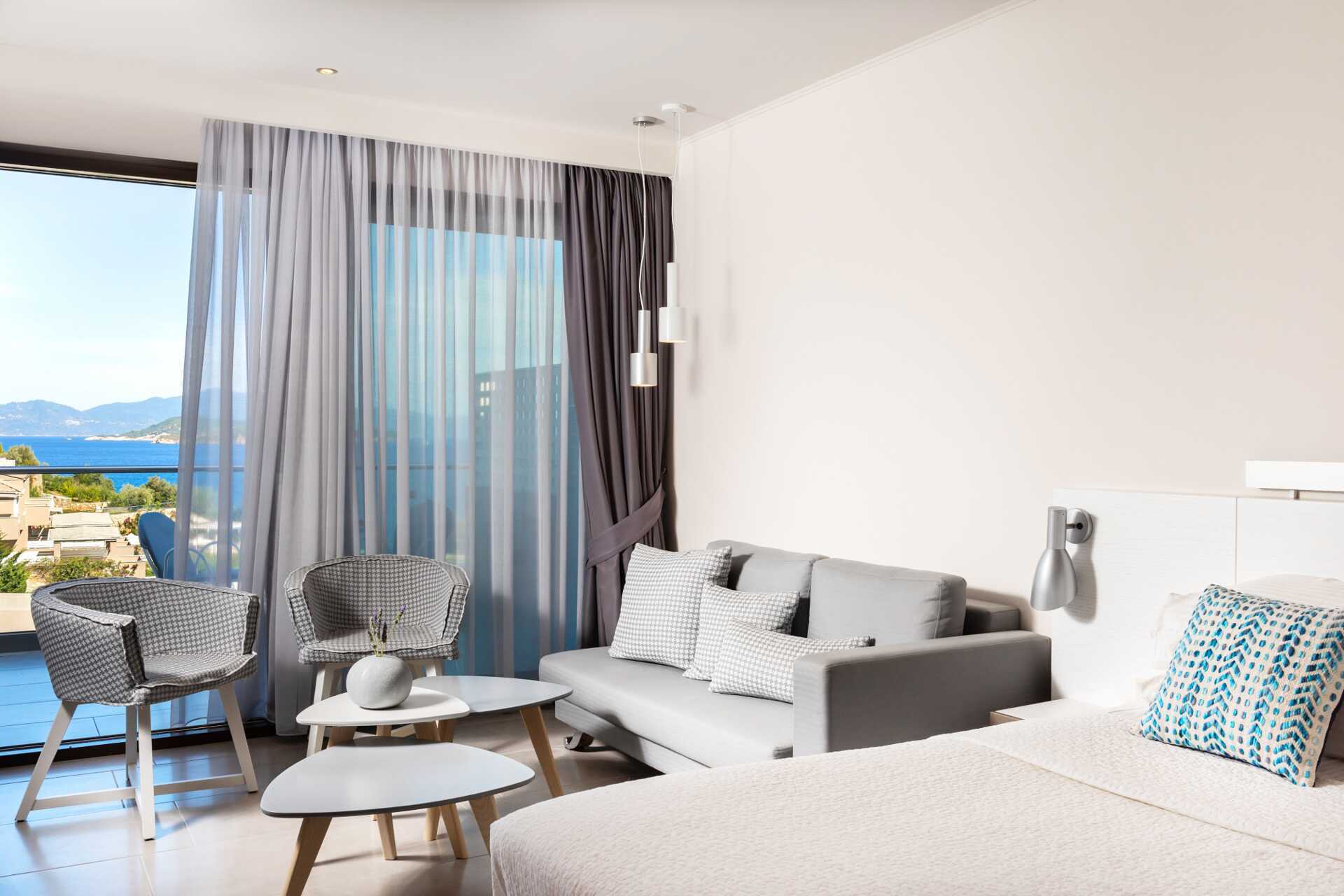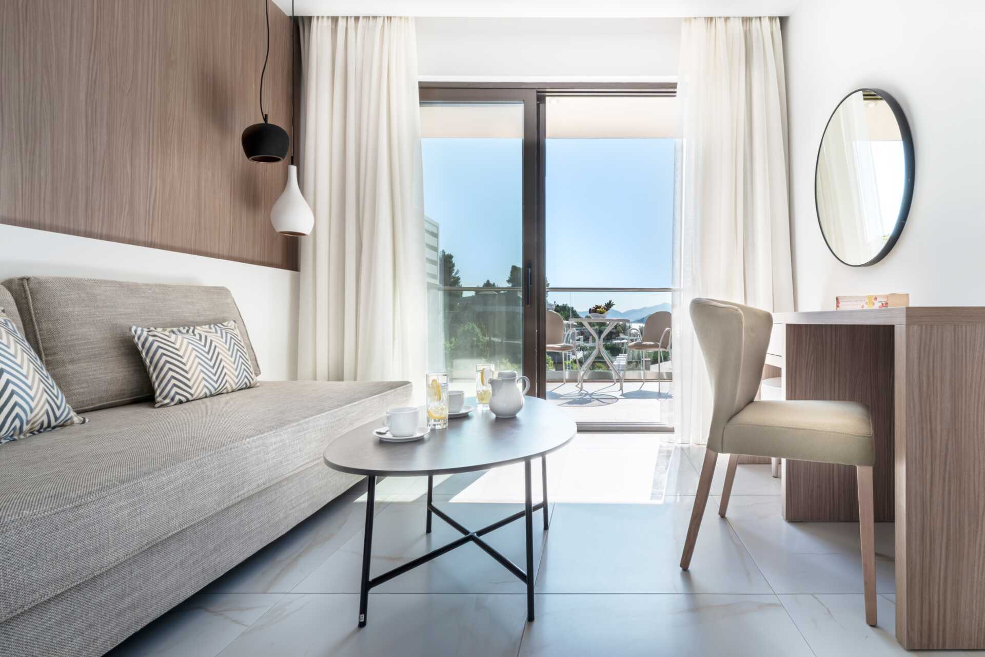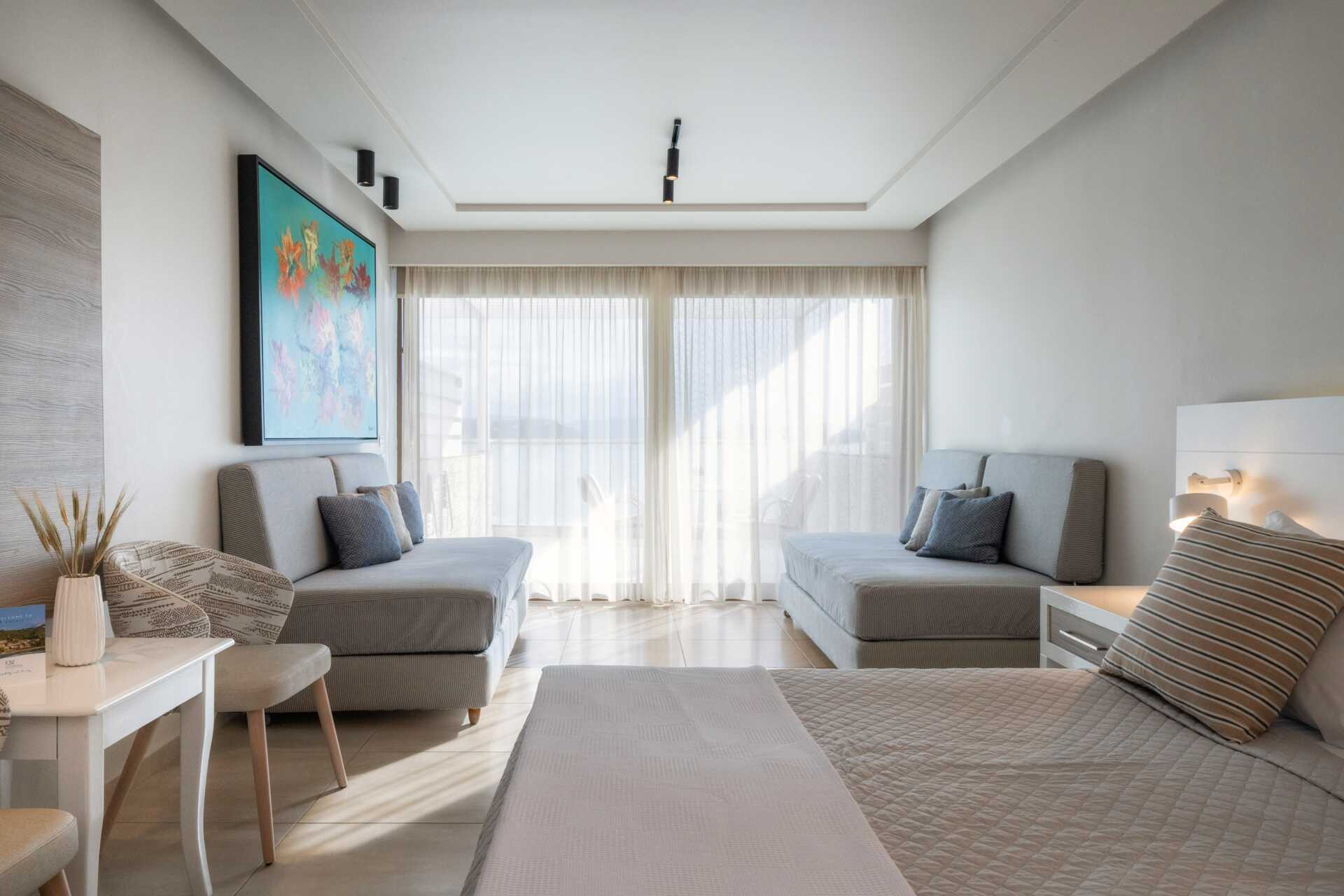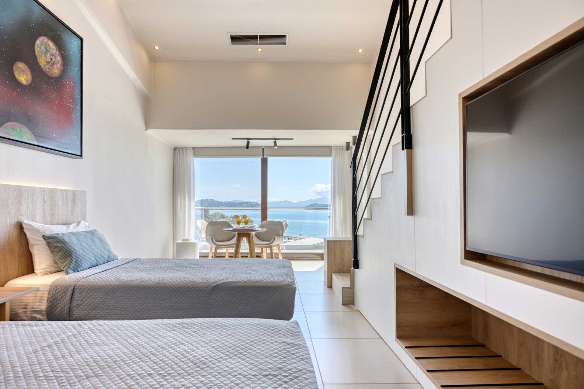 Dobbeltværelse, renoveret i etage med balkon og havudsigt. I entréplan er der et opholdsrum med mulighed for ekstra senge i en sovesofa samt et badeværelse med bruser og toilet. Ovenpå er der en dobbeltseng og et badeværelse med bruser og toilet. Gratis wifi, aircondition og deponering. Køleskab og el-kedel. Der er tv med internationale kanaler på begge etager. Hårtørrer. Tøfler. Rengøring 7 gange om ugen. Børn under to år tæller med i det maksimale antal personer på værelset. Billederne er skitser og vil blive opdateret, så snart Apollo modtager rigtige billeder fra hotellet. Skitserne kan afvige fra virkeligheden.