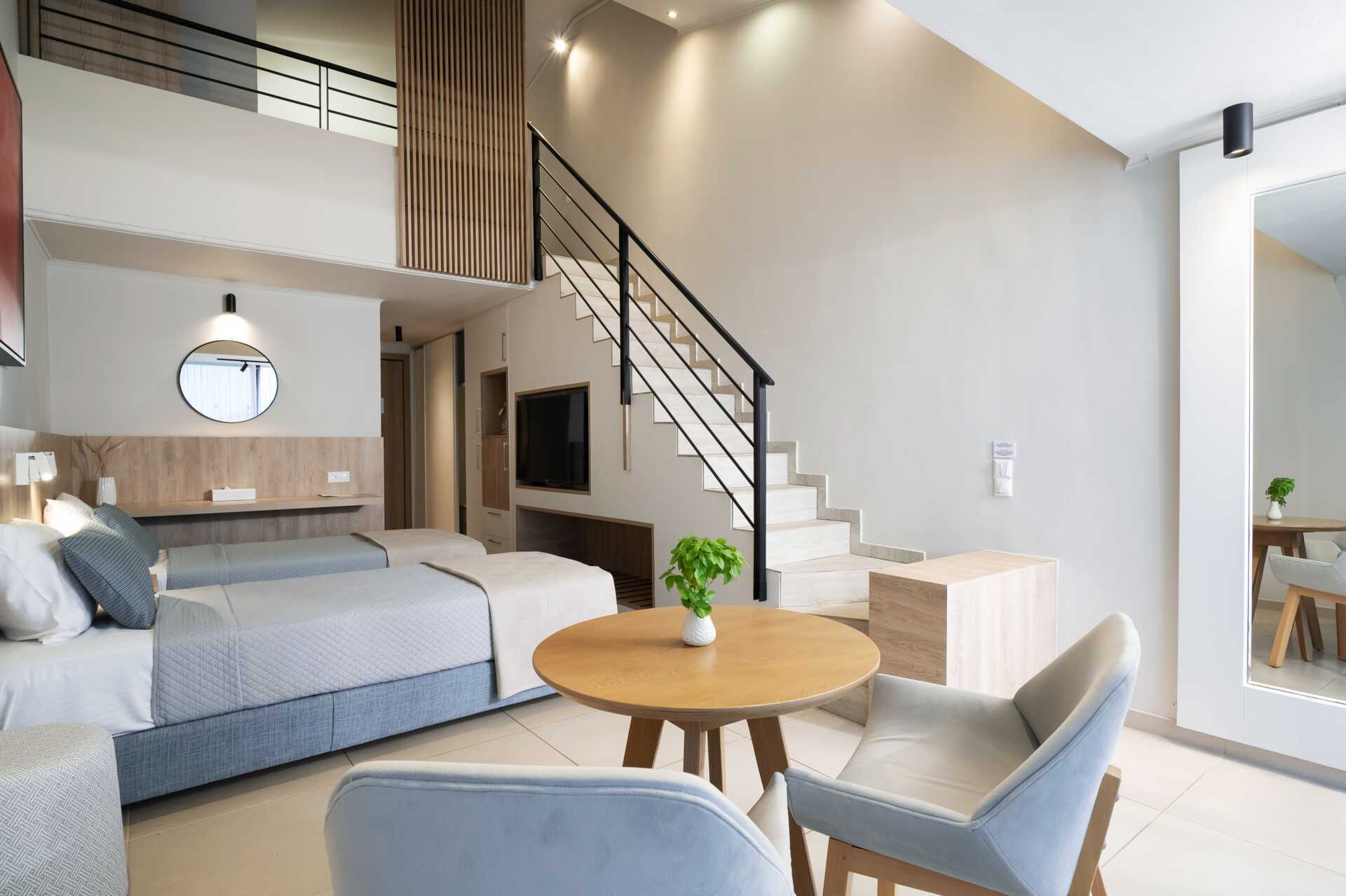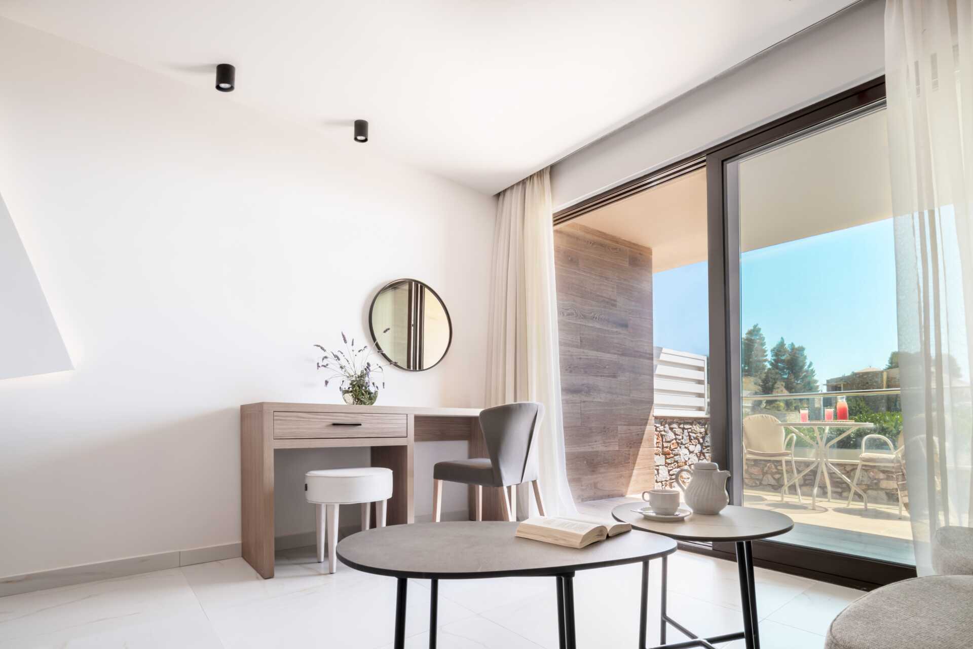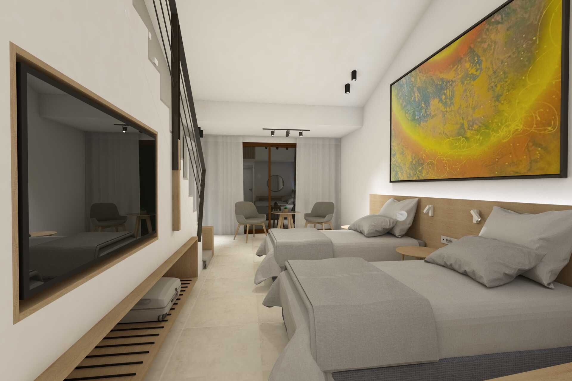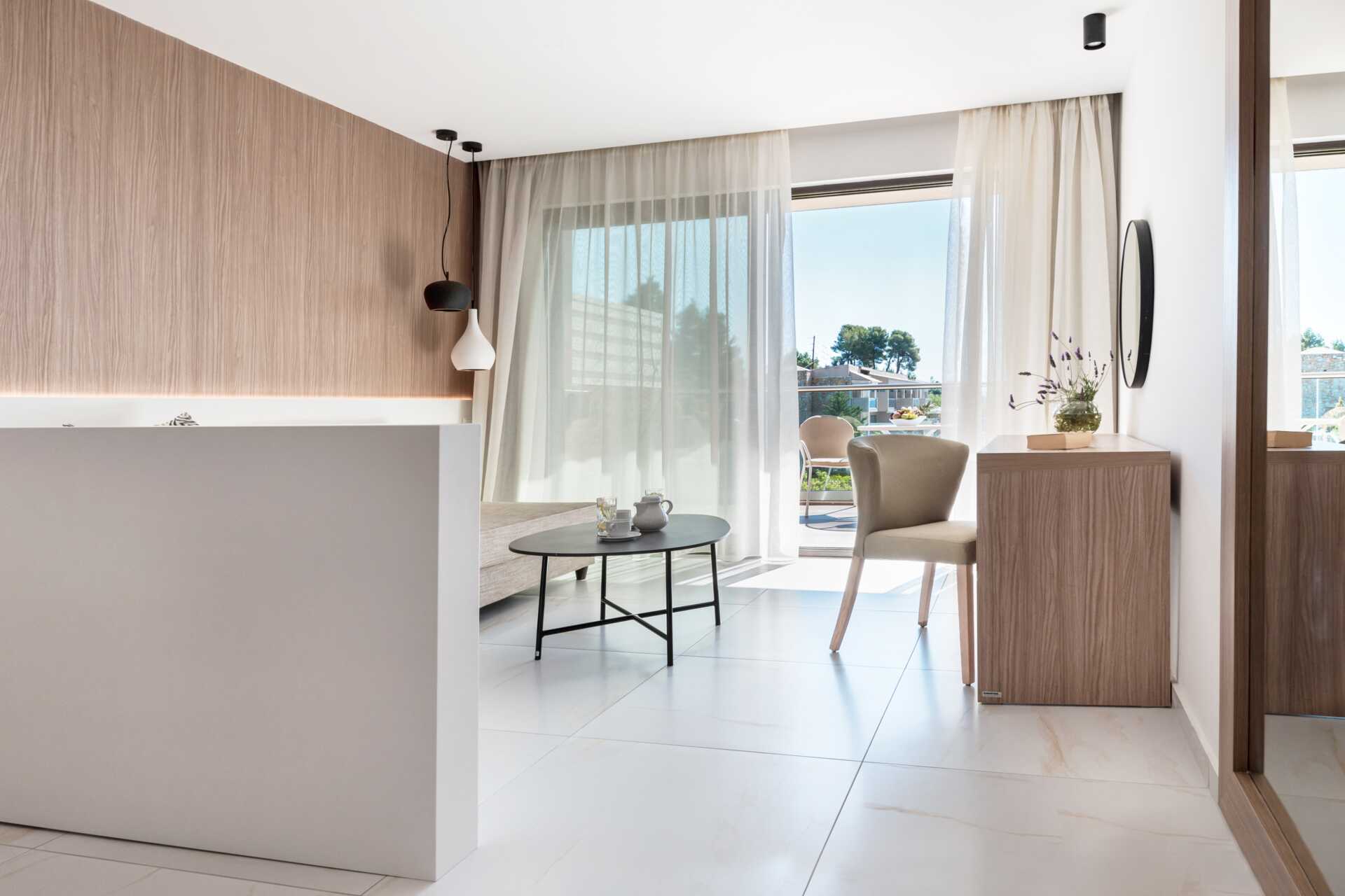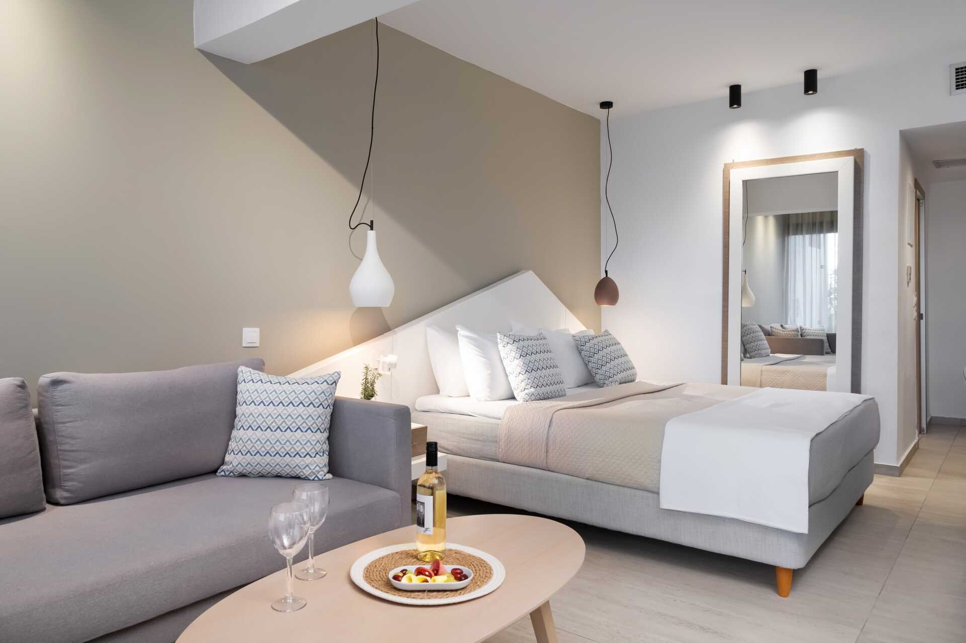 Dobbeltværelse, renoveret i etage med balkon og havudsigt. I entréplan er der et opholdsrum med mulighed for ekstra senge i en sovesofa samt et badeværelse med bruser og toilet. Ovenpå er der en dobbeltseng og et badeværelse med bruser og toilet. Gratis wifi, aircondition og deponering. Køleskab og el-kedel. Der er tv med internationale kanaler på begge etager. Hårtørrer. Tøfler. Rengøring 7 gange om ugen. Børn under to år tæller med i det maksimale antal personer på værelset. Billederne er skitser og vil blive opdateret, så snart Apollo modtager rigtige billeder fra hotellet. Skitserne kan afvige fra virkeligheden.