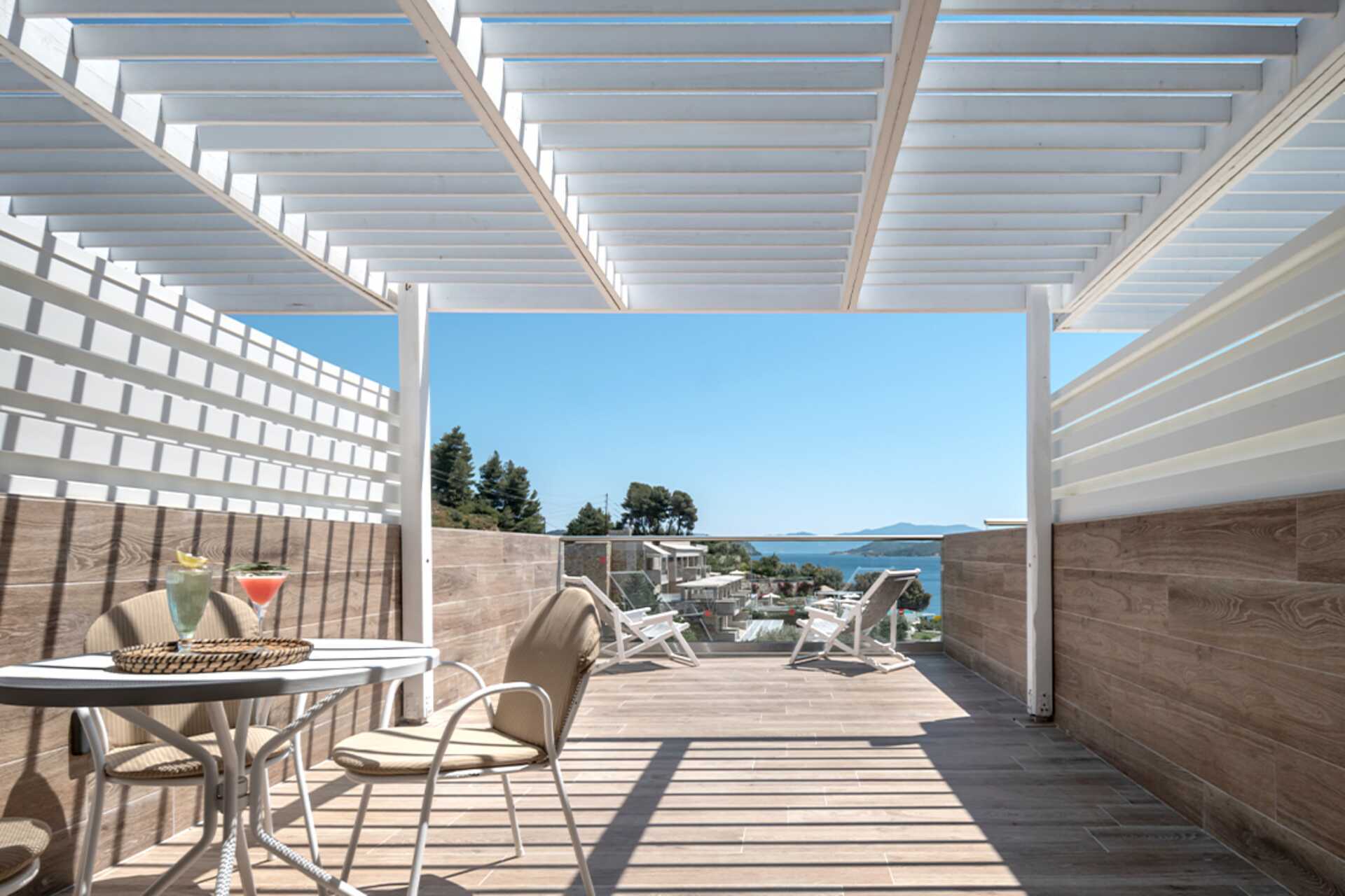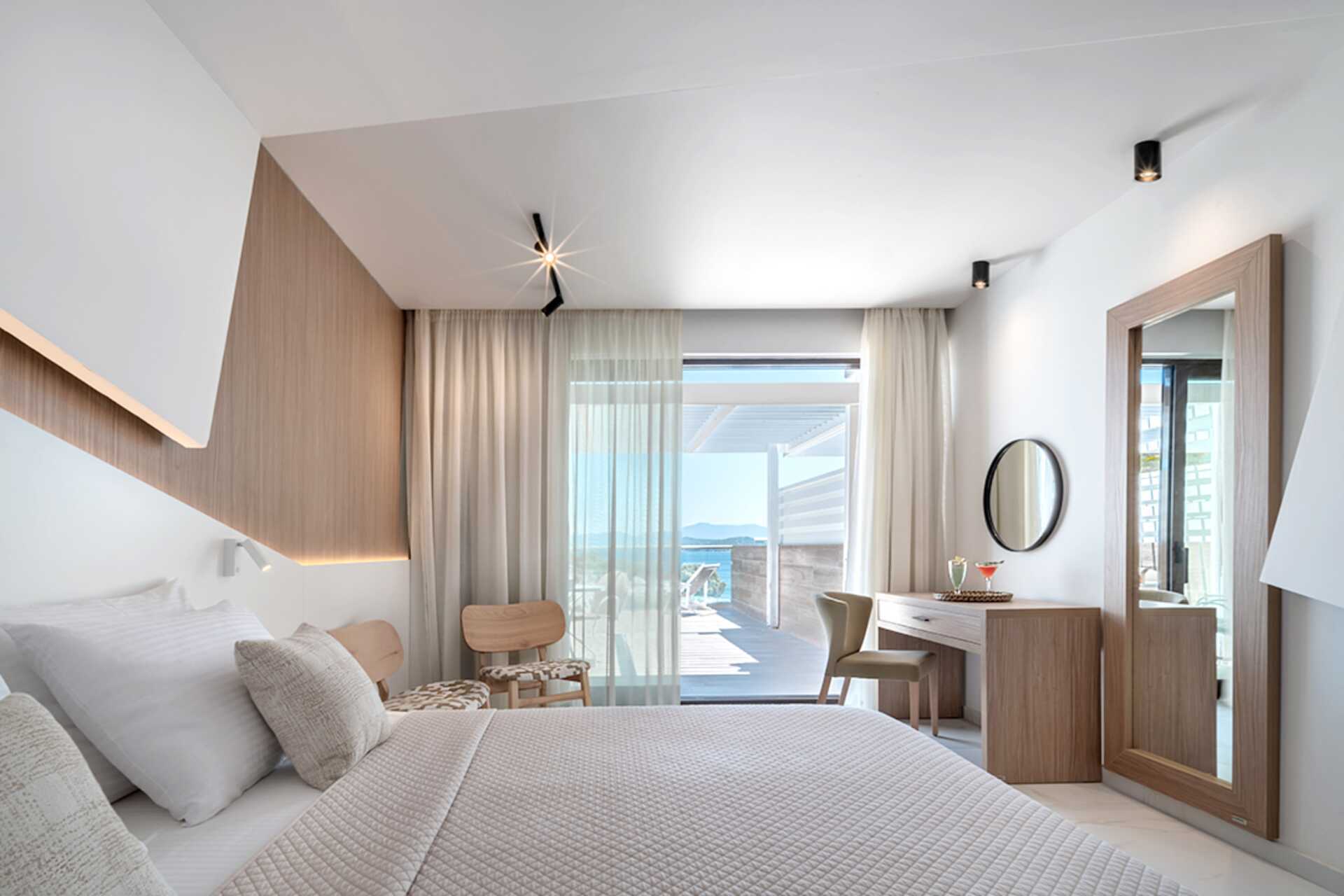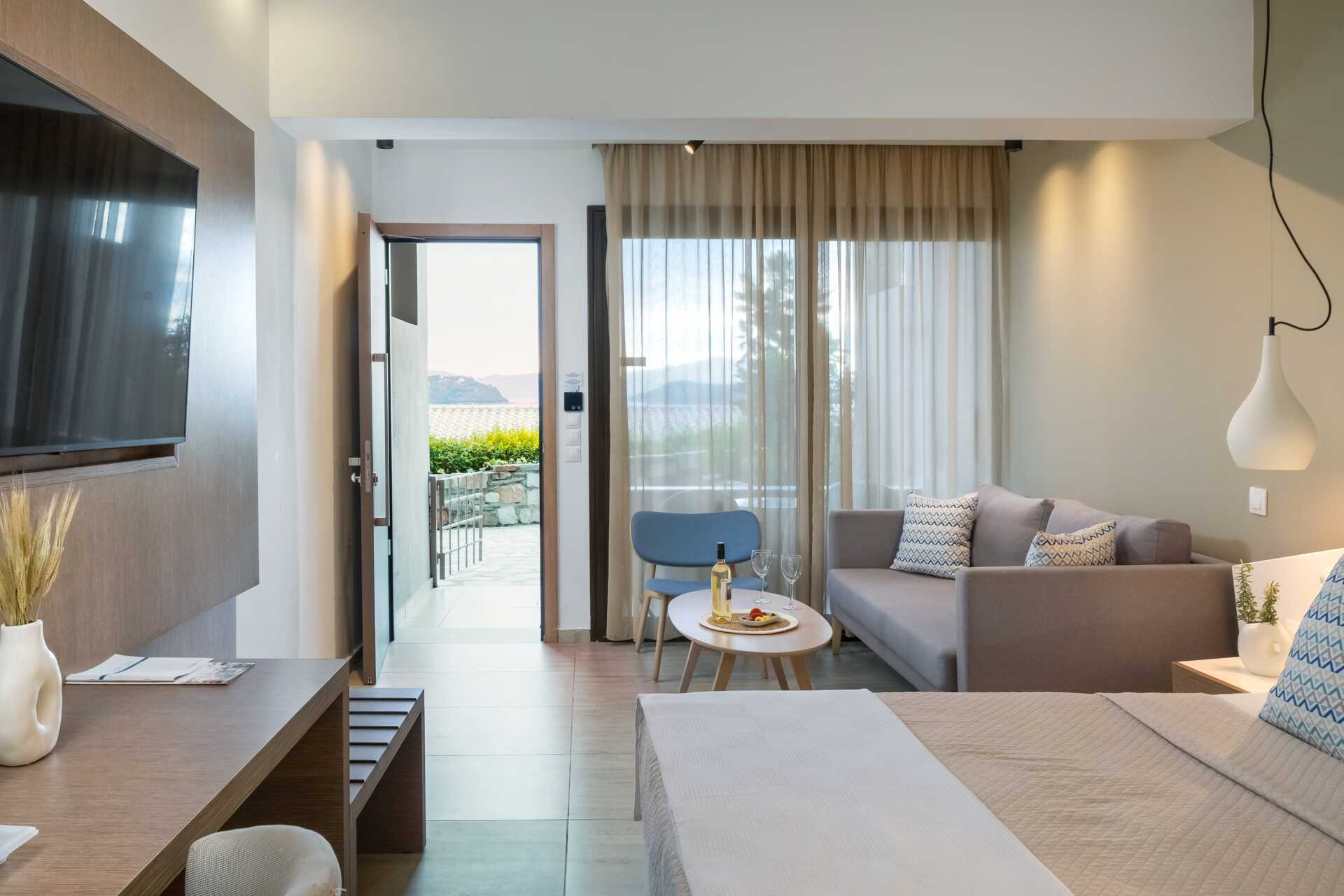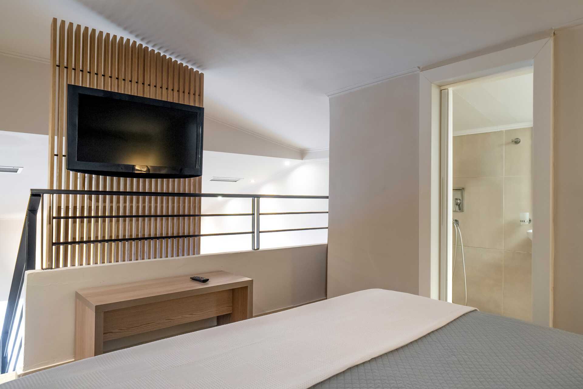 Dobbeltværelse, renoveret i etage med balkon og havudsigt. I entréplan er der et opholdsrum med mulighed for ekstra senge i en sovesofa samt et badeværelse med bruser og toilet. Ovenpå er der en dobbeltseng og et badeværelse med bruser og toilet. Gratis wifi, aircondition og deponering. Køleskab og el-kedel. Der er tv med internationale kanaler på begge etager. Hårtørrer. Tøfler. Rengøring 7 gange om ugen. Børn under to år tæller med i det maksimale antal personer på værelset. Billederne er skitser og vil blive opdateret, så snart Apollo modtager rigtige billeder fra hotellet. Skitserne kan afvige fra virkeligheden.