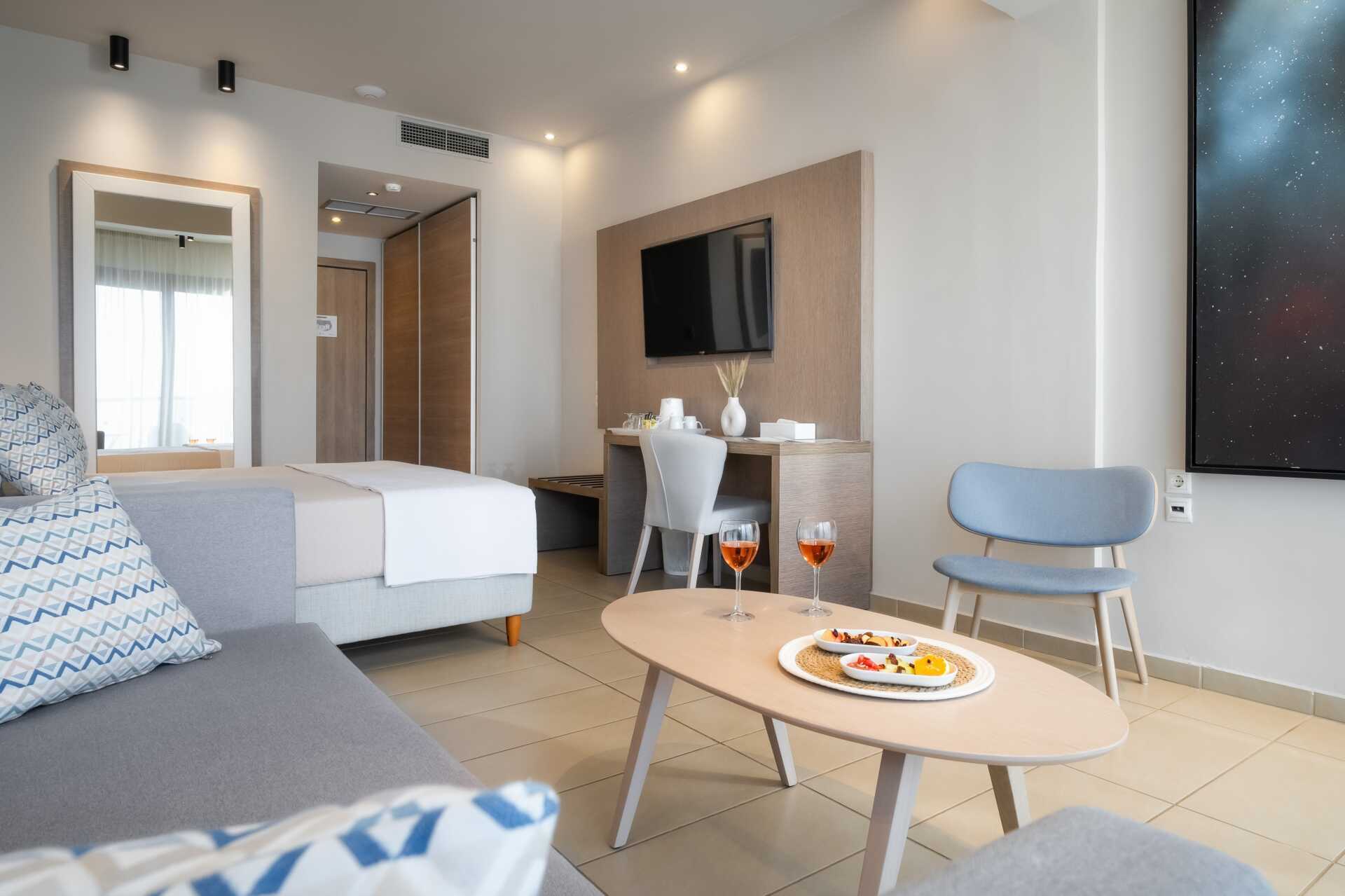 Familie-værelser med balkon og havudsigt. Familie-værelset består af to værelser og to badeværelser. Et soveværelse med dobbeltseng og et soveværelse med to enkeltsenge. Gratis wifi, aircondition og deponering. Køleskab og el-kedel. Tv med internationale kanaler. Hårtørrer. Tøfler. Badekåber og tøfler. Badeværelse med bruser og toilet. Rengøring 7 gange om ugen. Børn under to år tæller med i det maksimale antal personer på værelset.
