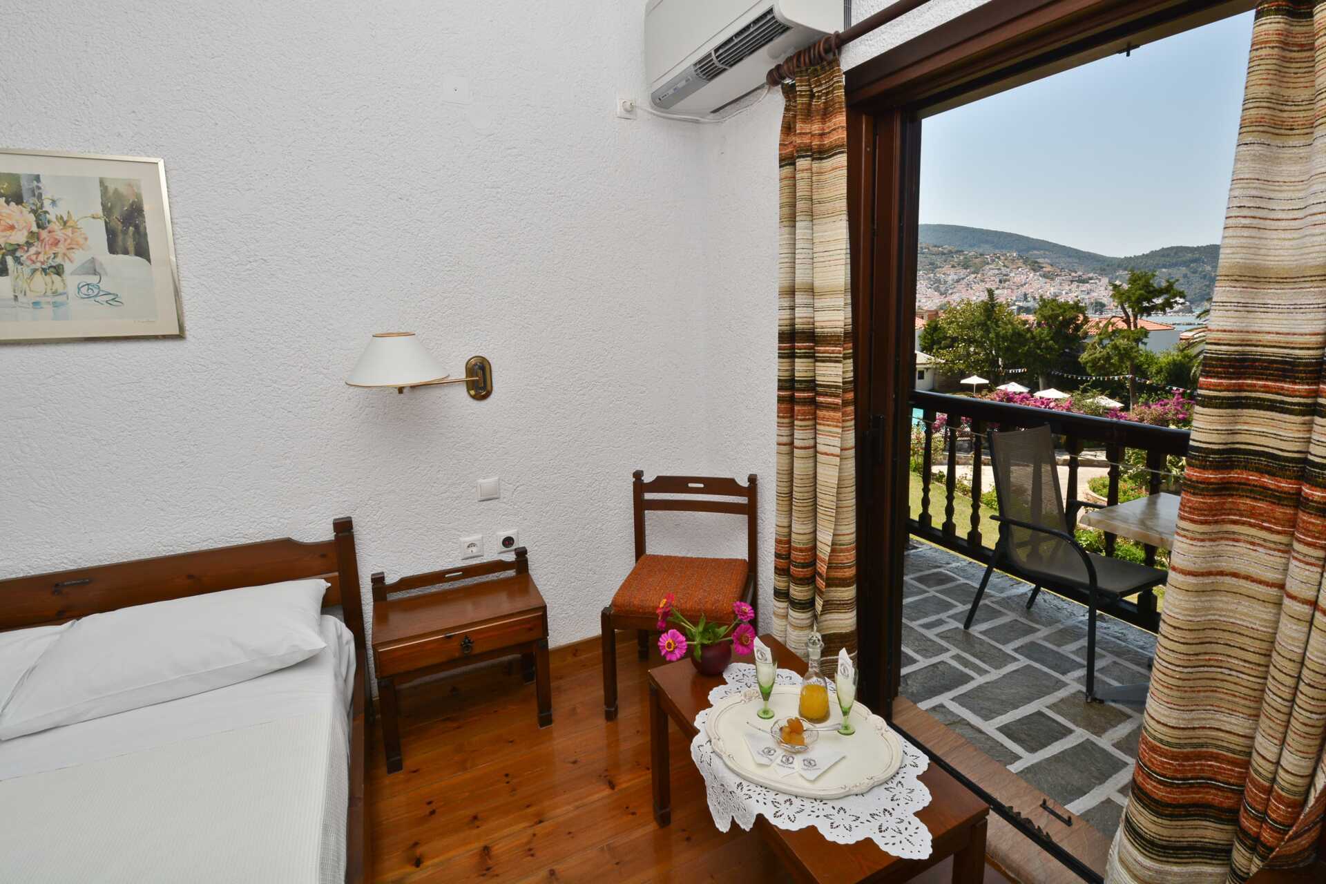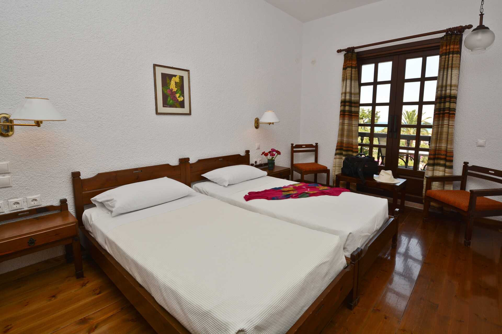 Dobbeltværelse med balkon eller terrasse og udsigt til haven. En dobbeltseng eller to enkeltsenge. Gratis wifi, aircondition og deponering. Hårtørrer. Badeværelse med badekar eller bruser samt toilet. Rengøring 7 gange om ugen.