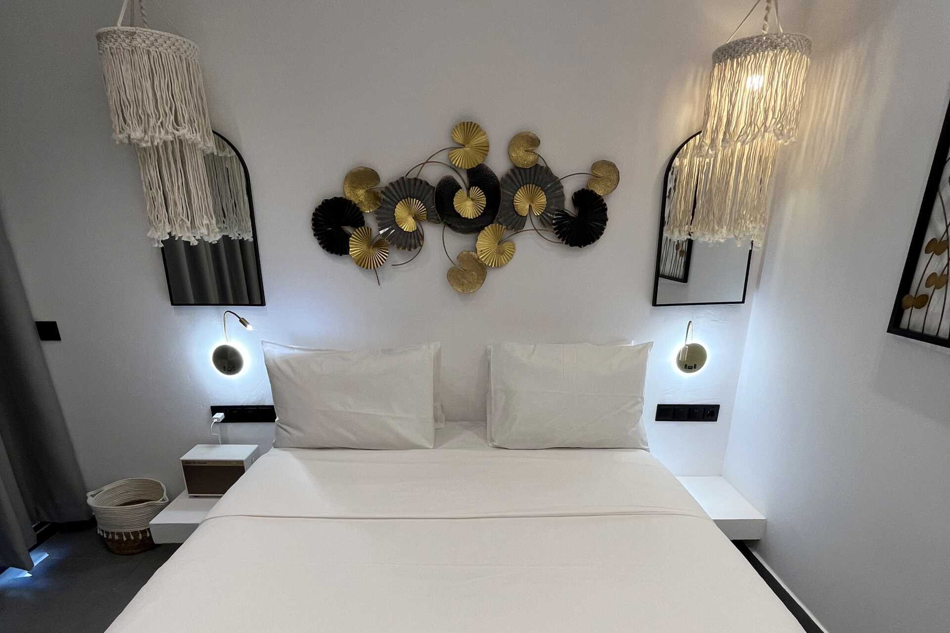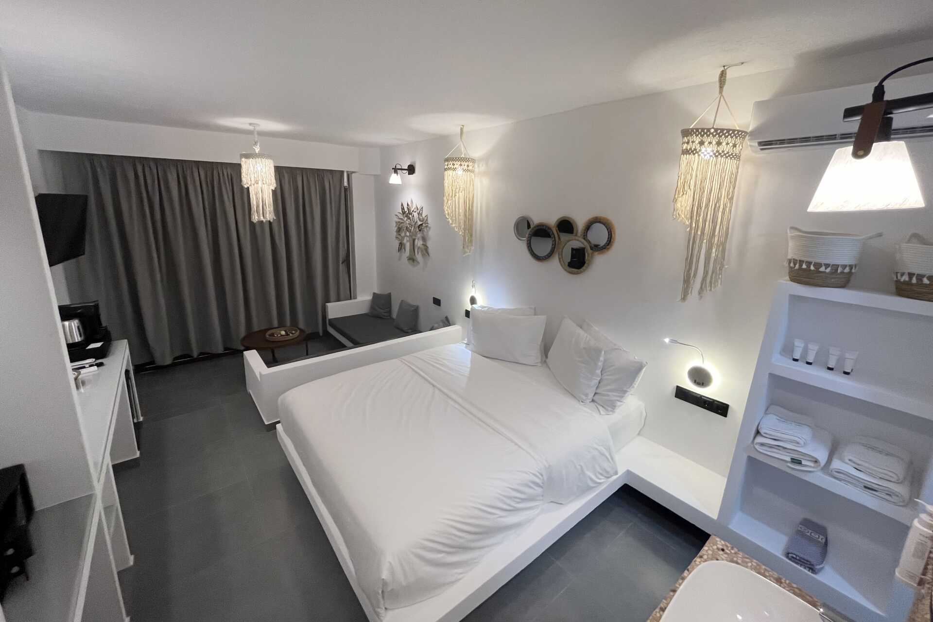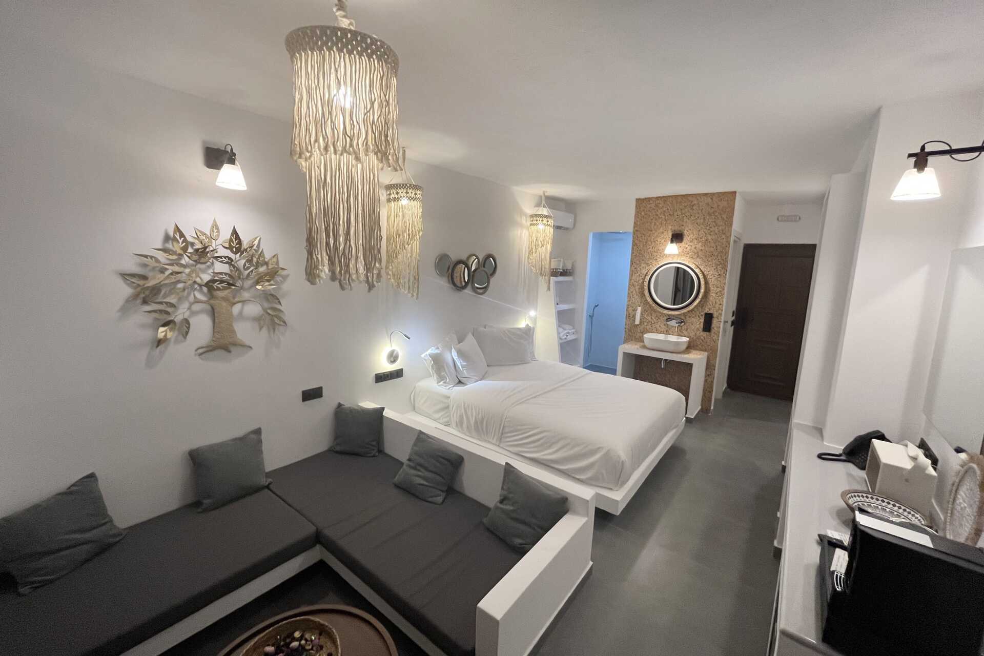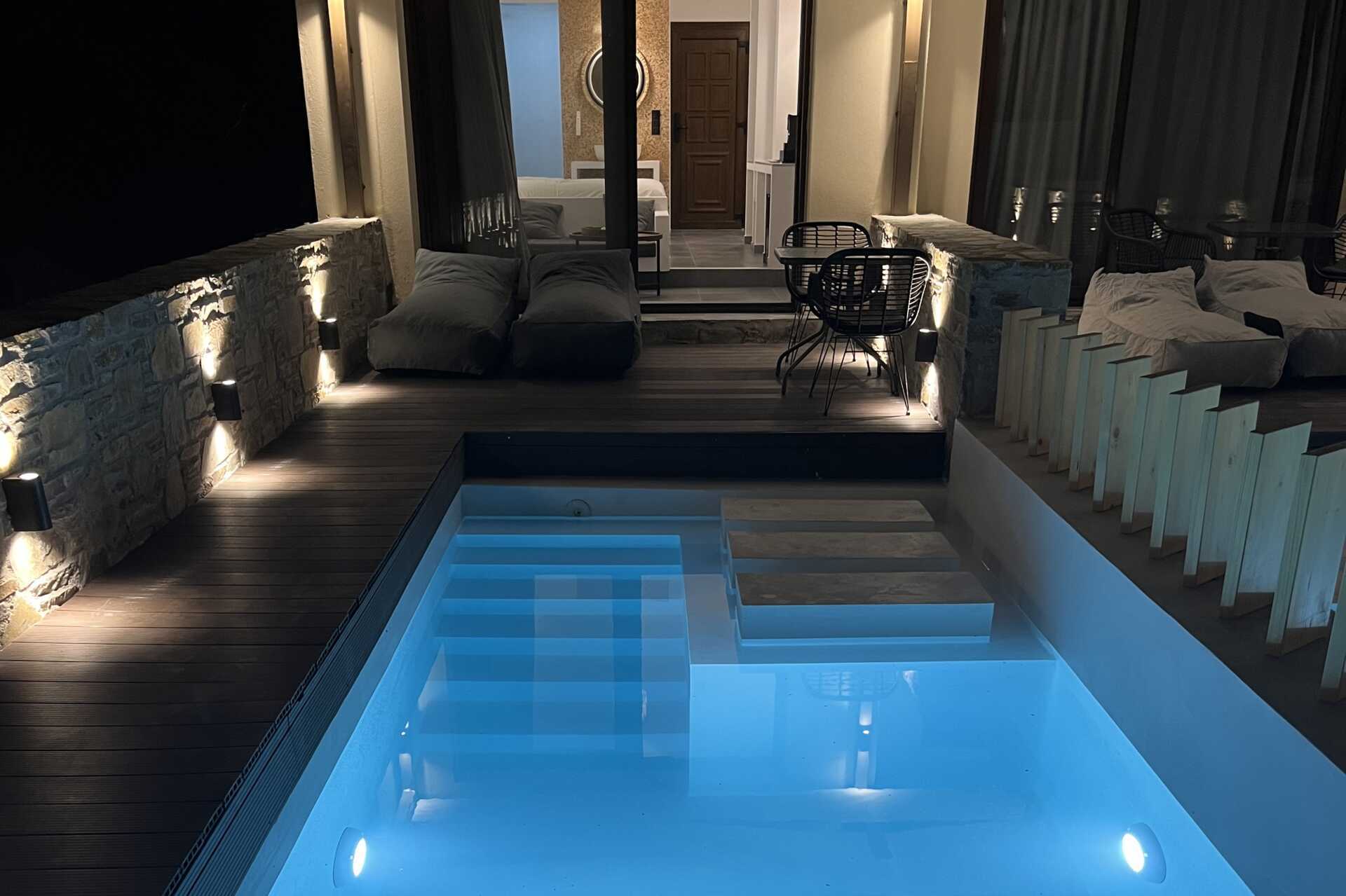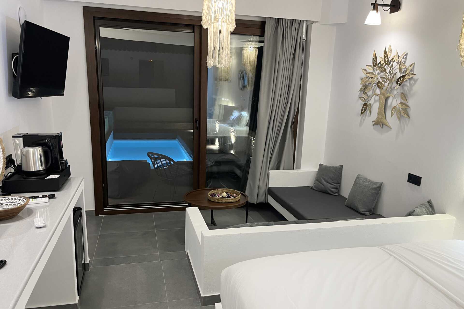 Junior-suite med privat pool på udepladsen. På udepladsen er der en slags større sækkestol. En dobbeltseng. Gratis wifi, aircondition og deponering. Køleskab. El-kedel og kaffe/te. Tv med lokale kanaler. Bluetooth-højttaler. Hårtørrer. Badeværelse med bruser og toilet. Rengøring 7 gange om ugen.