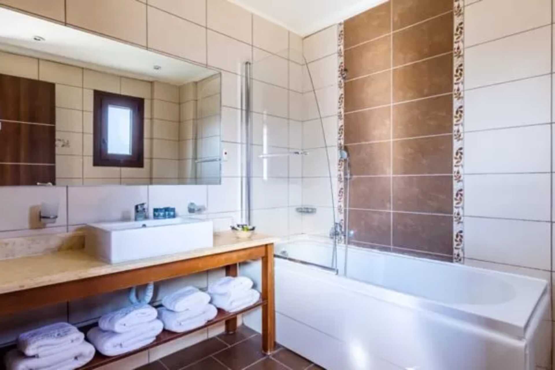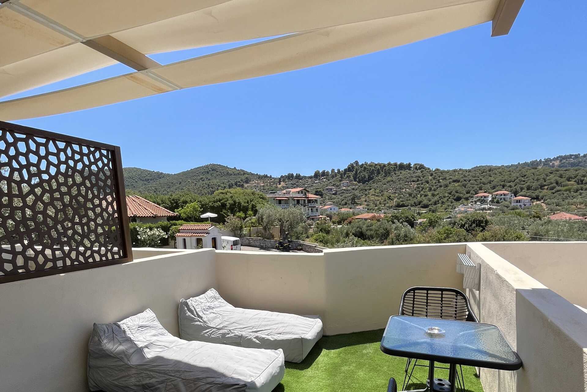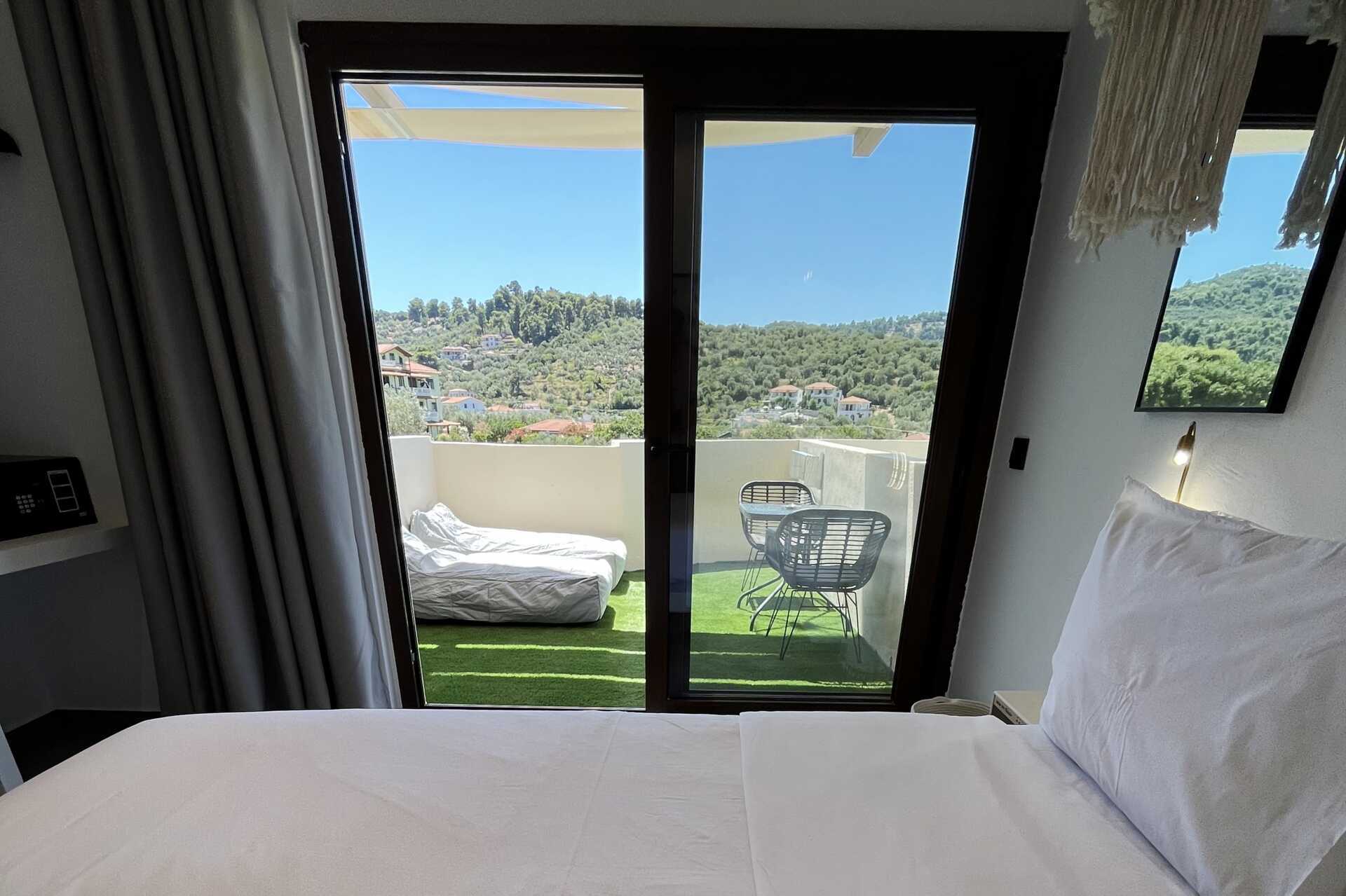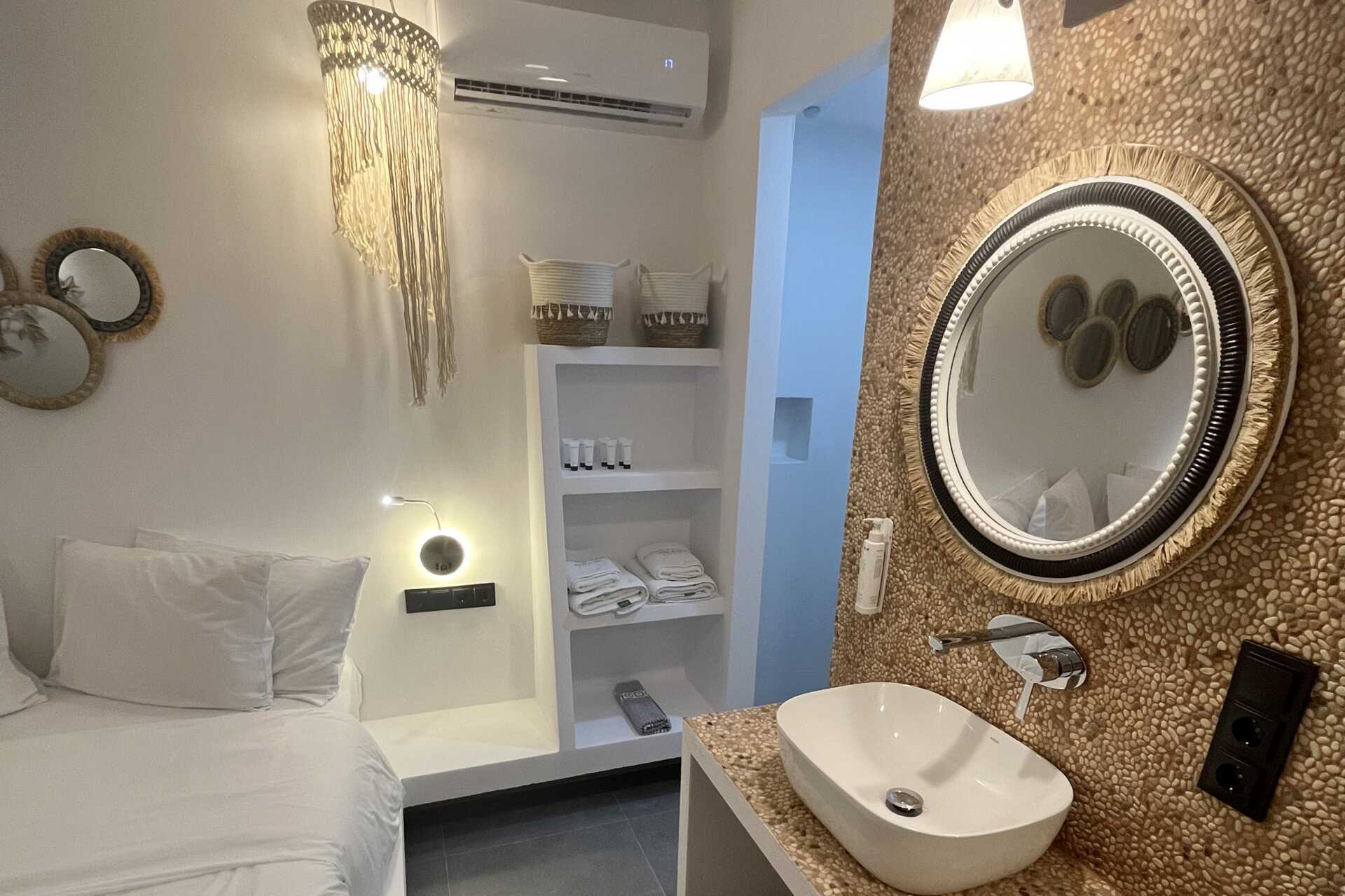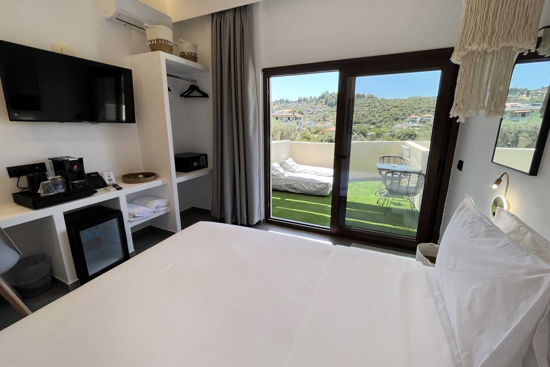 Junior-suite med privat pool på udepladsen. På udepladsen er der en slags større sækkestol. En dobbeltseng. Gratis wifi, aircondition og deponering. Køleskab. El-kedel og kaffe/te. Tv med lokale kanaler. Bluetooth-højttaler. Hårtørrer. Badeværelse med bruser og toilet. Rengøring 7 gange om ugen.