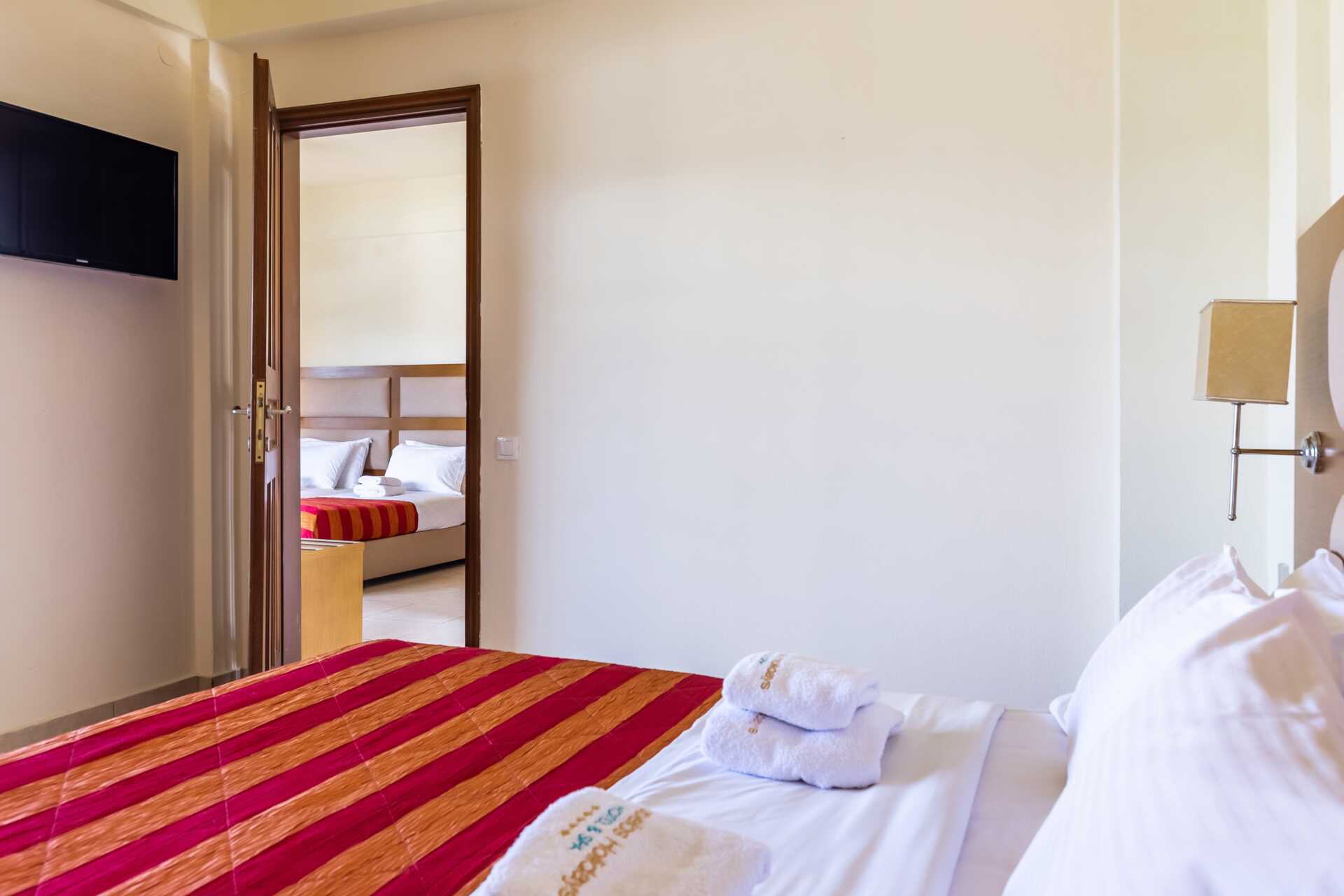 Familie-værelser med balkon eller terrasse. Familie-værelset består af to værelser, et med en dobbeltseng og et med to enkeltsenge. Gratis wifi, aircondition og deponering. Køleskab. Tv med lokale kanaler. Hårtørrer. Et eller to badeværelser med bruser eller badekar og toilet. Rengøring 7 gange om ugen.