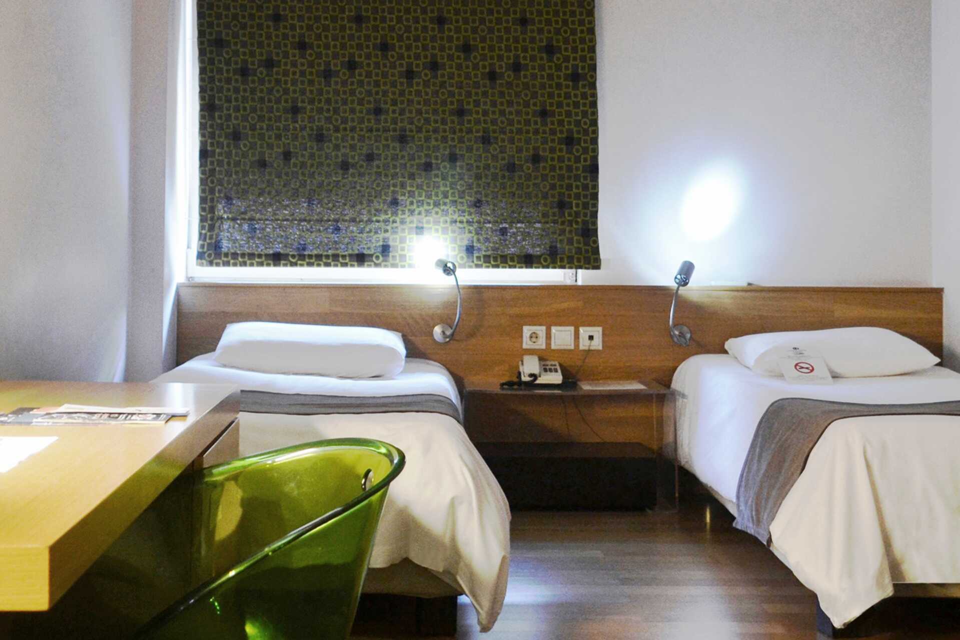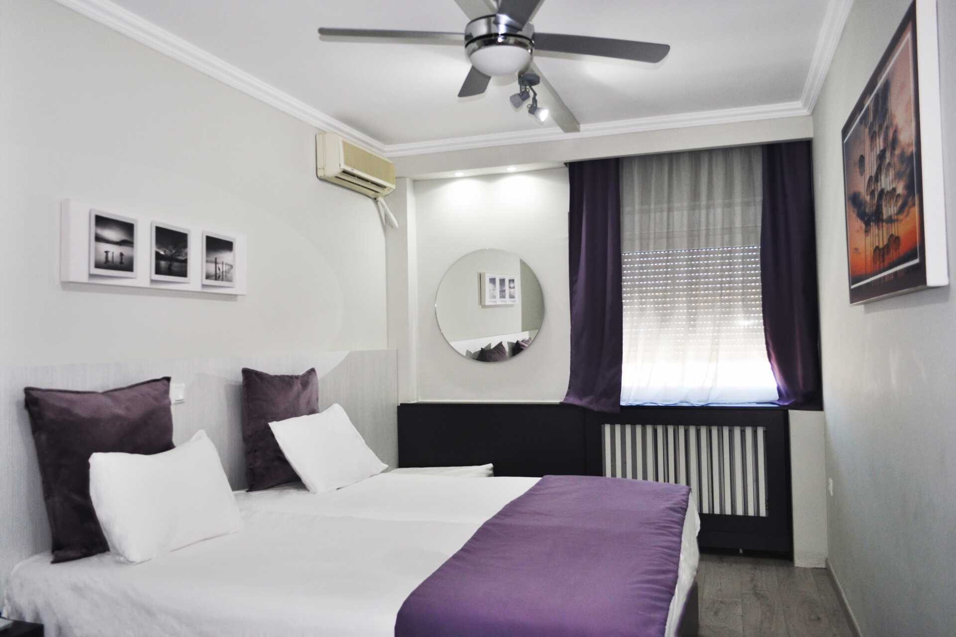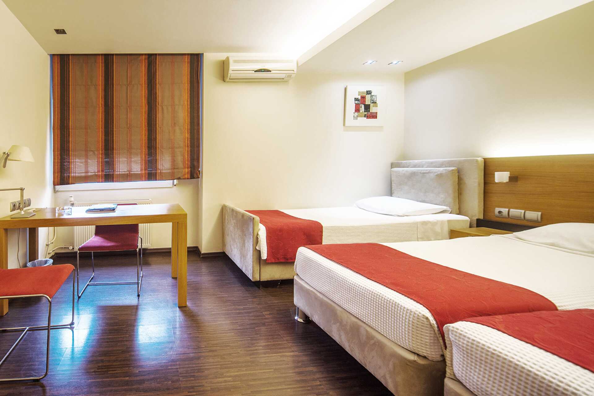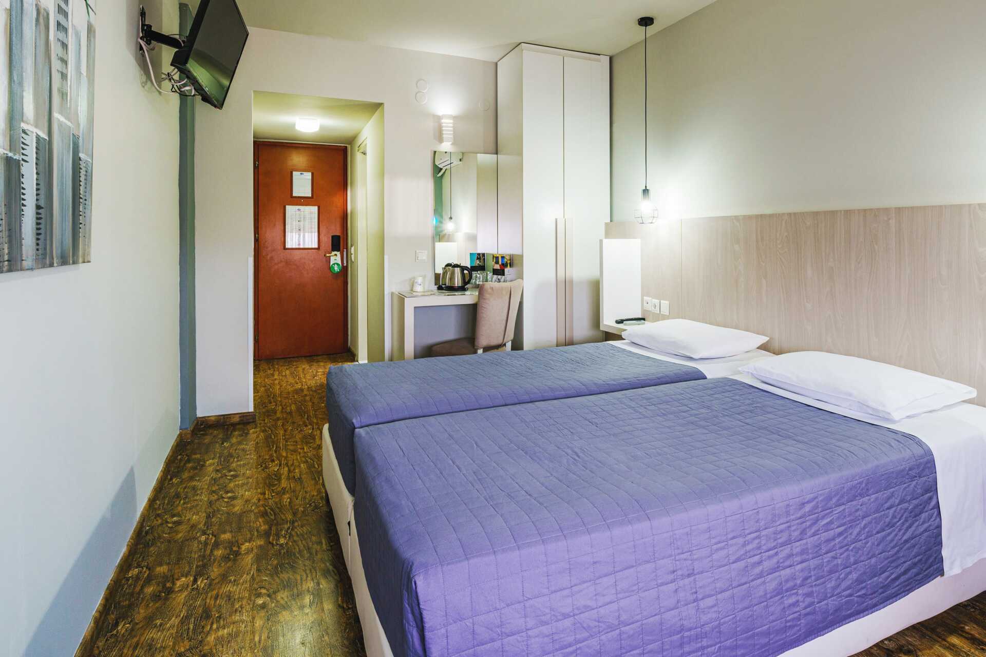 Dobbeltværelser uden udeplads. En dobbeltseng eller to enkeltsenge. Mulighed for ekstra opredning i sovesofa. Gratis wifi, aircondition og deponering. Køleskab. El-kedel og kaffe/te. Tv med internationale kanaler. Tøfler. Hårtørrer. Badeværelse med badekar eller bruser samt toilet. Rengøring 6 gange om ugen.