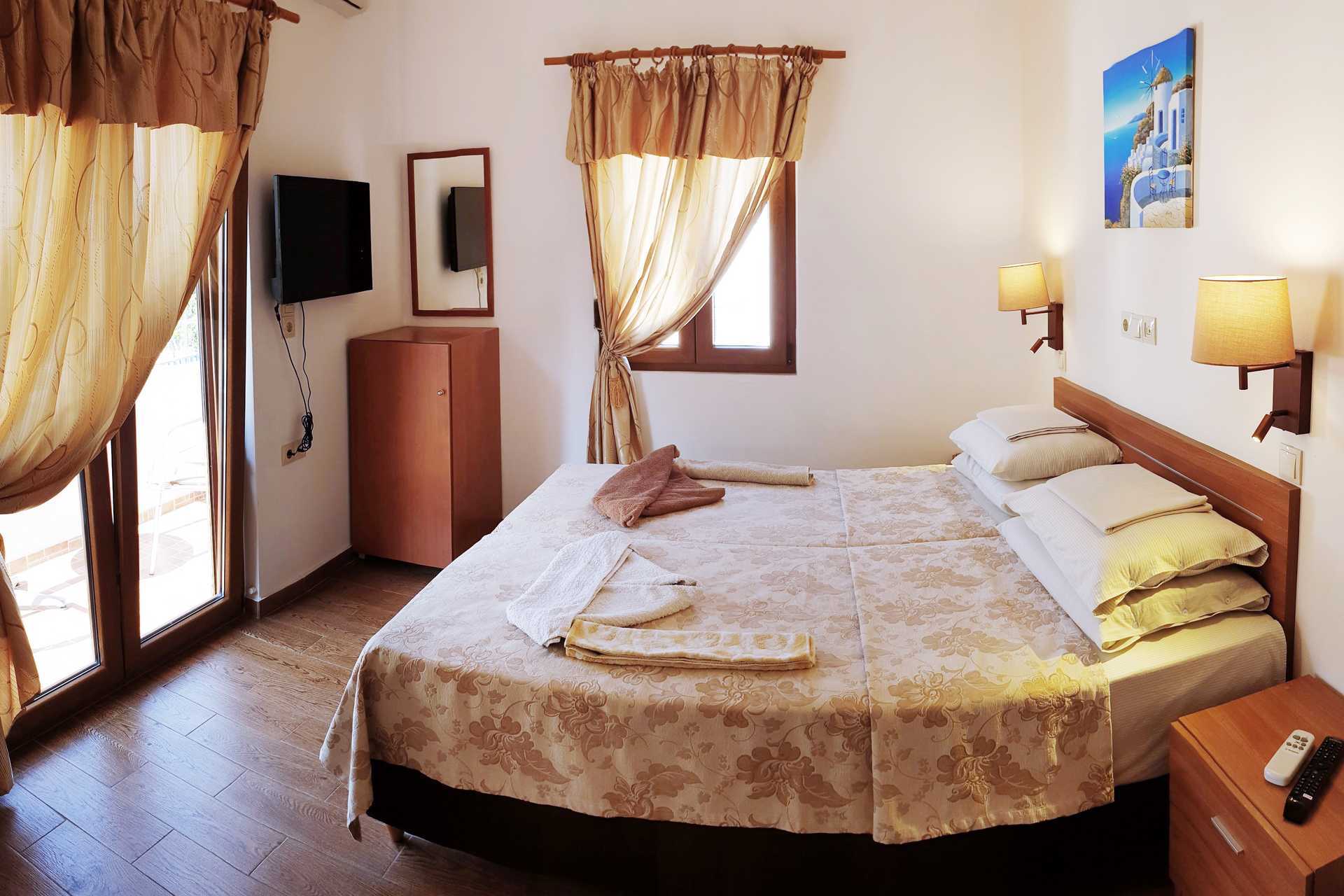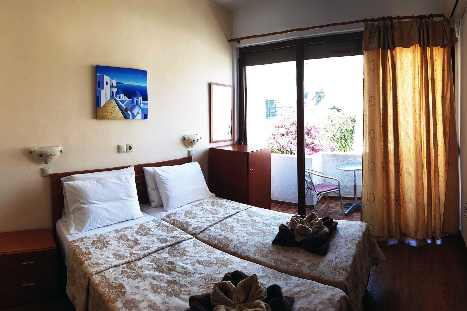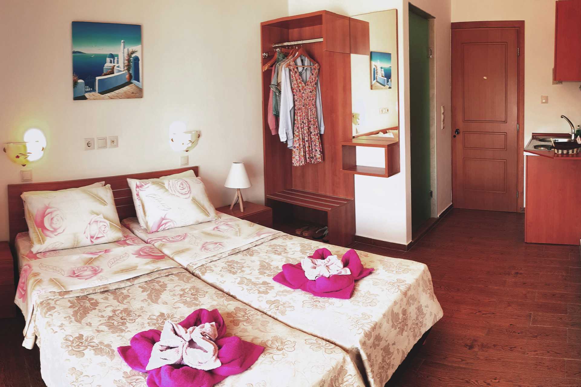1-værelses lejligheder med balkon eller terrasse. Soveværelse kombineret med minikøkken. To enkeltsenge. Minikøkken med kogeplader, køleskab, el-kedel og enkelt køkkenudstyr. Wifi, aircondition og deponering mod betaling. Badeværelse med bruser og toilet. Rengøring 6 gange om ugen. Ved ankomst kan drikkevarer købes i lejligheden.