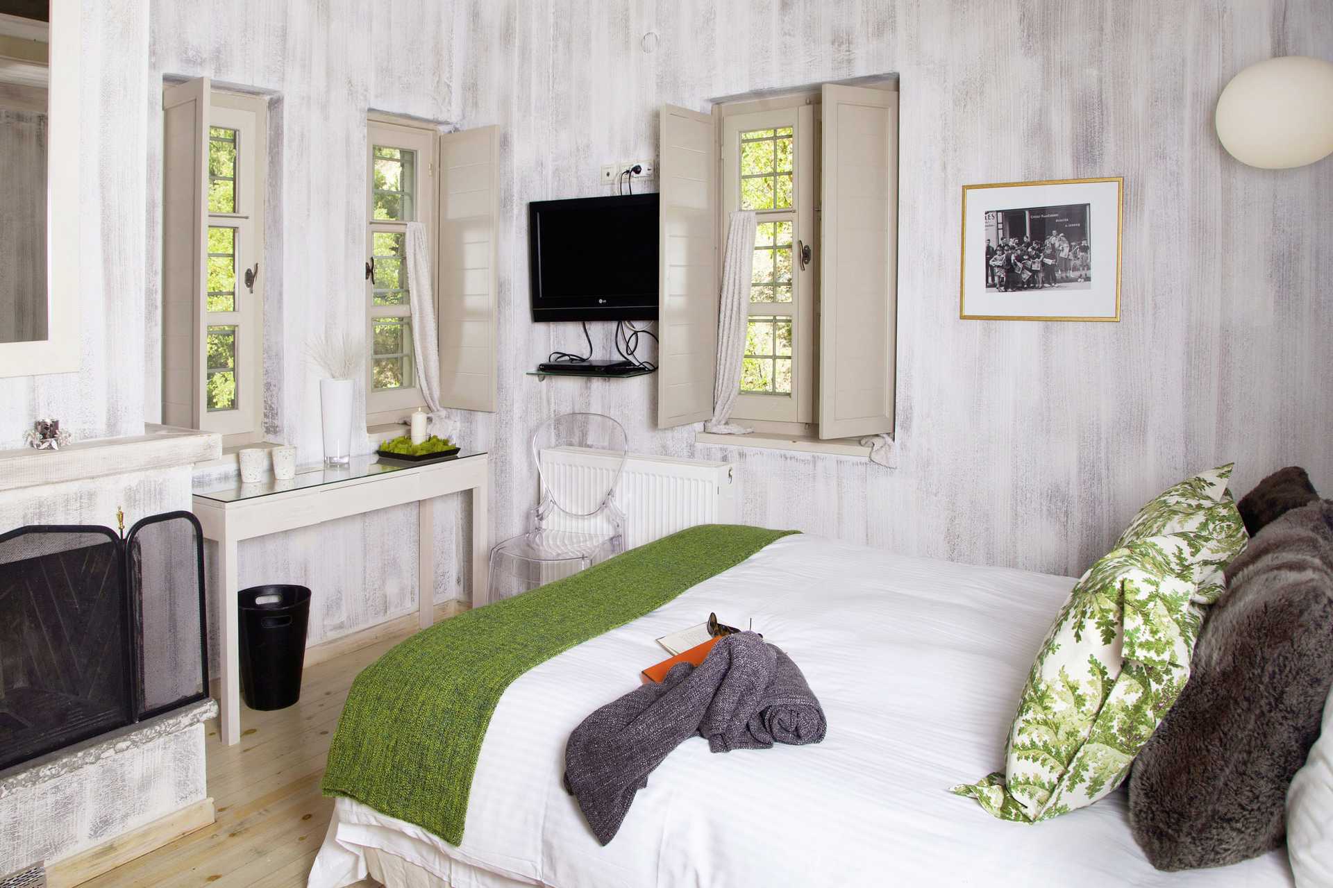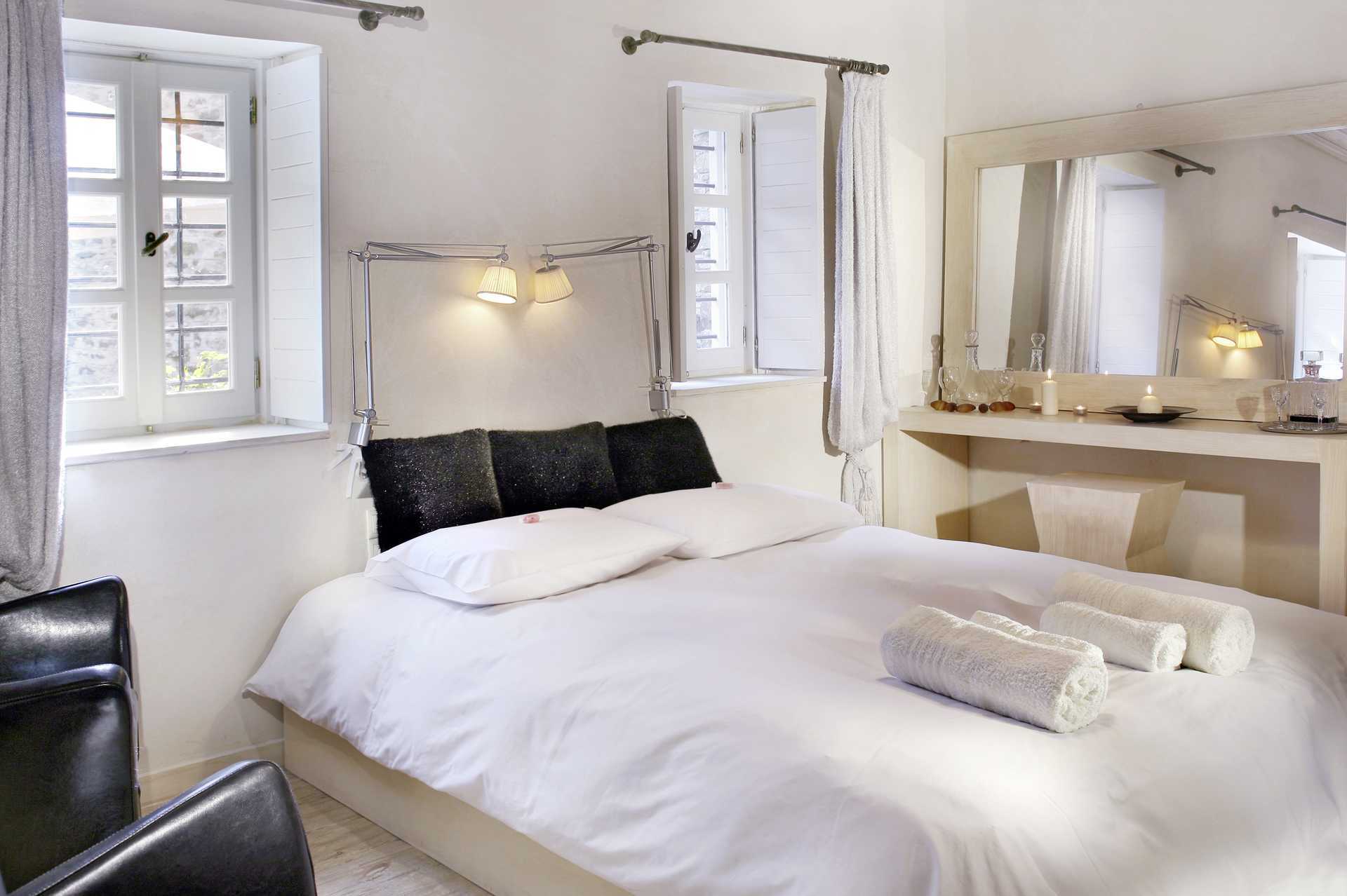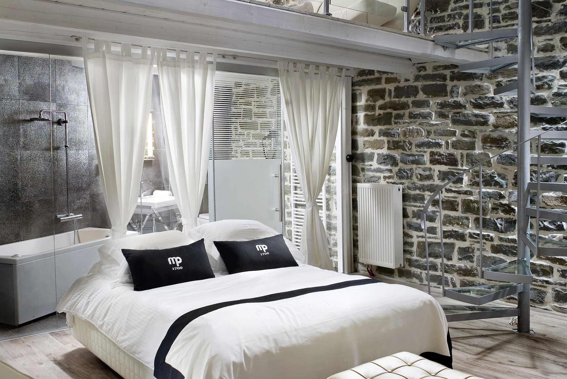 Junior-suite med deltr terrasse (en etage nede) i to etage. Åben planløsning til hems med en dobbeltseng. Nede i stueetagen er der en dobbeltseng, pejs, tv med internationale kanaler, køleskab, el-kedel og espressomaskine. Gratis wifi og deponering. Junior-suiten har ikke aircondition. Badekåber og tøfler. Hårtørrer. Badeværelse med jacuzzi, bruser og toilet. Rengøring 7 gange om ugen. Aldersgrænsen for at bo i en junior-suite er 12 år eller ældre.