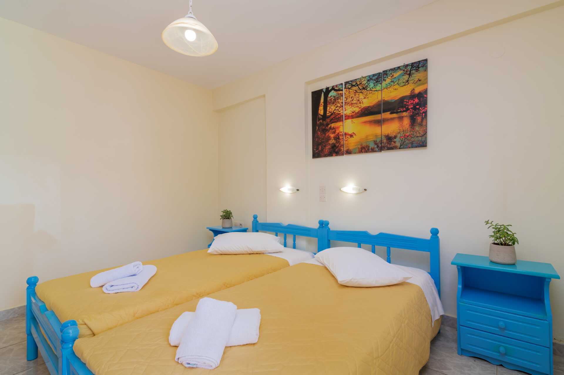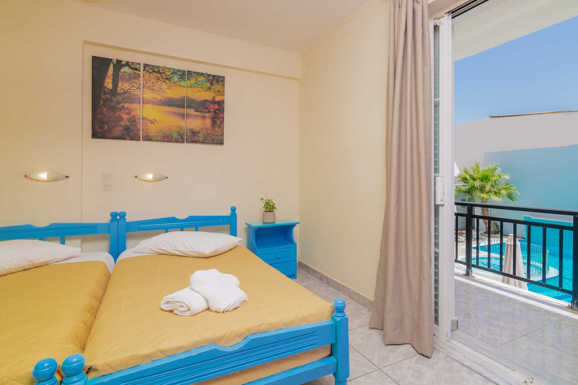 Dobbeltværelser med balkon eller terrasse i stueplan, nogle med pooludsigt. To enkeltsenge. Mulighed for ekstra opredning i enkeltseng. Gratis wifi og deponering. Aircondition mod betaling. Køleskab. Badeværelse med bruser og toilet. Rengøring 7 gange om ugen.