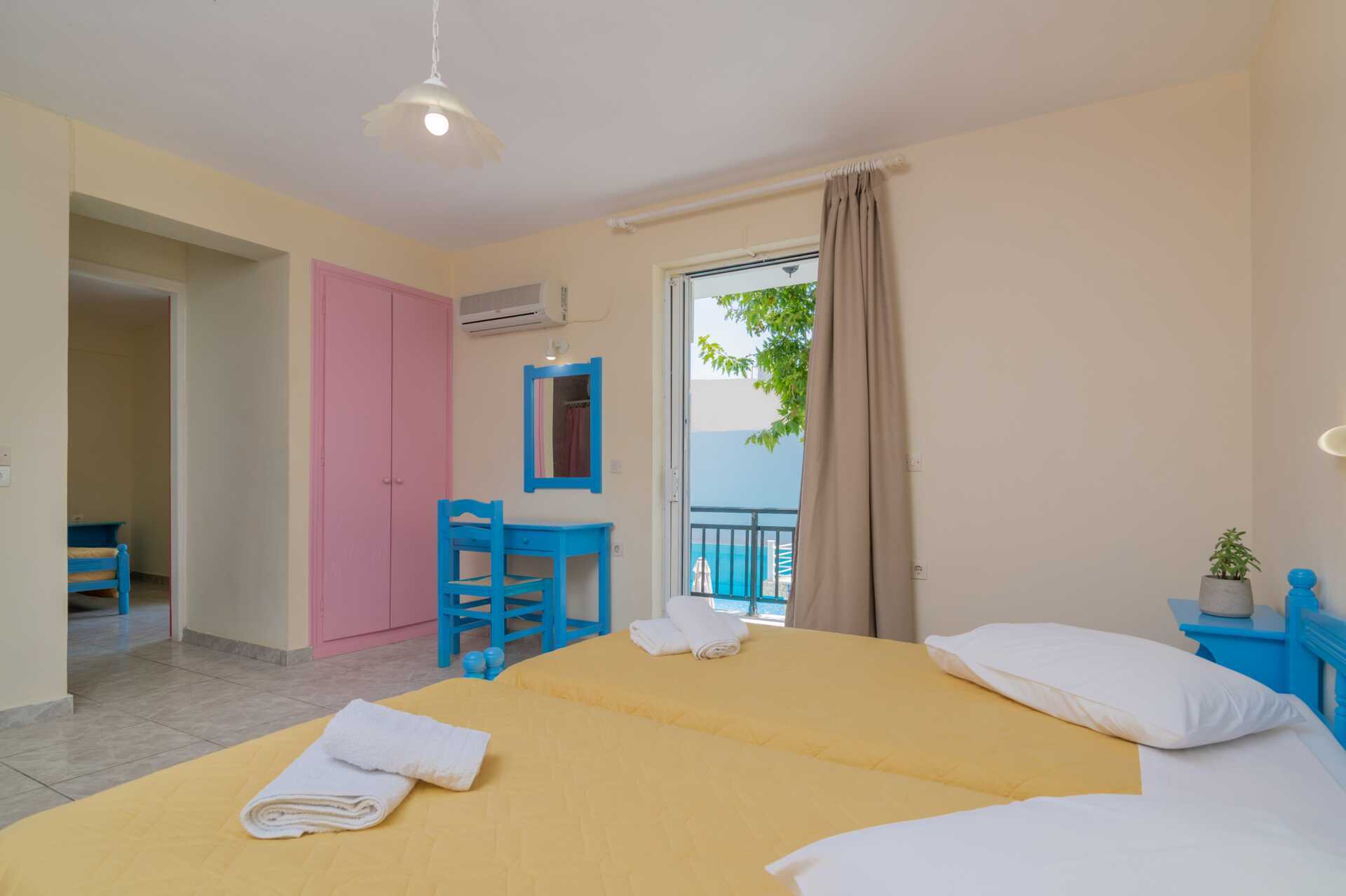 Familie-værelser med balkon eller balkon i stueplan. Familie-værelset består af to soveværelser med to enkeltsenge i hver. Gratis wifi og deponering. Aircondition mod betaling. Køleskab. Badeværelse med bruser og toilet. Rengøring 7 gange om ugen.